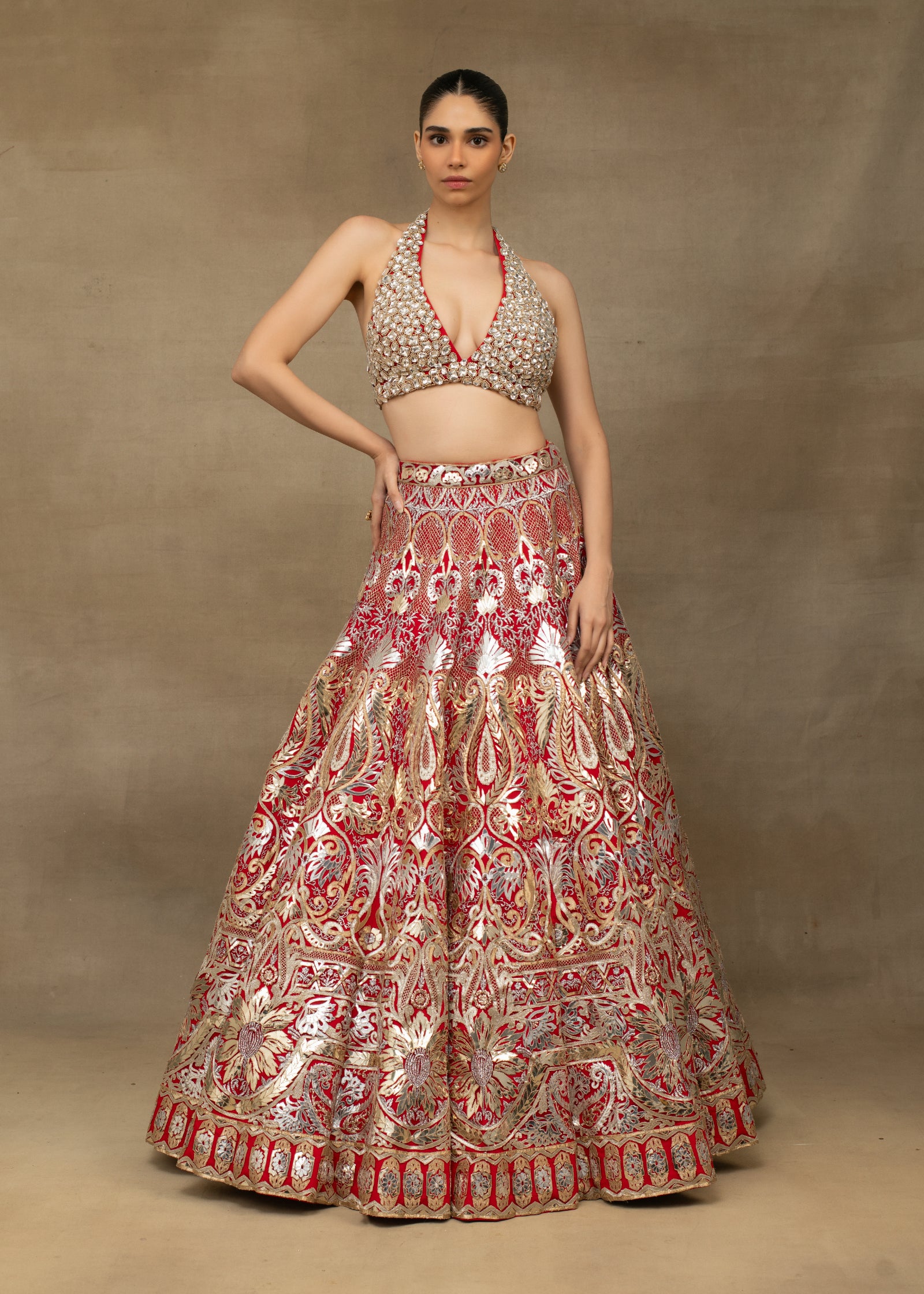 INR 435,000INR 435,000Sold outA vibrant red lehenga set featuring a voluminous skirt richly embroidered with intricate gold and silver paisley and floral patterns. The ensemble is completed by a...