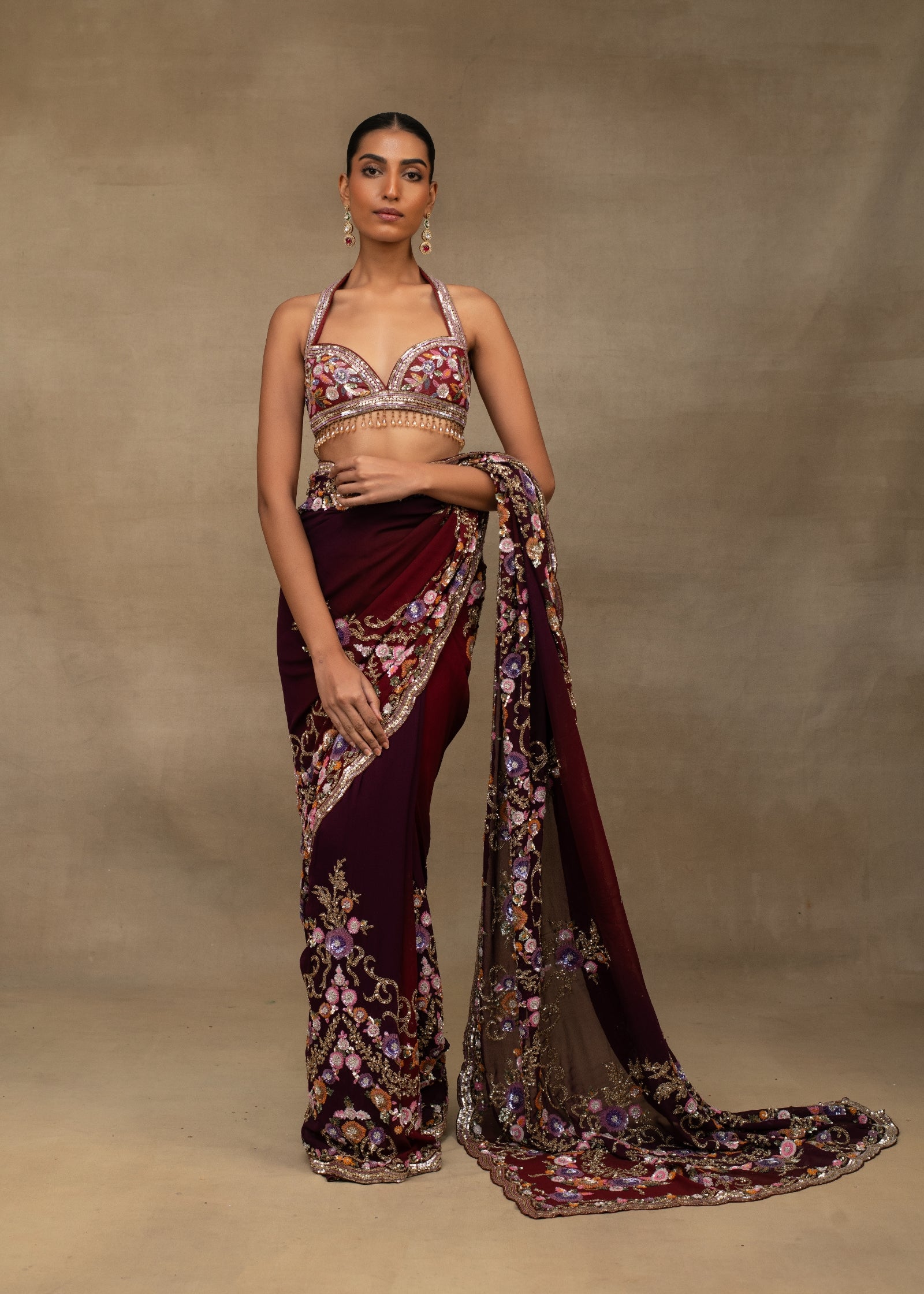 INR 195,000INR 195,000Sold outA striking plum to rust shaded saree adorned with vibrant floral embroidery in shades of pink, purple, and green, highlighted by shimmering sequins. It is paired...