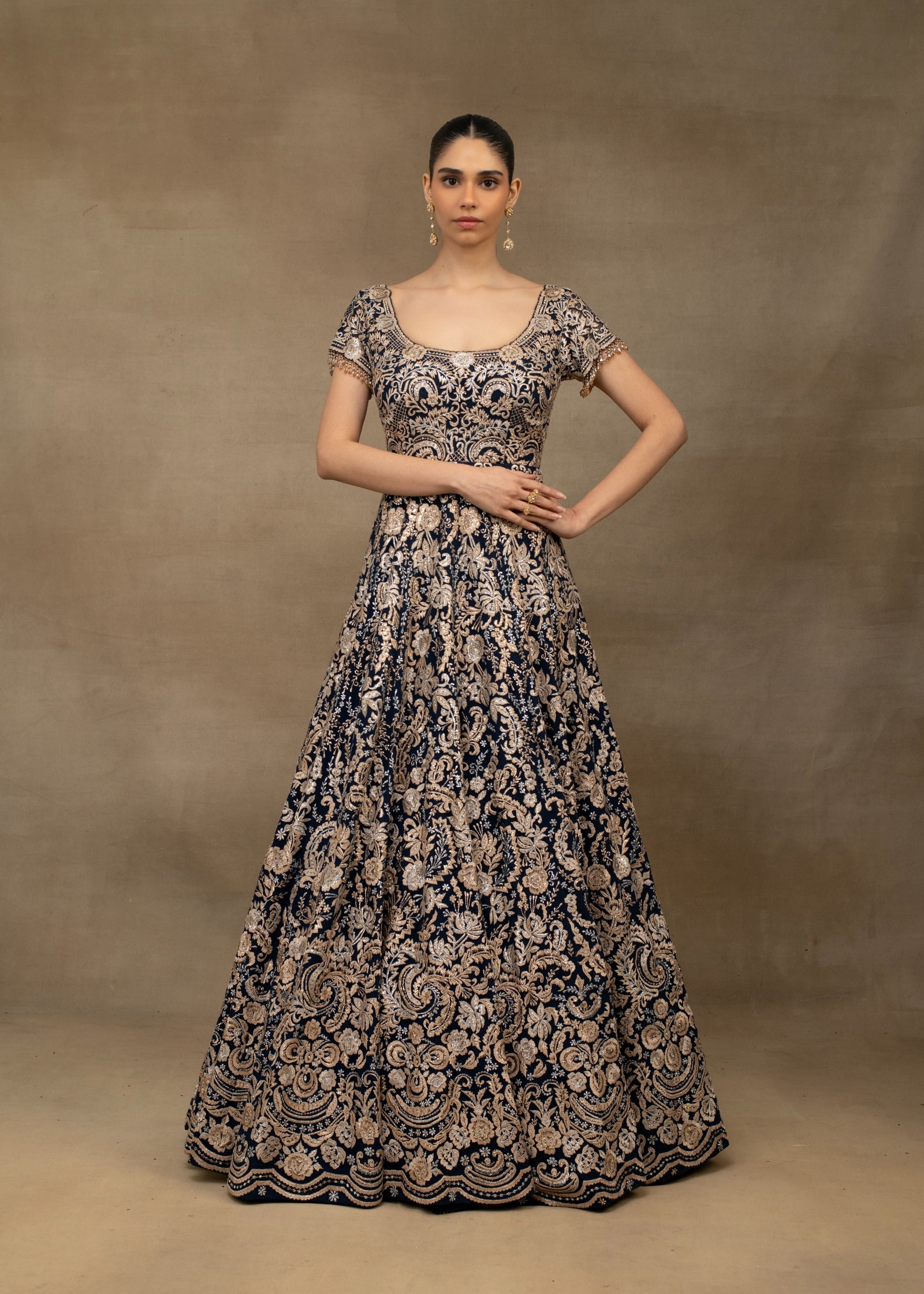 INR 325,000INR 325,000Sold outA majestic navy blue gown featuring intricate gold embroidery and sequin work in traditional motifs. The fitted, short-sleeved gown has a sweetheart neckline, enhancing the regal...