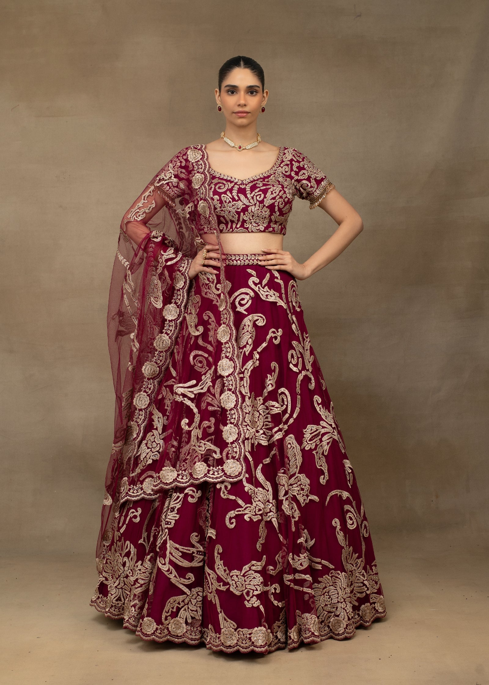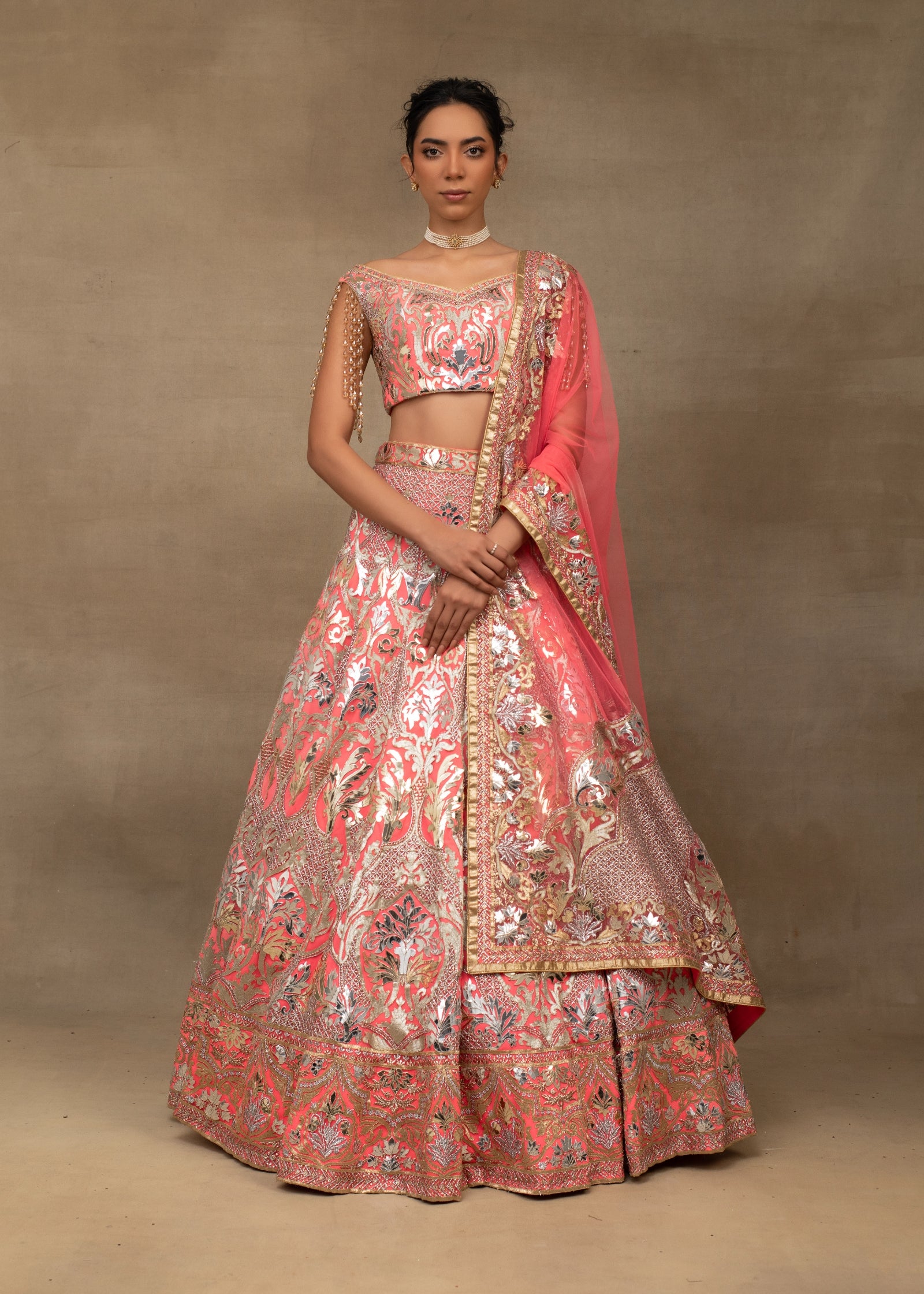 INR 545,000INR 545,000Sold outVibrant coral red lehenga set adorned highhlighted with exquisite leather appliqué, zarinand resham intricate thread work. Paired with a matching blouse with delicate shoulder details, and a sheer...