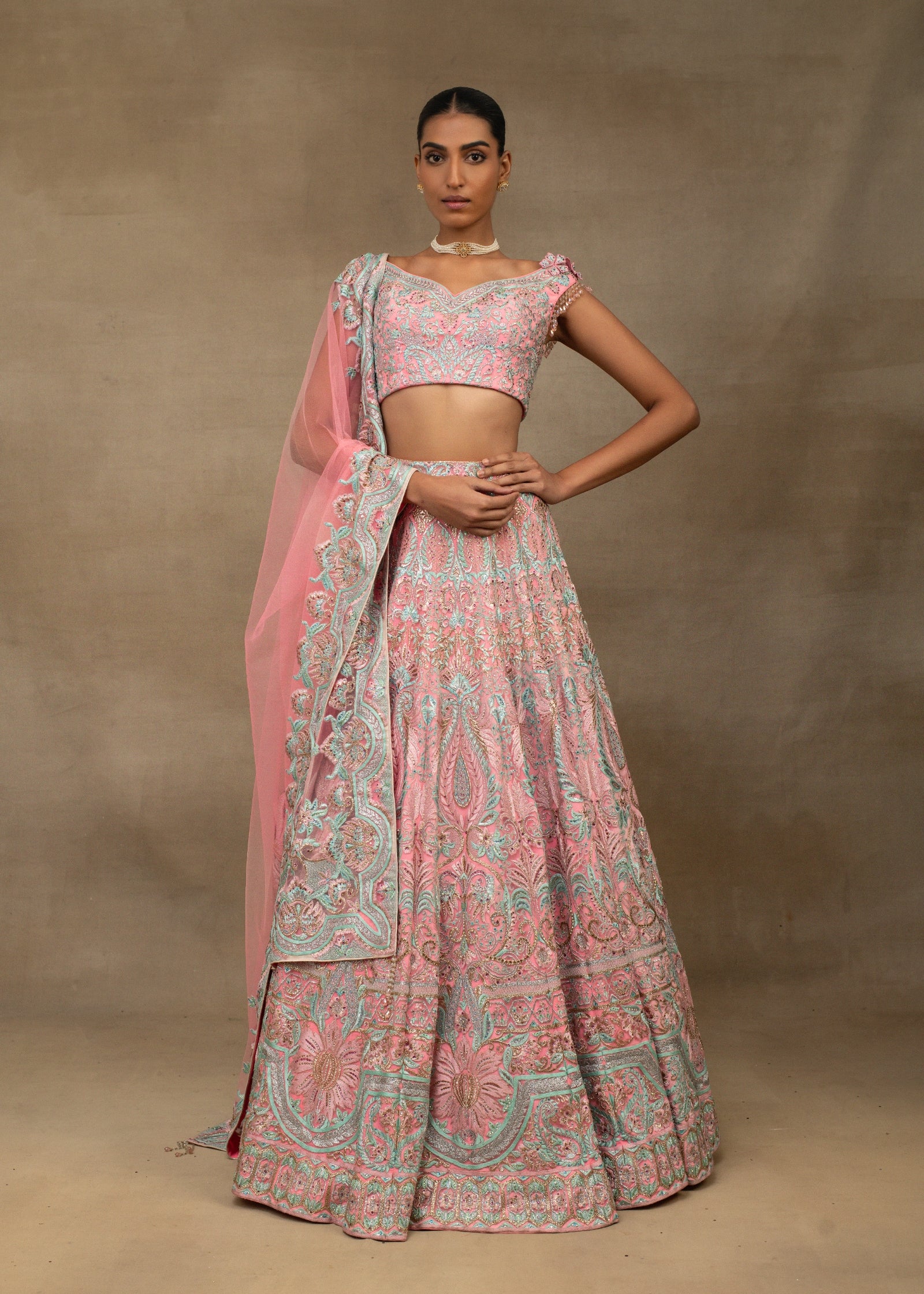 INR 375,000INR 375,000Sold outA stunning pink lehenga set, featuring a voluminous skirt and a matching short-sleeved blouse, both intricately adorned with detailed teal and gold embroidery in floral and...
