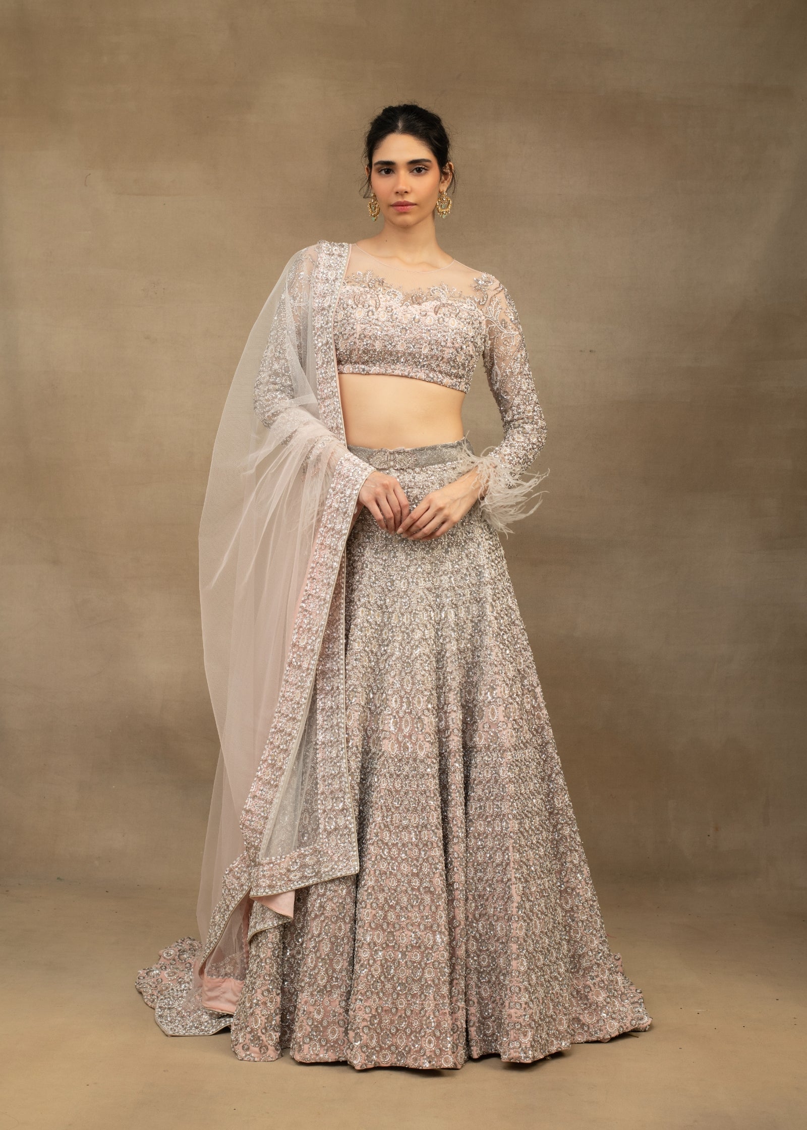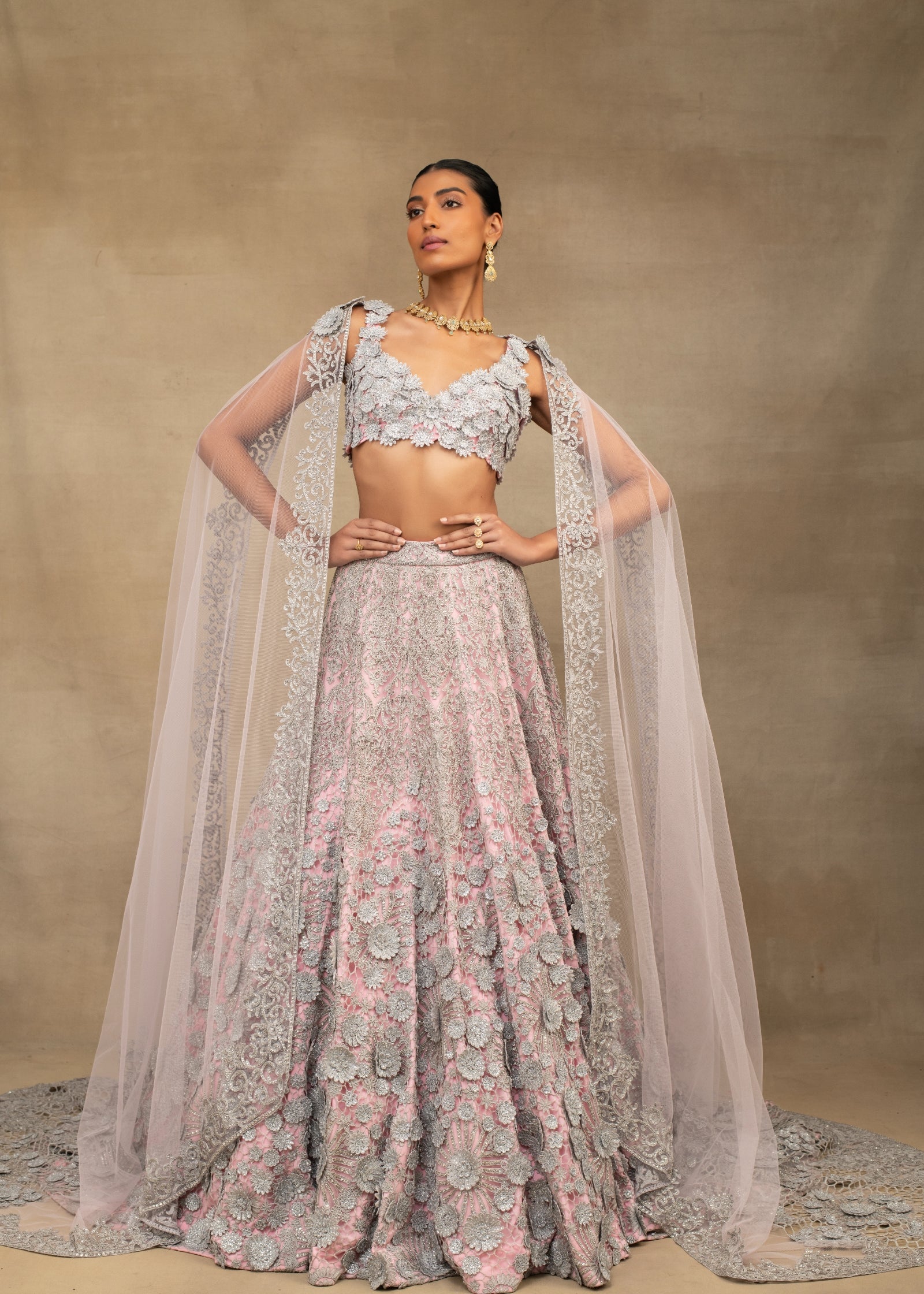 INR 895,000INR 895,000Sold outA graceful and glamorous lehenga set featuring a flared skirt adorned with intricate silver and white floral embroidery on a soft pink base. The set includes...