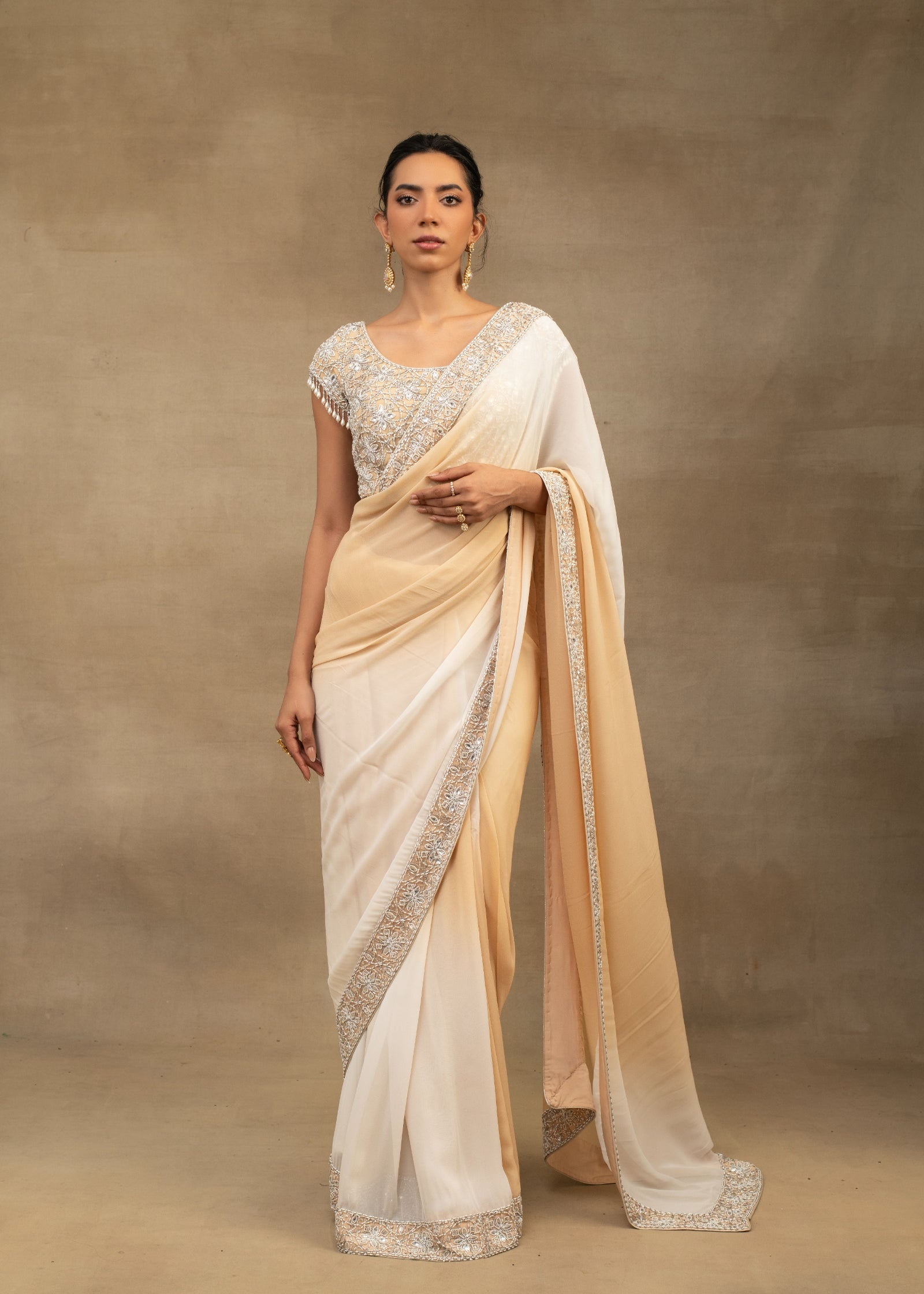 INR 255,000INR 255,000Sold outAn elegant ombre saree blending off-white into soft beige, featuring intricate silver and gold embroidery along the borders and scattered motifs. It is paired with a heavily embellished...