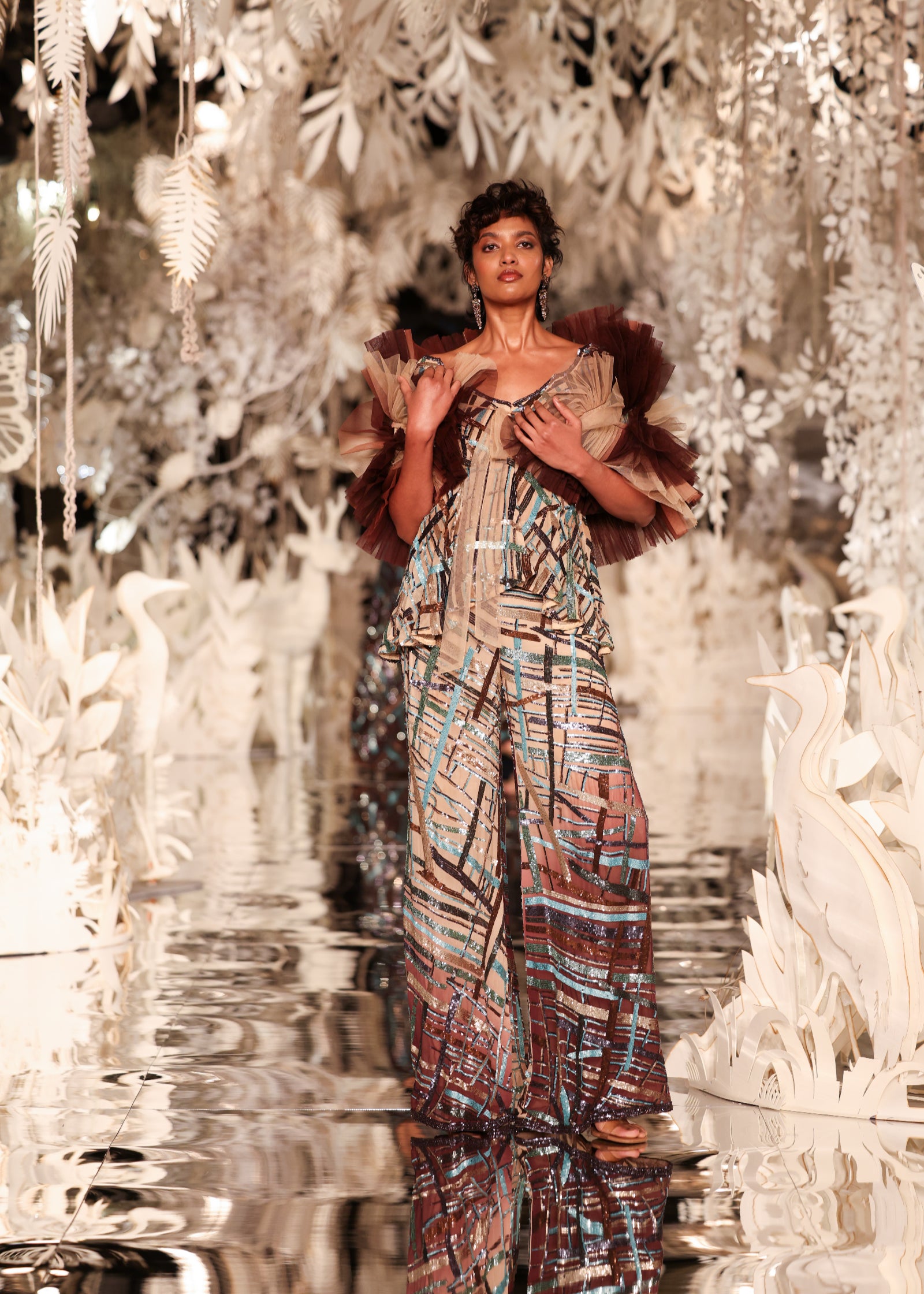 INR 202,000INR 202,000Sold outAn elegant jumpsuit with a wide-leg silhouette and a captivating abstract print in earthy tones of brown, beige, and teal. The key feature of this design...