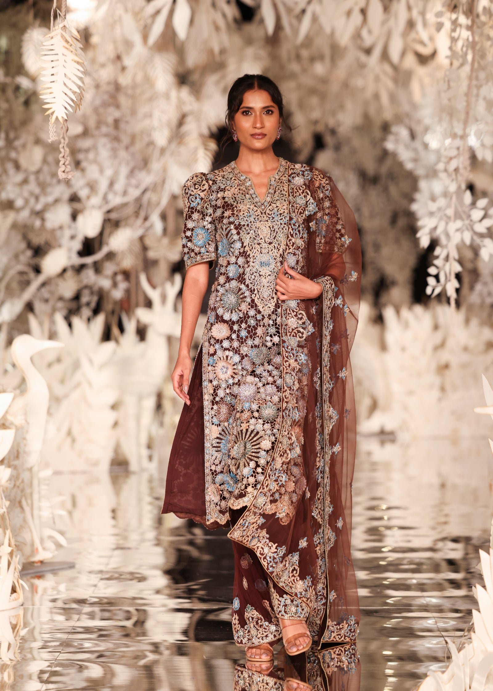 INR 315,000INR 315,000Sold outA luxurious sharara set in a rich, earthy tone. The short-sleeved kurta is lavishly adorned with intricate floral and geometric embroidery in a contrasting palette of...