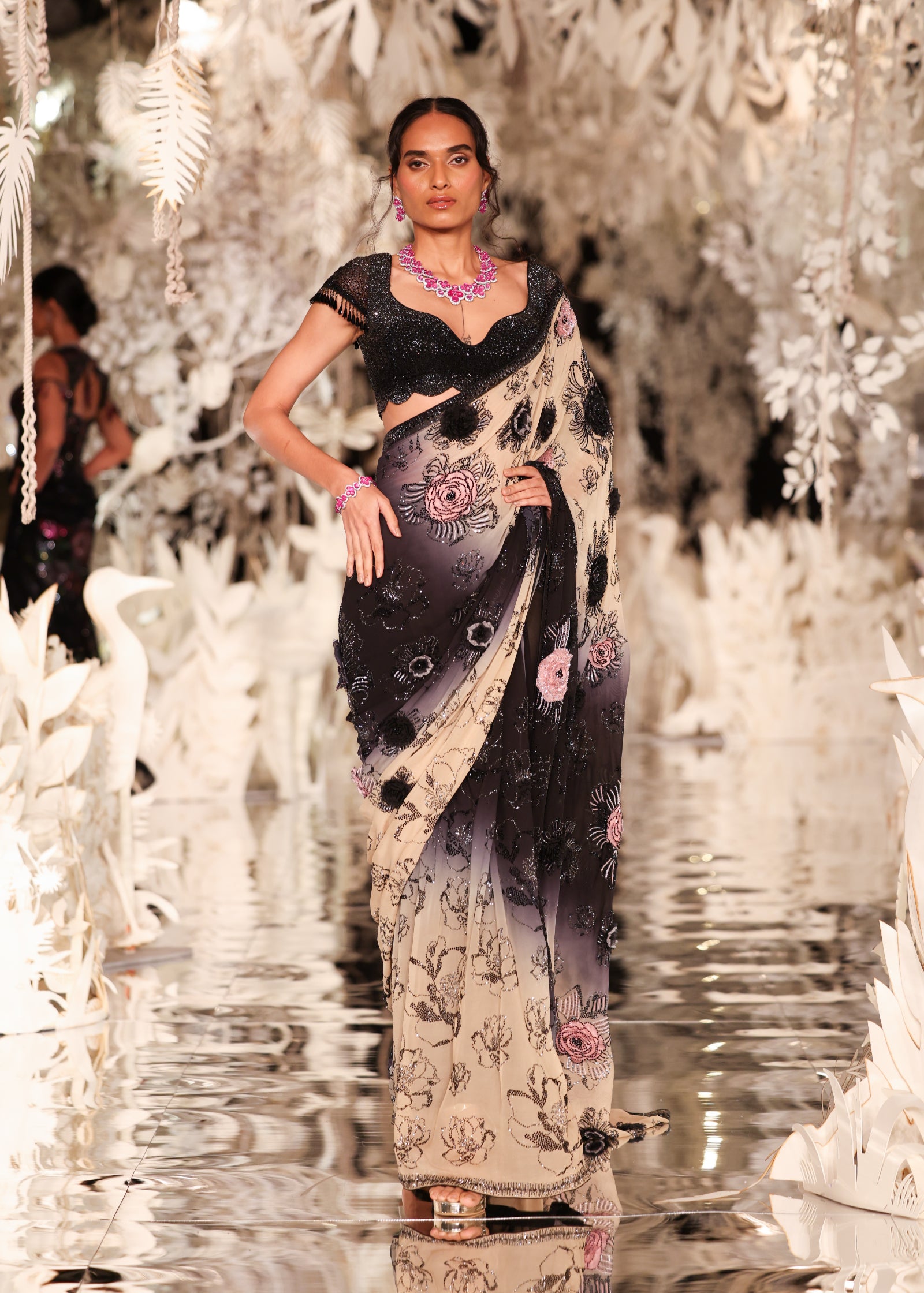 3d flowers black to nude ombre saree with swarovski blouse