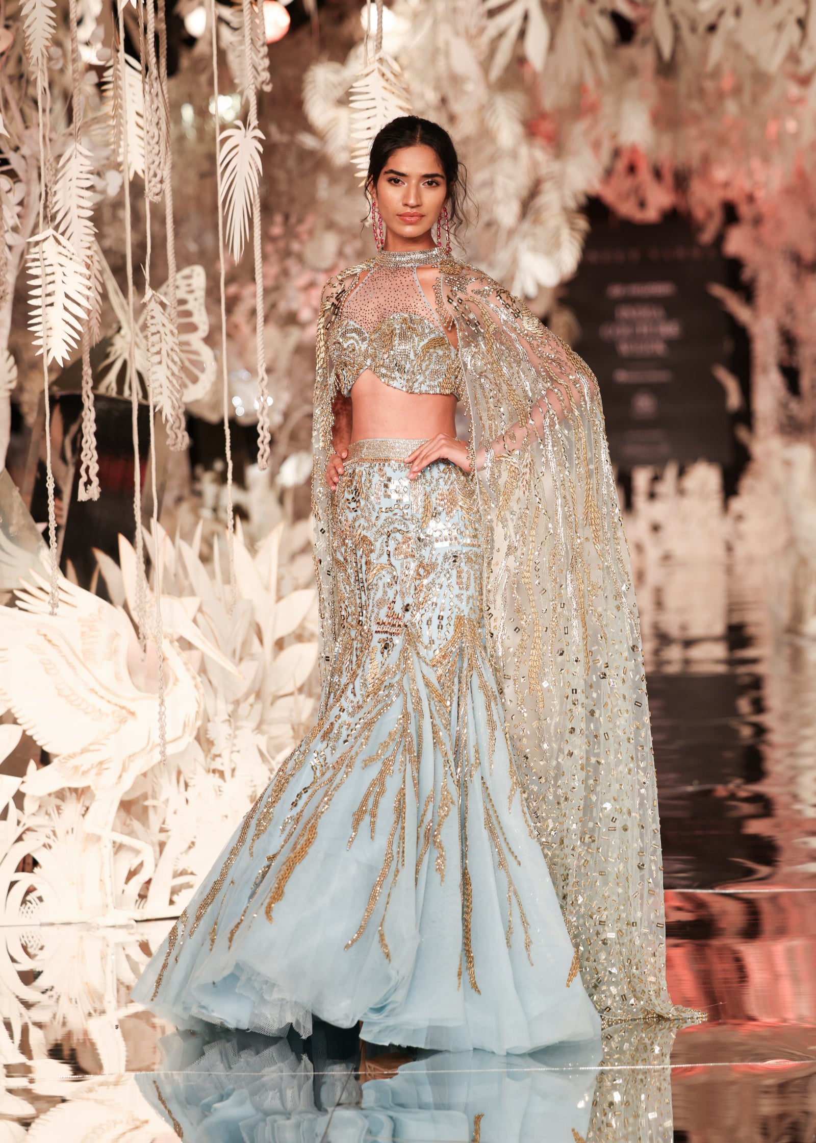 Blue mermaid lehenga set with blouse and cascades