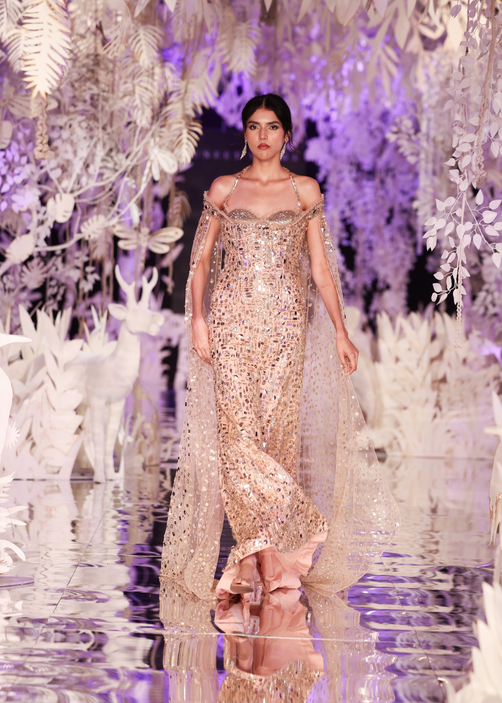 Mirror-embellished blush pink gown with sheer drapes