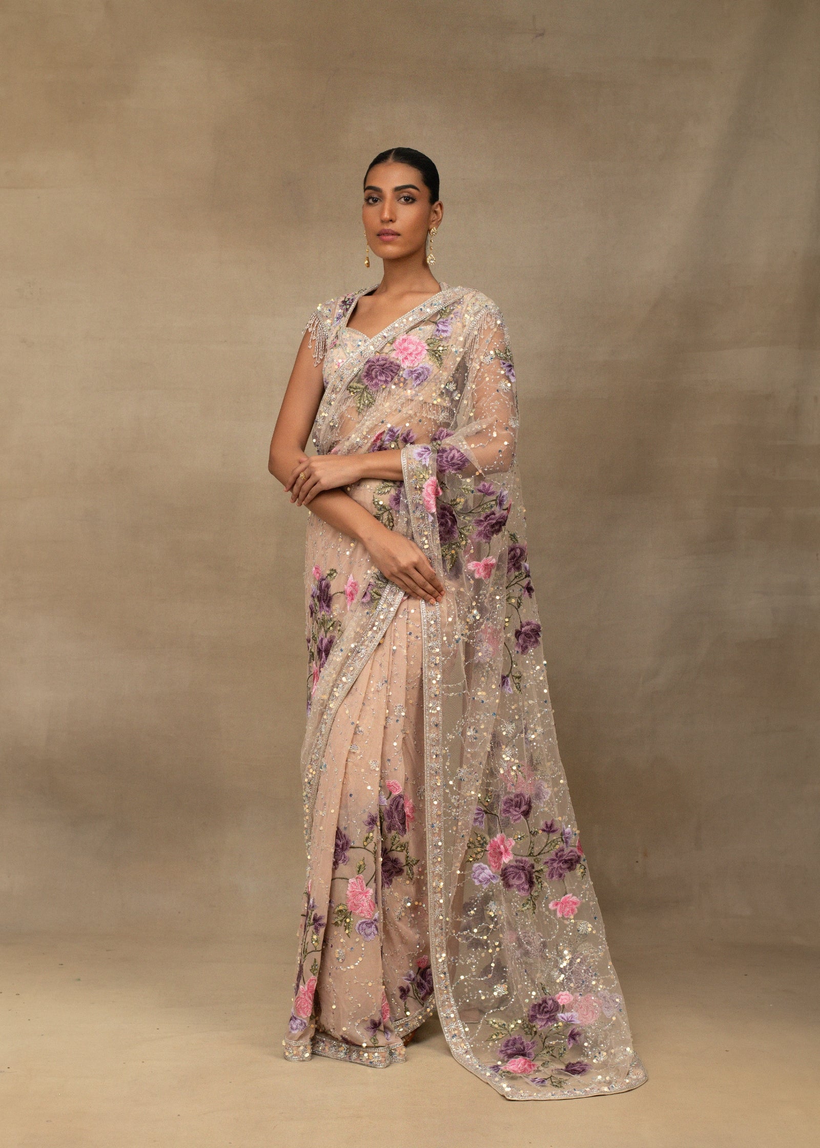 Nude pink floral embroidered sequin saree