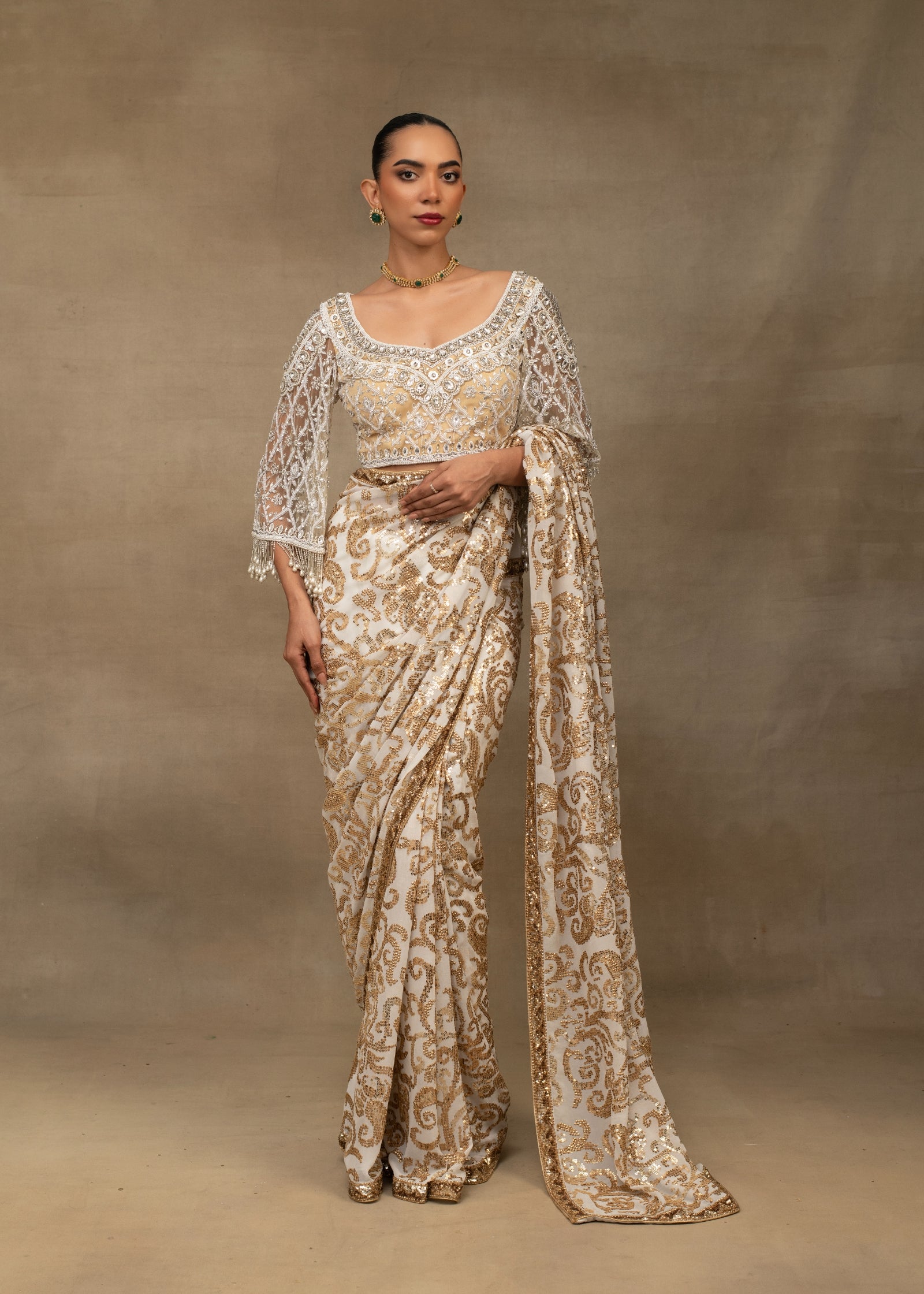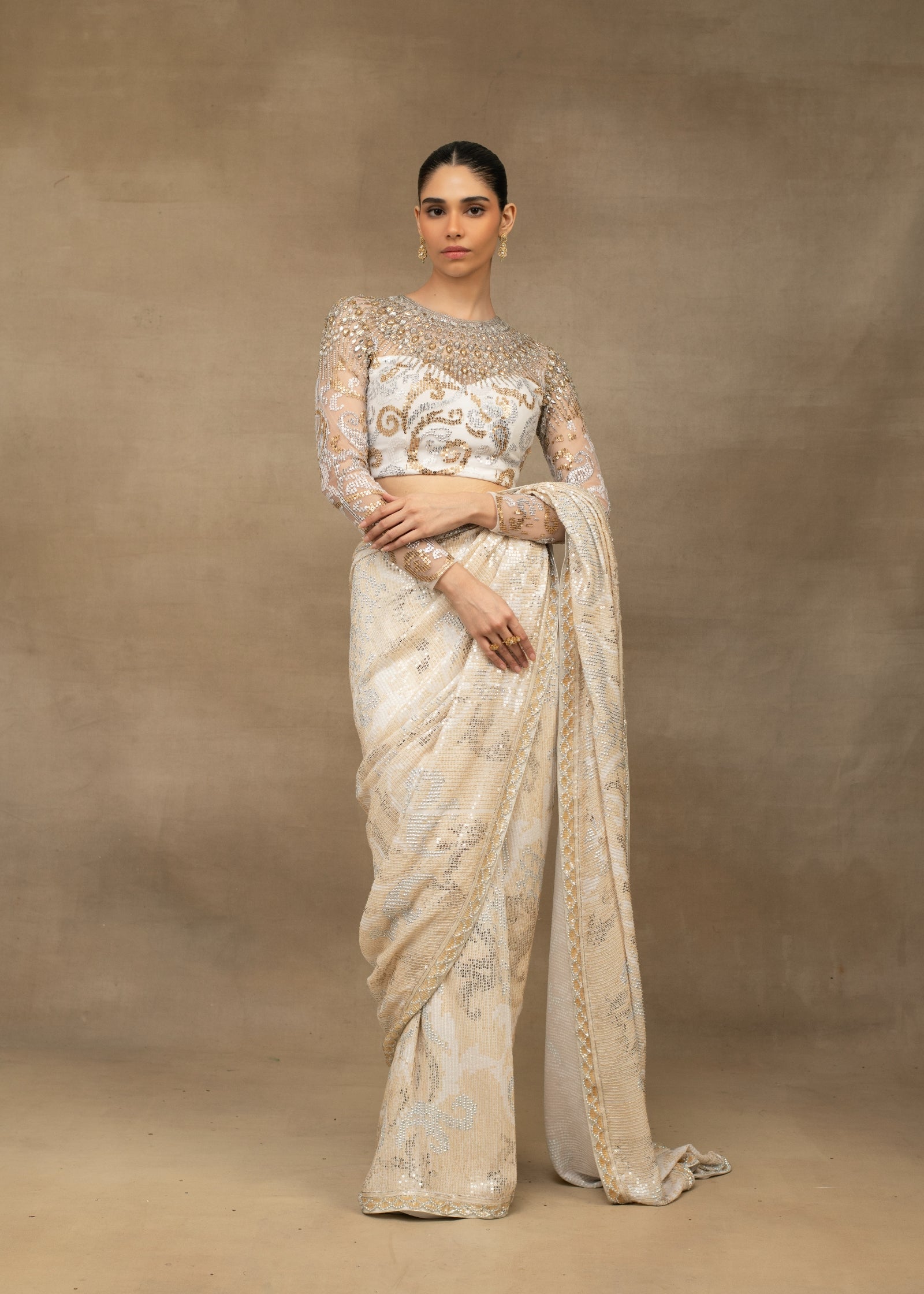 Ivory and gold sequin embroidered saree with embellished blouse