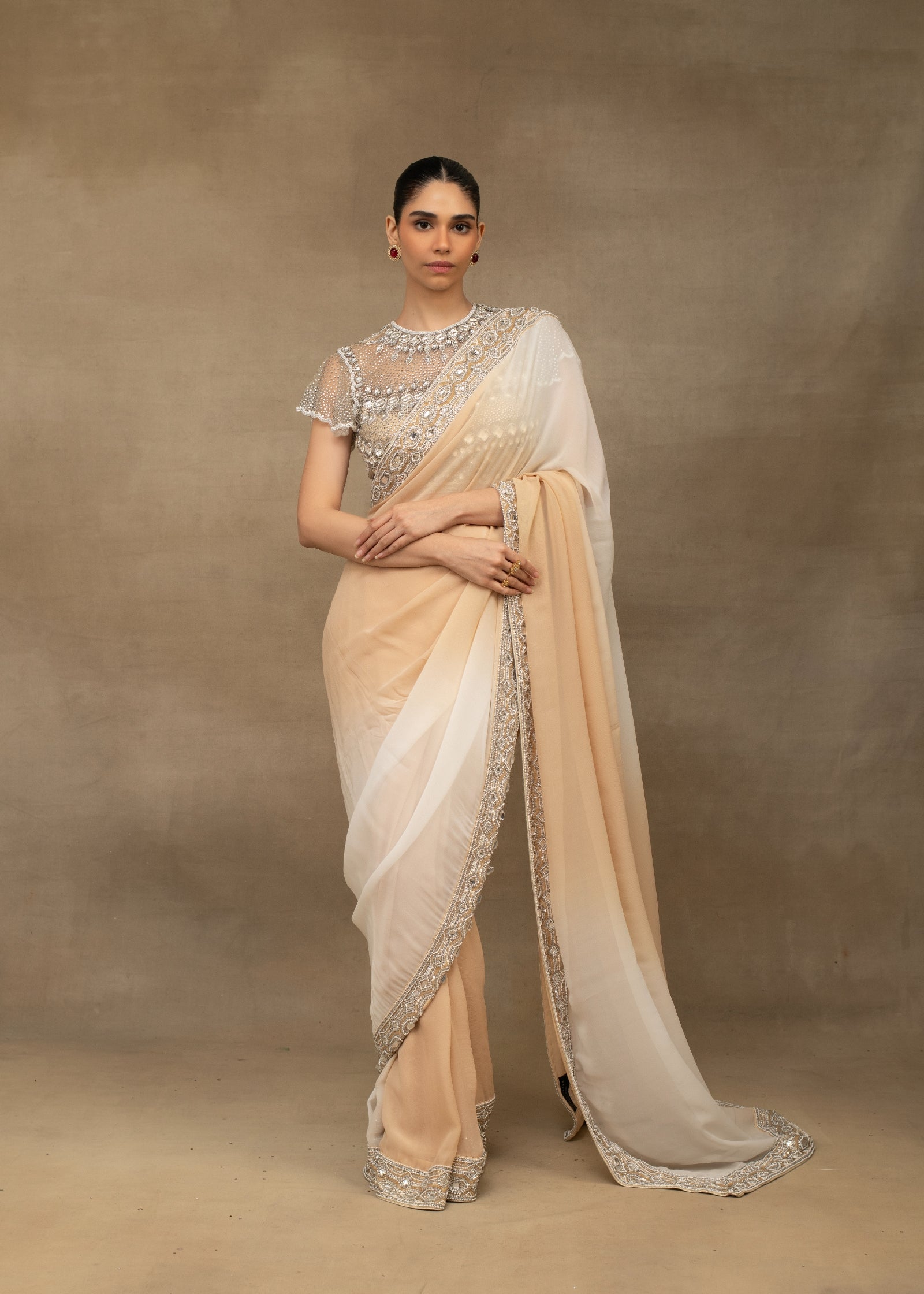 Ombre beige and white embellished saree with beaded blouse