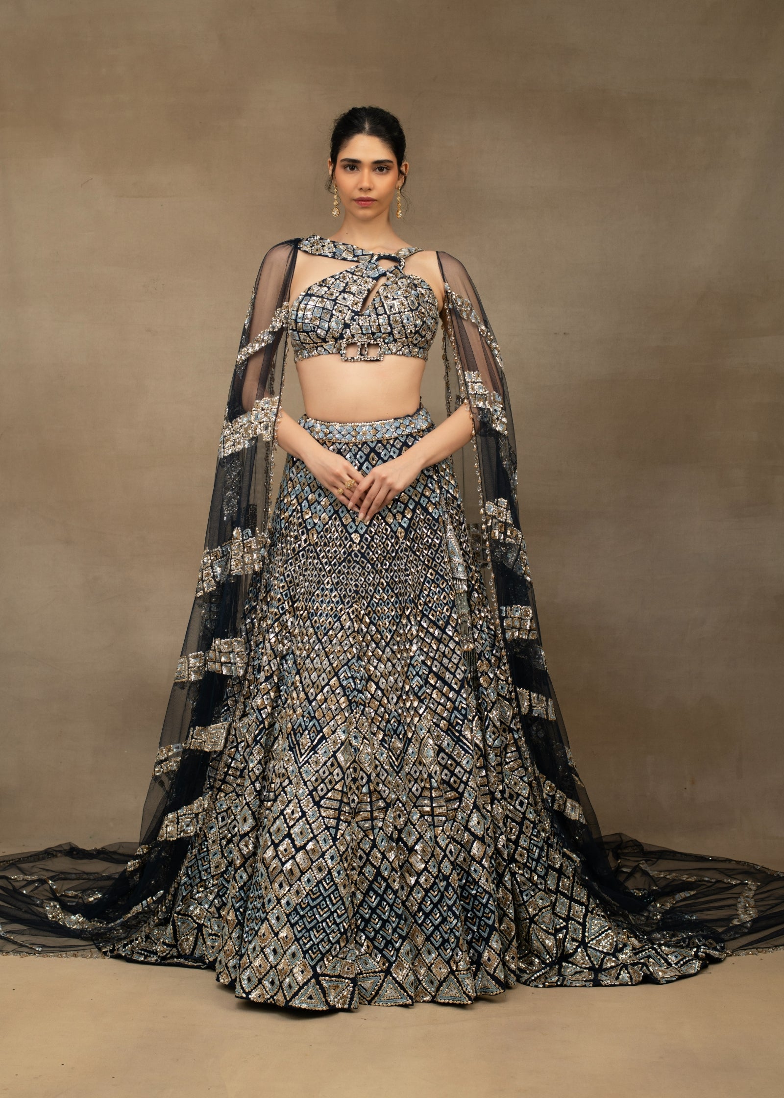 INR 550,000INR 550,000Sold outStriking navy blue lehenga with trail featuring an intricate geometric pattern with shades of blue sequin across the lehenga and cut-out blouse. Paired with a dramatic, flowing...