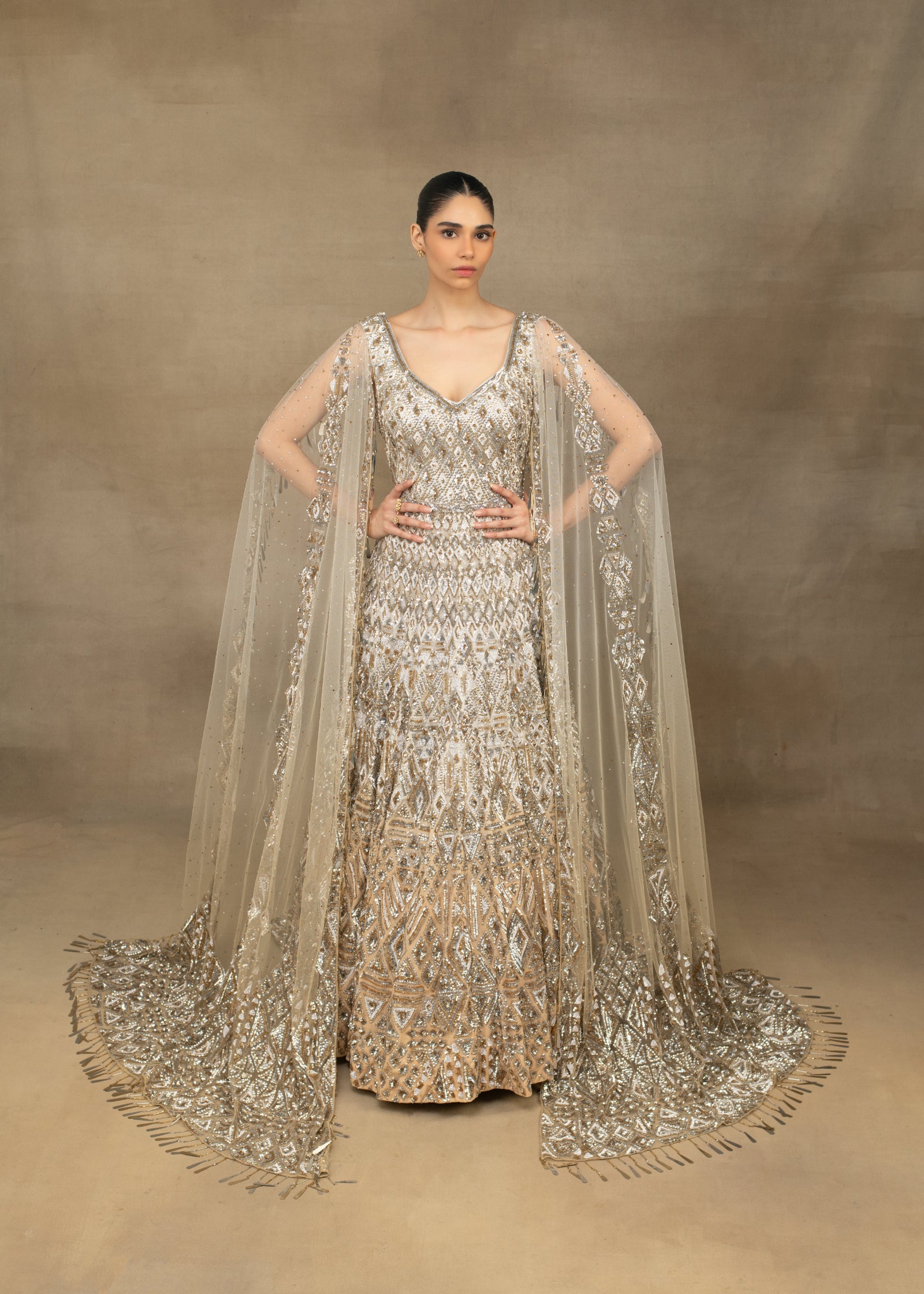 INR 195,000INR 195,000 INR 495,000Sale Sold outA magnificent gown featuring a flattering neckline and intricate silver and gold embellishments that create a stunning, flowing pattern. The gown is complemented by sheer, floor-length...