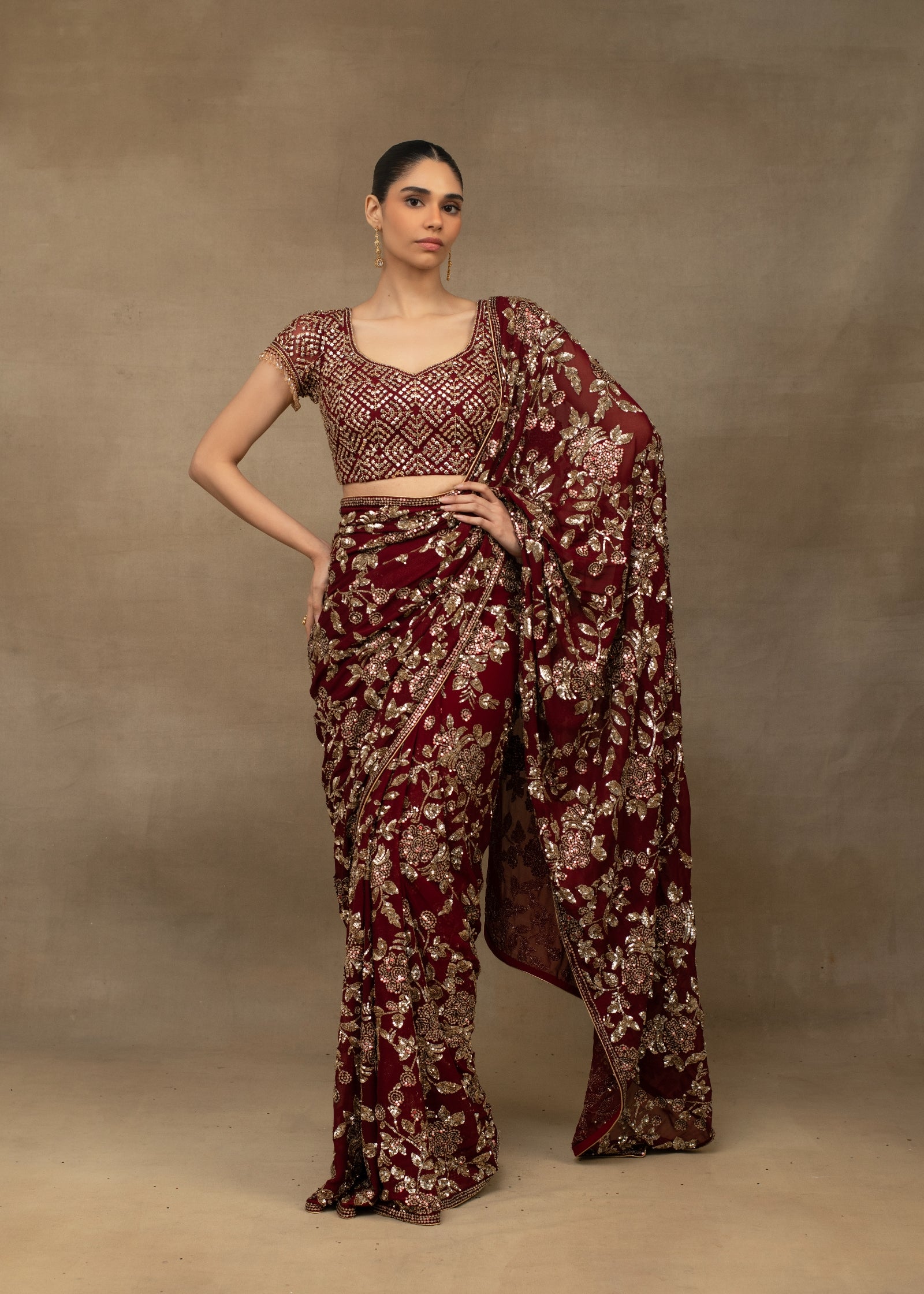 Maroon abstract sequin saree with embellished blouse
