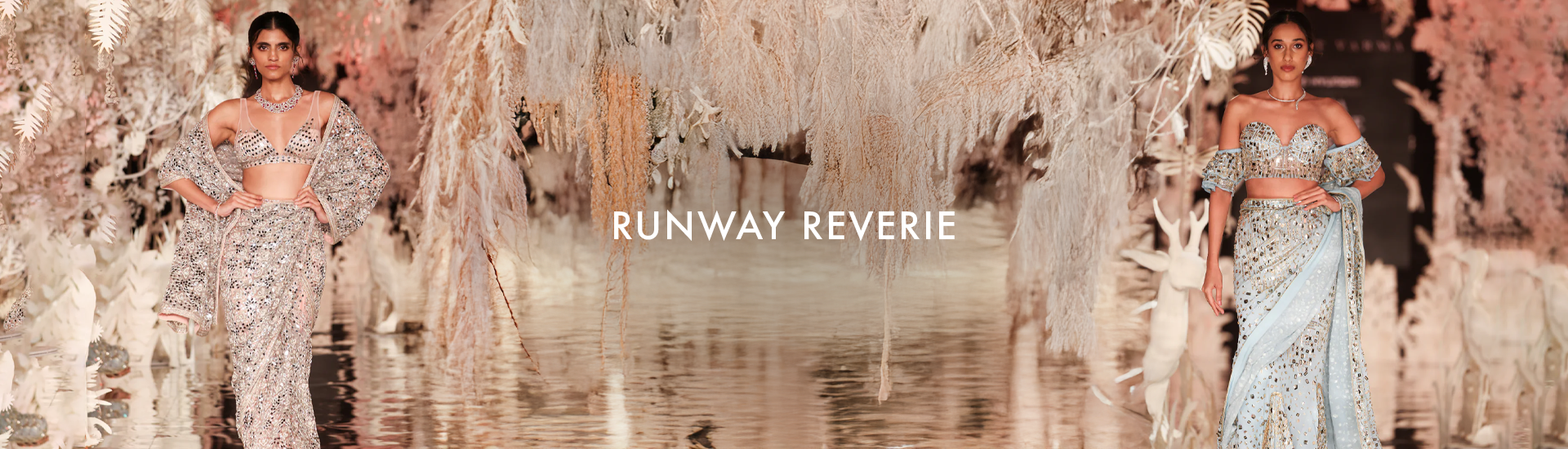 From INR 280,000From INR 280,000Sold outA striking and artistic ensemble featuring an ombre saree that flows from a dark shade into a translucent white, decorated with floral motifs and sequins.