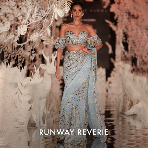 From INR 265,000From INR 265,000Sold outAn elegant sky-blue pre-draped saree with intricate gold and silver sequin and mirror work. It is paired with a matching off-shoulder blouse featuring a sweetheart neckline...