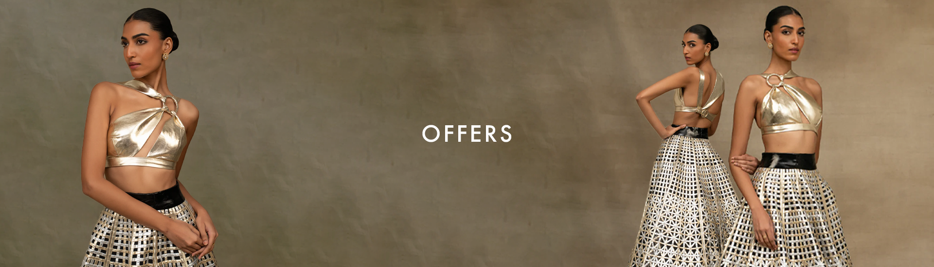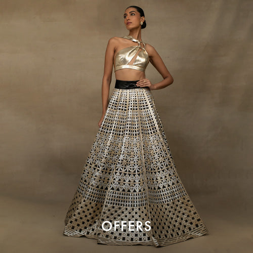 INR 145,000INR 145,000 INR 265,000Sale Sold outA contemporary ensemble featuring a metallic gold halter neck crop top with a prominent O-ring detail. It is paired with a striking black and gold lehenga,...