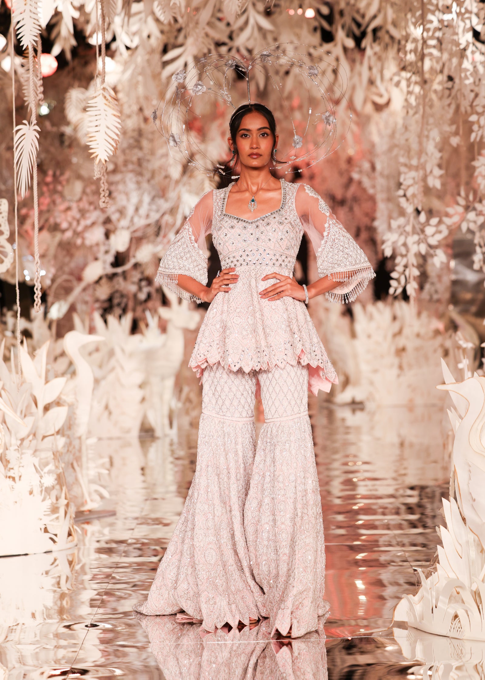 INR 484,000INR 484,000Sold outA stunning two-piece ensemble featuring a short peplum-style kurta with a scalloped hem and dramatic bell sleeves with layered beaded fringe. Both the kurta and the...
