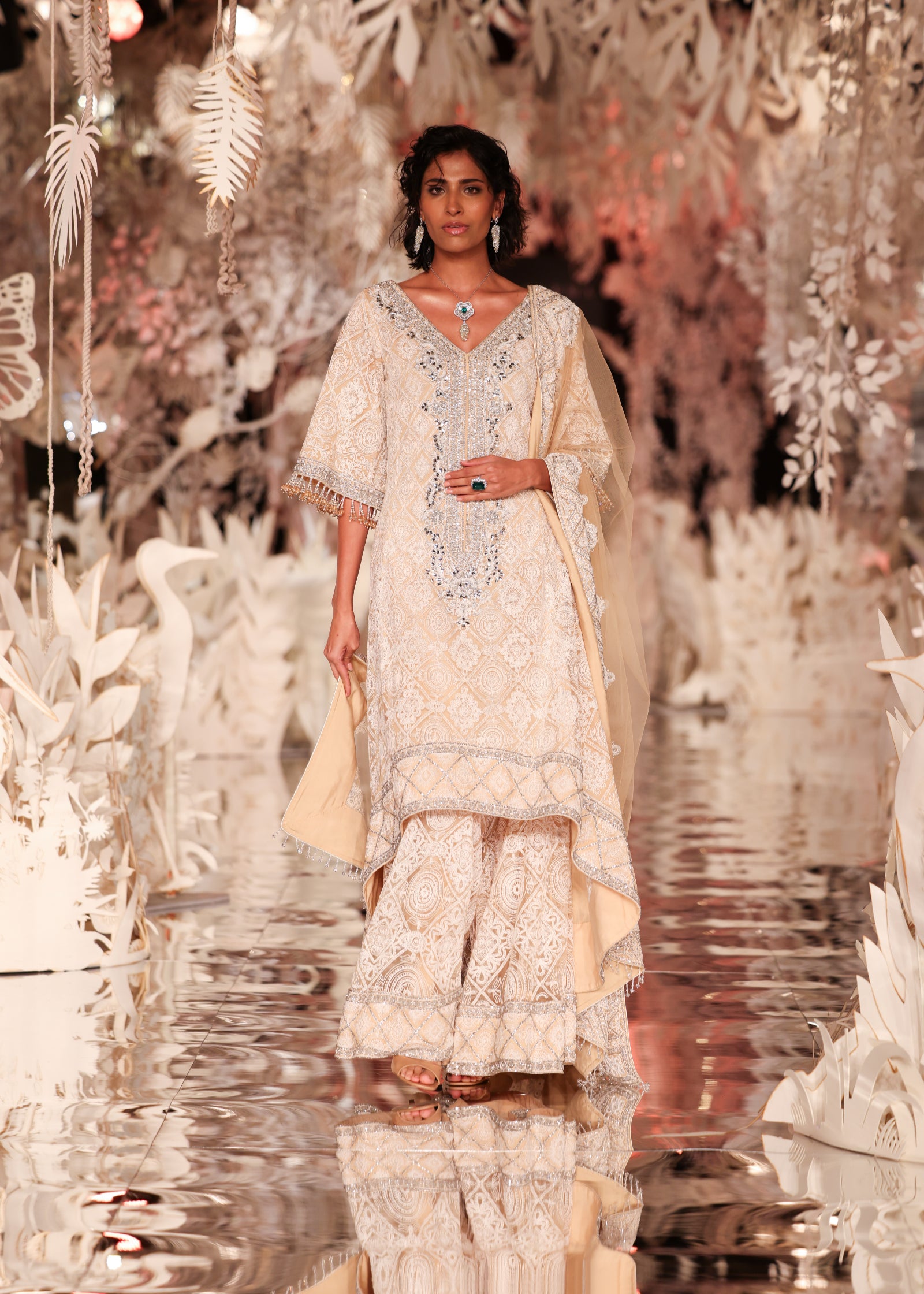 INR 265,000INR 265,000Sold outA refined and traditional sharara set in a soft ivory shade. The long kurta features a plunging V-neckline with heavy silver and white floral embroidery and...