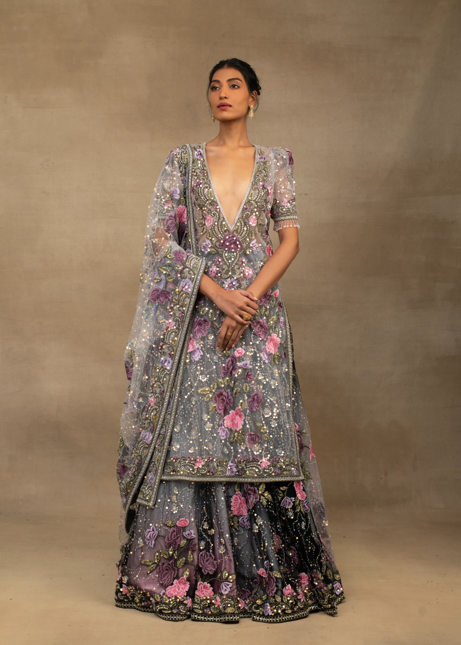INR 325,000INR 325,000Sold outA mesmerizing multi-floral embroidered sharara set with a deep V-neckline, adorned with intricate sequins and thread work in vibrant hues. The layered design features a black embellished inner...