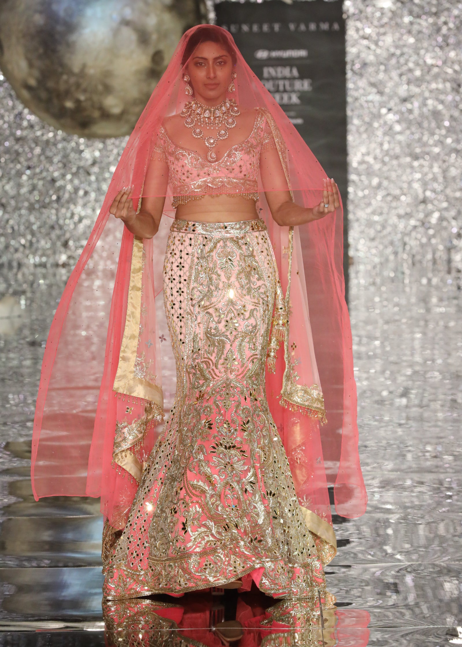 Shaded pink fish cut lehenga with acryllic mirror & sequin embroidery with blouse and dupatta