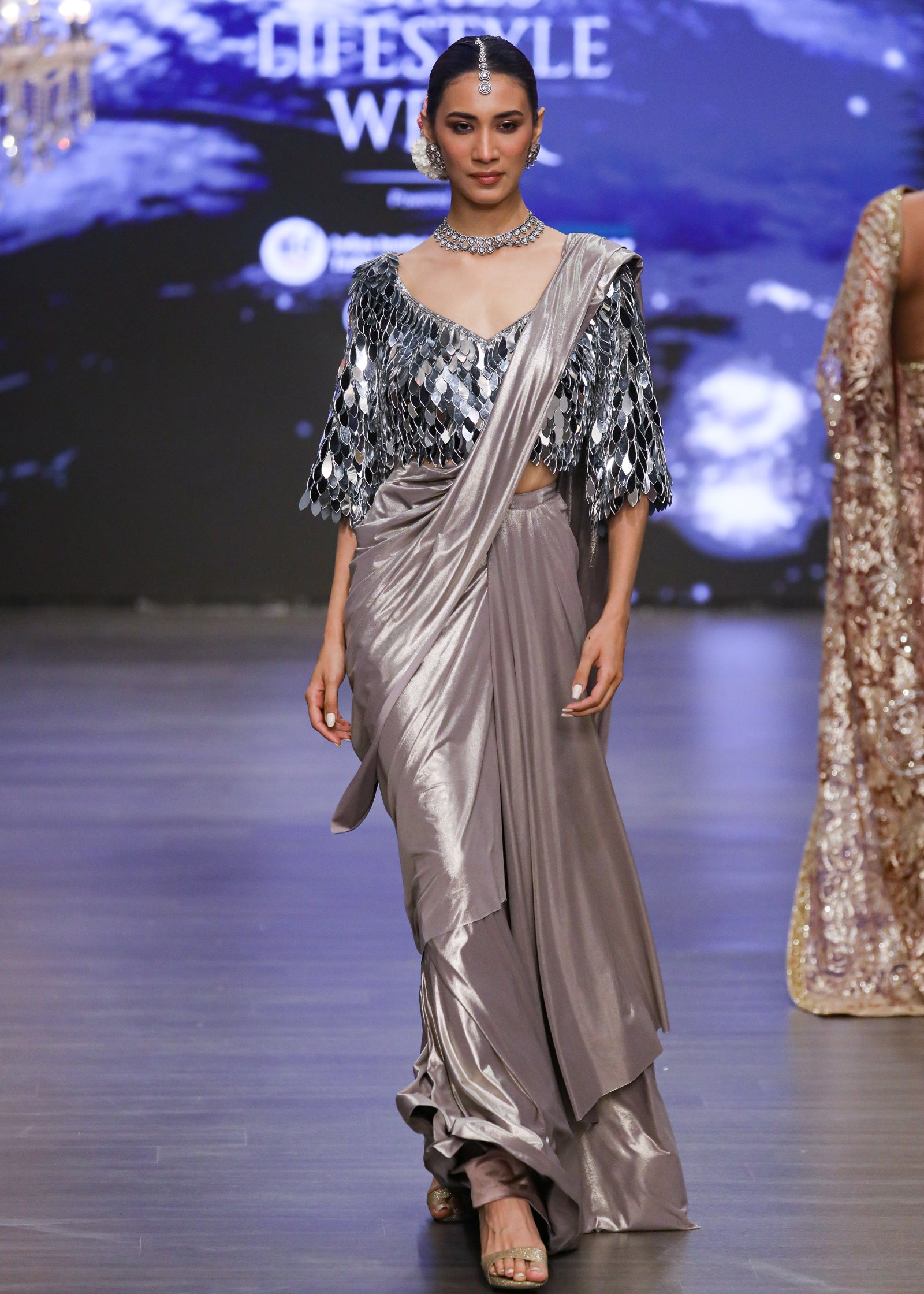 Metallic silver blouse with drape skirt