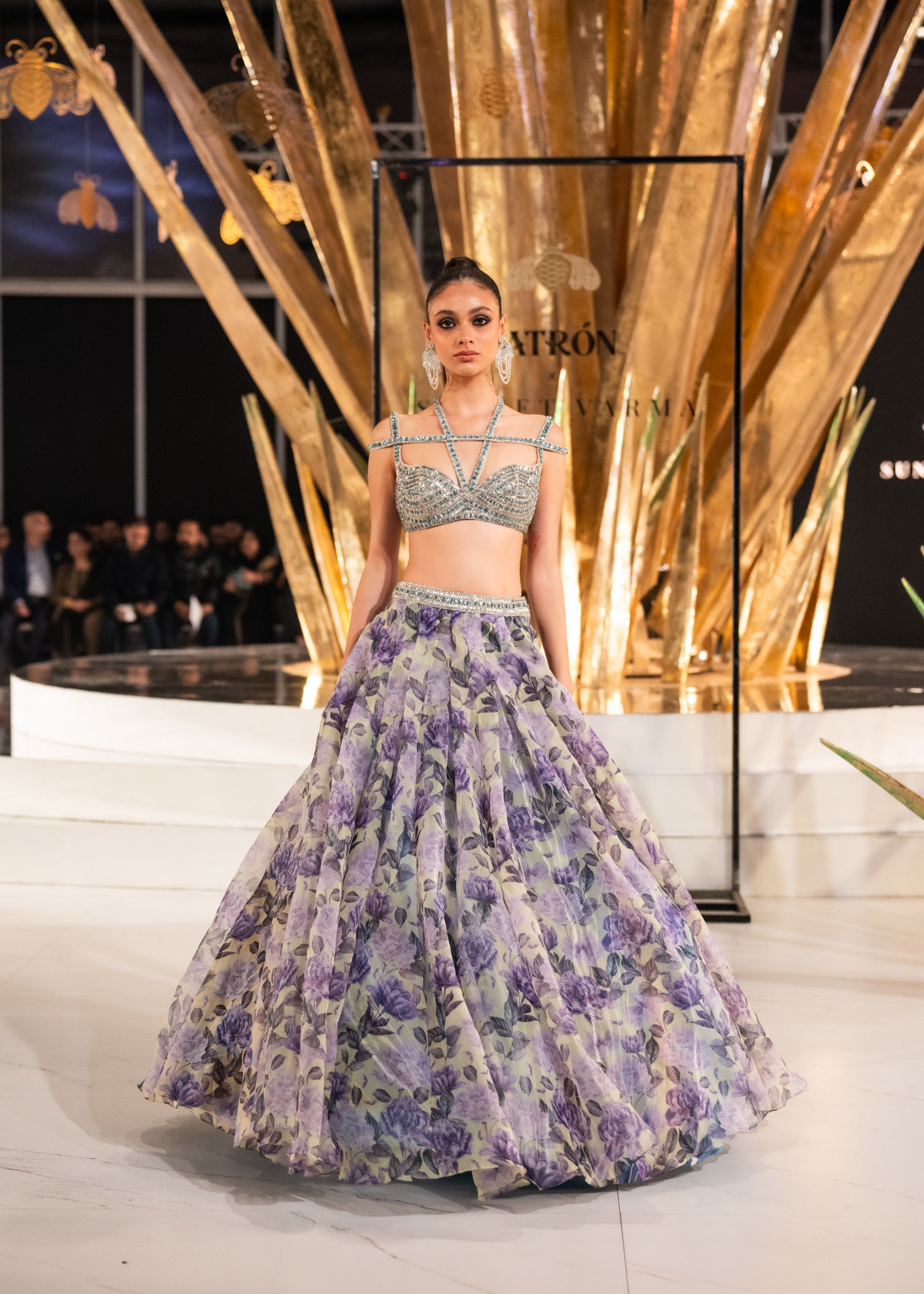 Purple and green floral printed skirt with crystal blouse