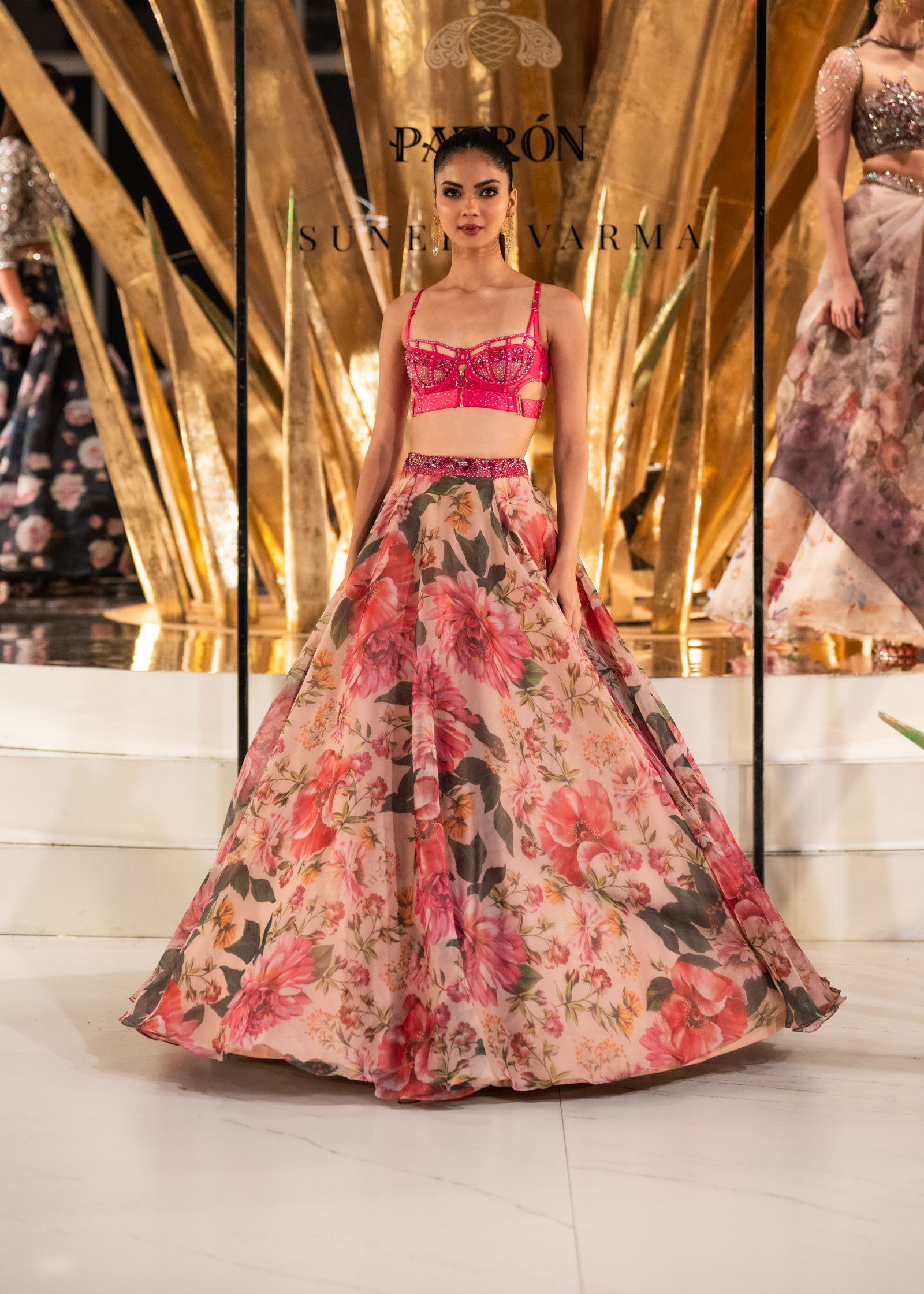 Pink floral printed skirt with crytal studded blouse