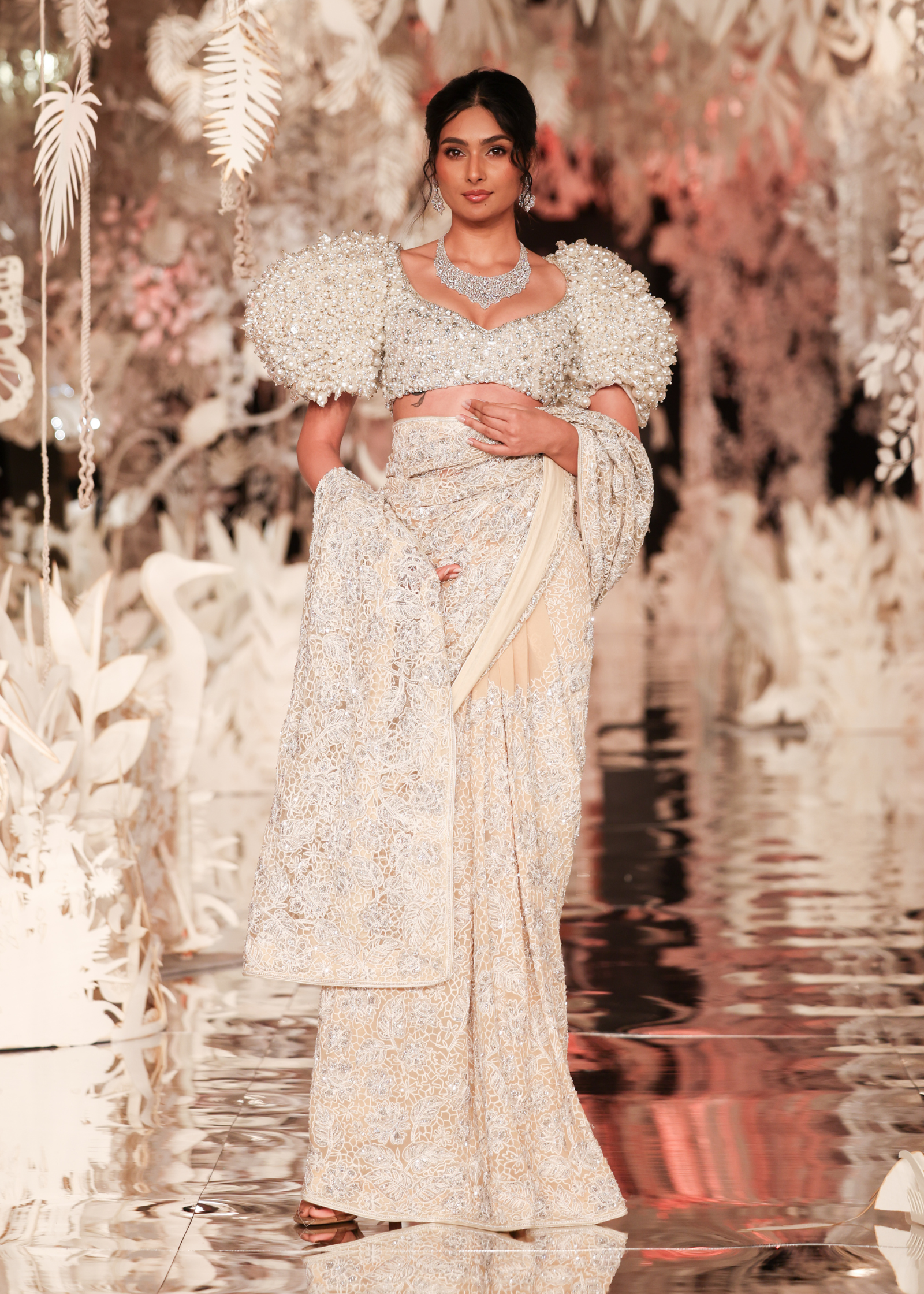 Ivory beaded pre-draped lehenga-saree with embellished blouse