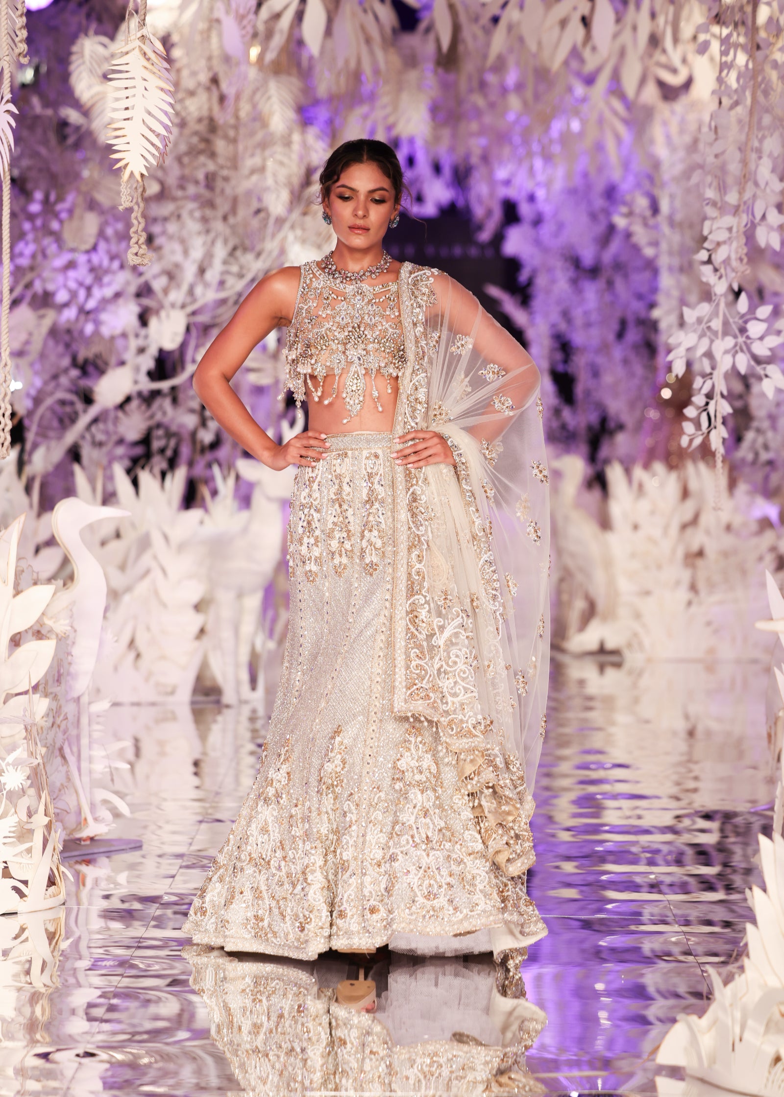 Ivory zardozi and sequin lehenga with beaded-jewelled blouse and sheer dupatta