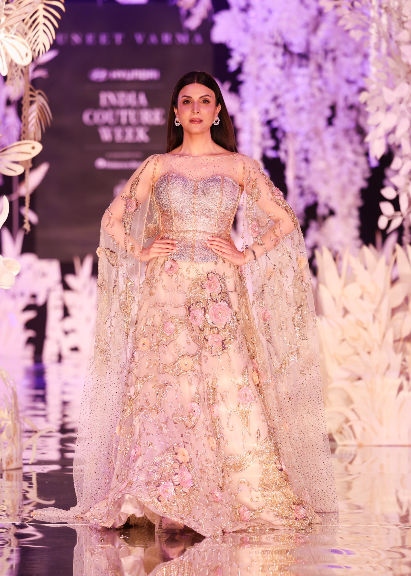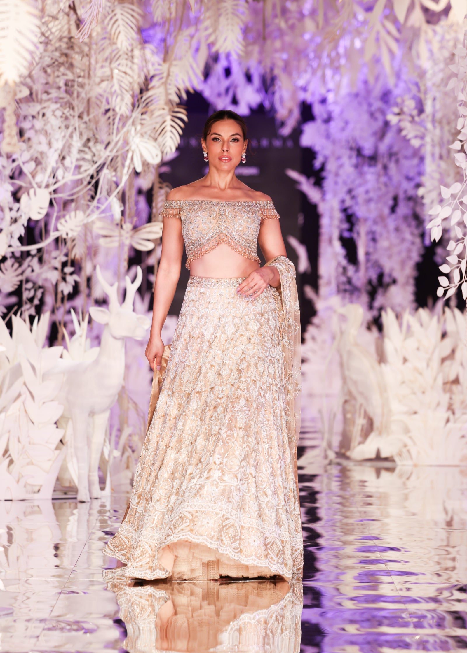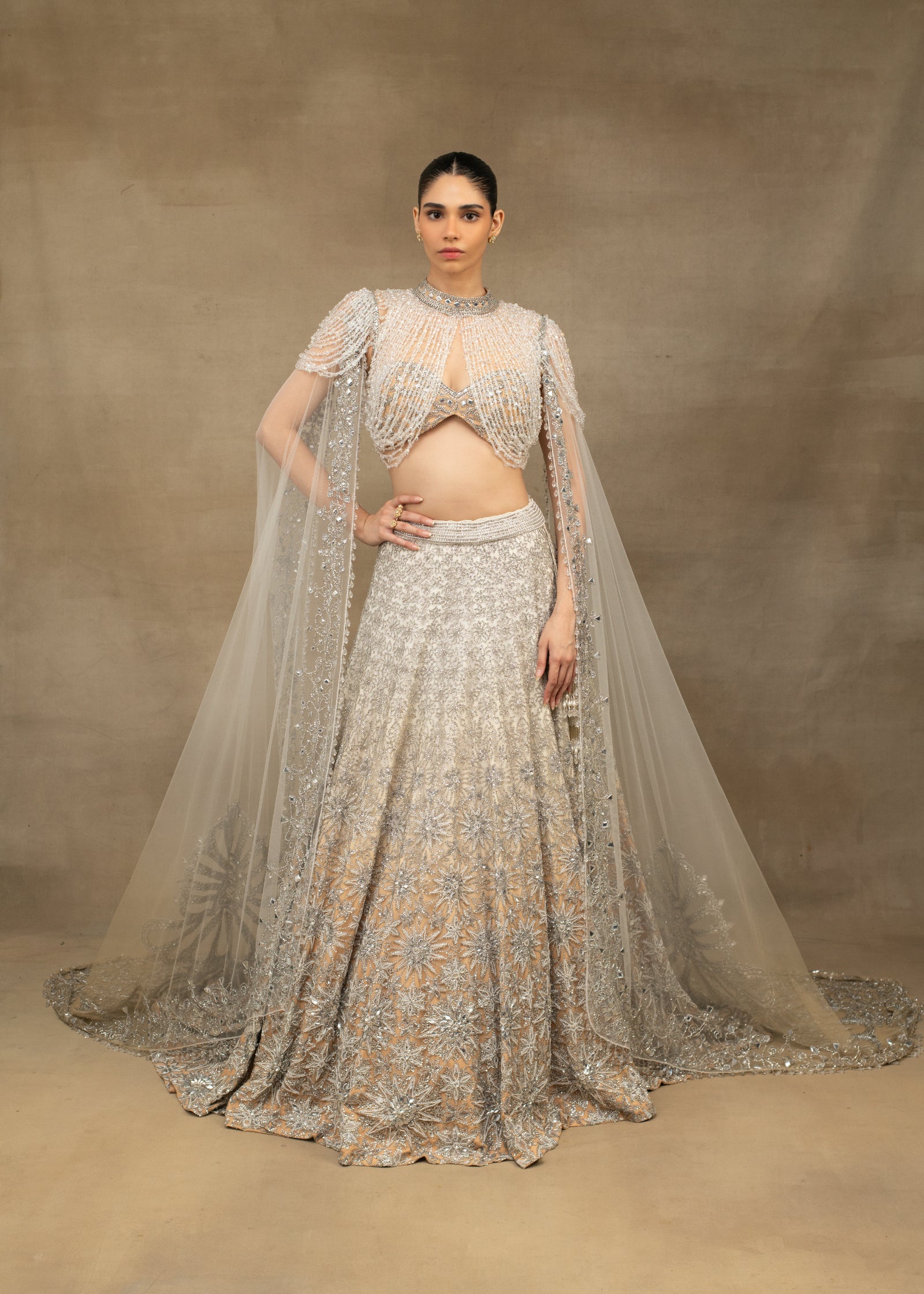 INR 695,000INR 695,000Sold outA romantic beige-toned lehenga adorned with 3D floral embroidery, swarovski embellishments, and gold threadwork. Paired with a glittering corset-style blouse and soft tulle cape sleeves that...