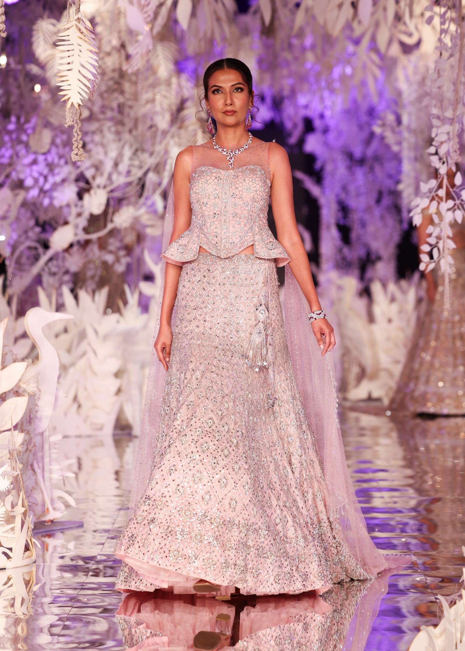 Nude pink swarovski lehenga and corset blouse with casacdes