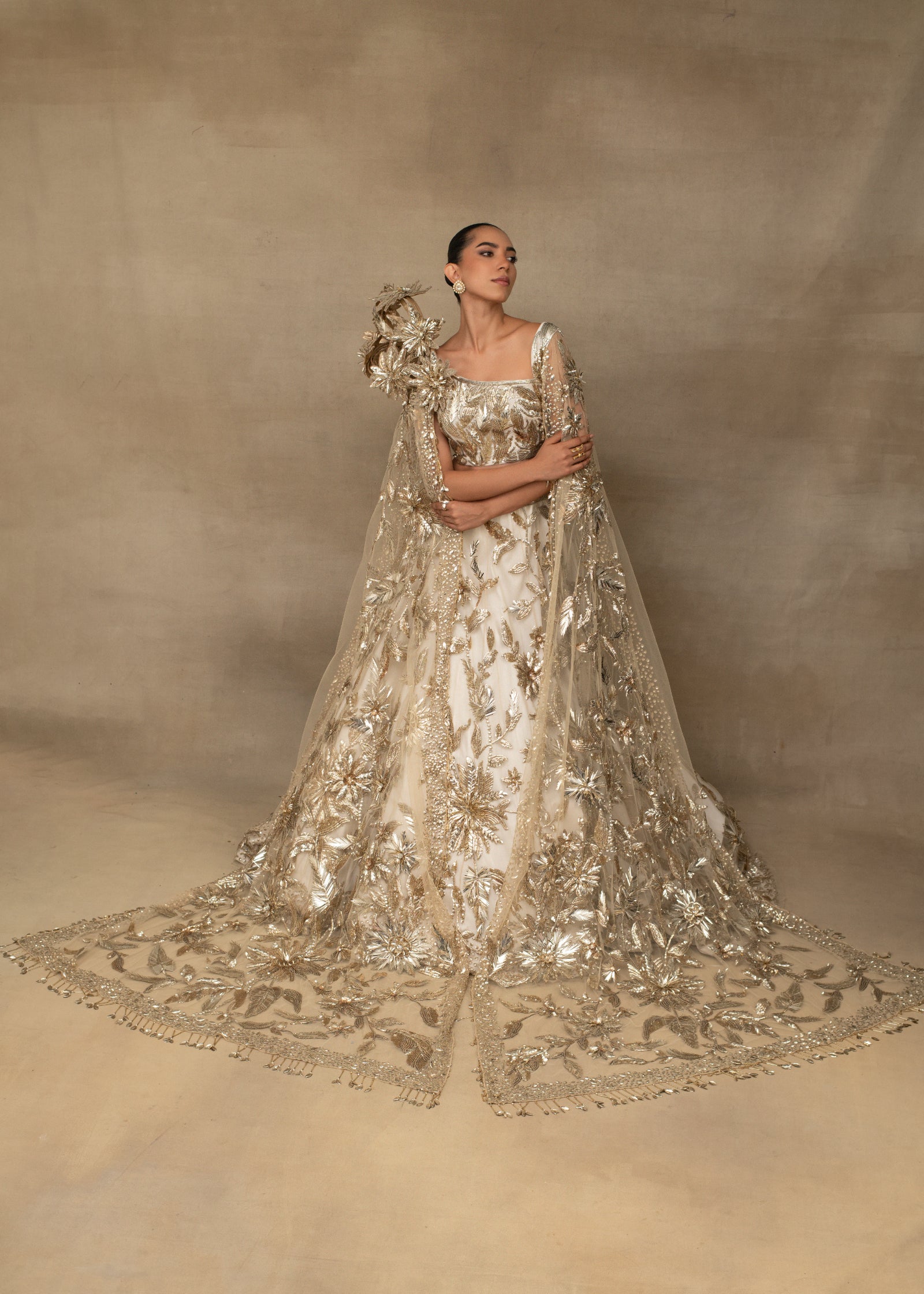 INR 550,000INR 550,000Sold outA breathtaking ivory lehenga, resplendent with intricate gold floral embroidery and sequin work. The lehenga features a dramatic, extended train and a unique statement shoulder detail...
