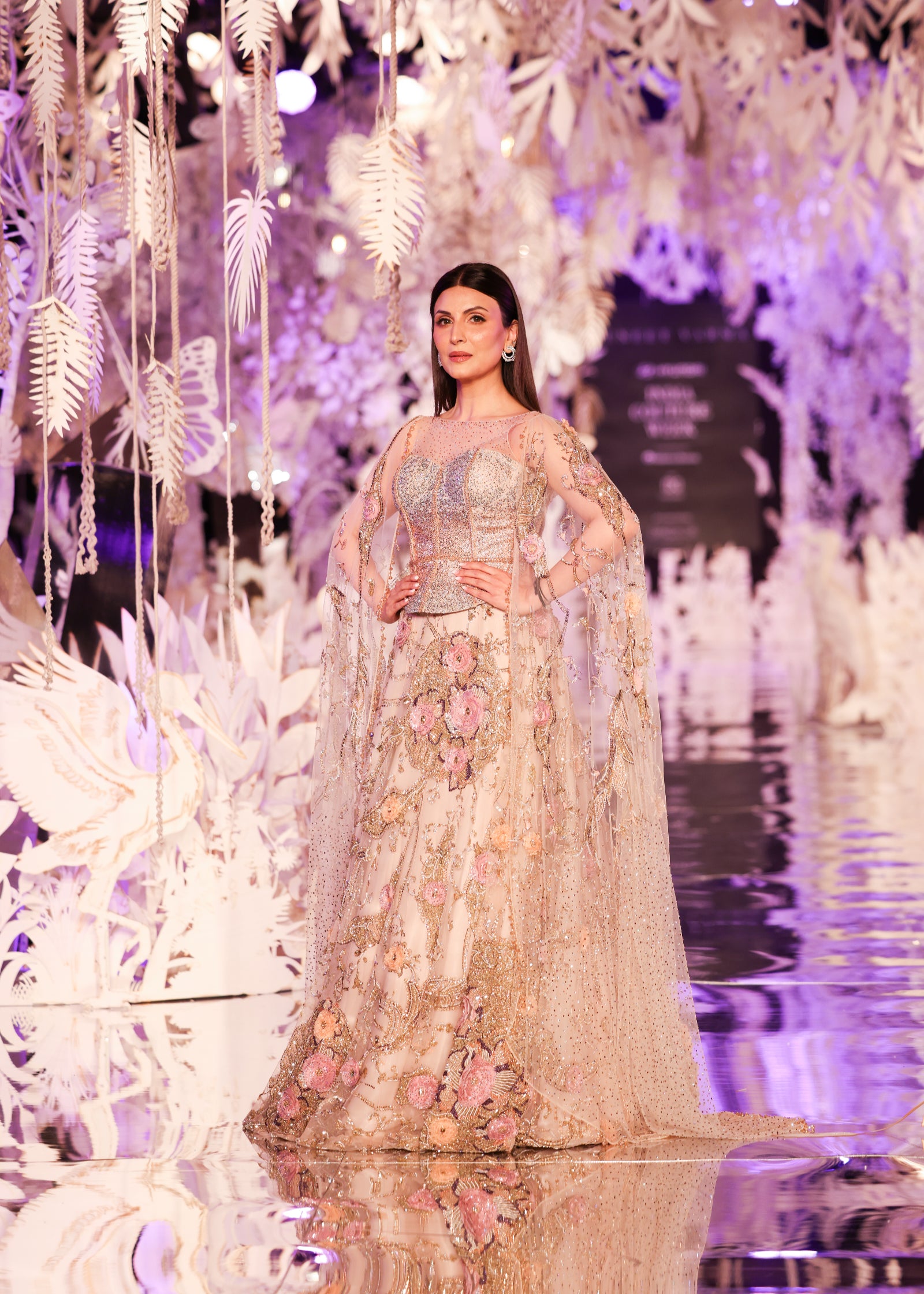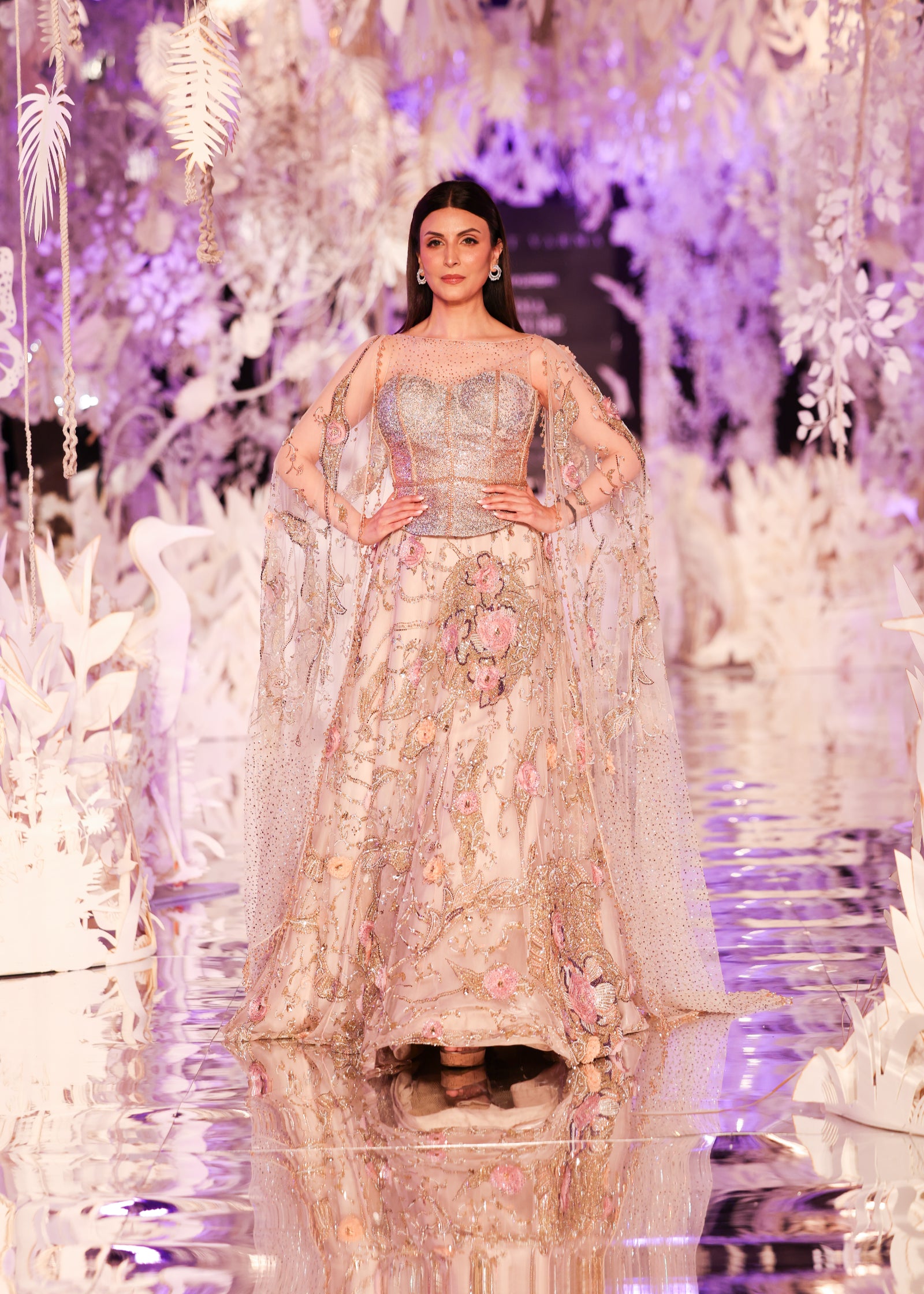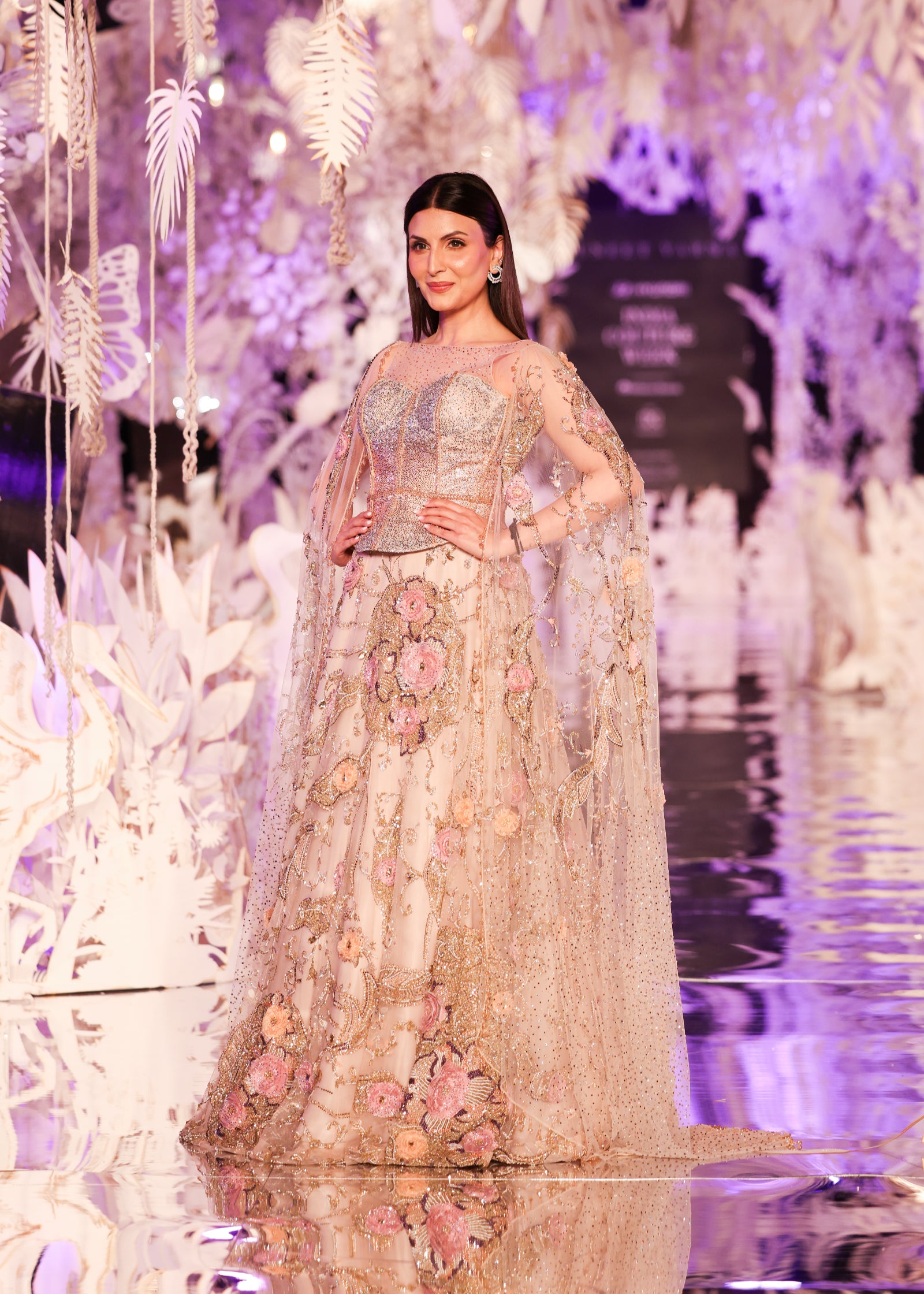 A romantic beige-toned lehenga adorned with 3D floral embroidery, swarovski embellishments, and gold threadwork. Paired with a glittering corset-style blouse and soft tulle cape sleeves that trail gracefully from the shoulders, this look blends classic elegance with contemporary flair. A perfect choice for wedding receptions, engagements, or luxury soirées.