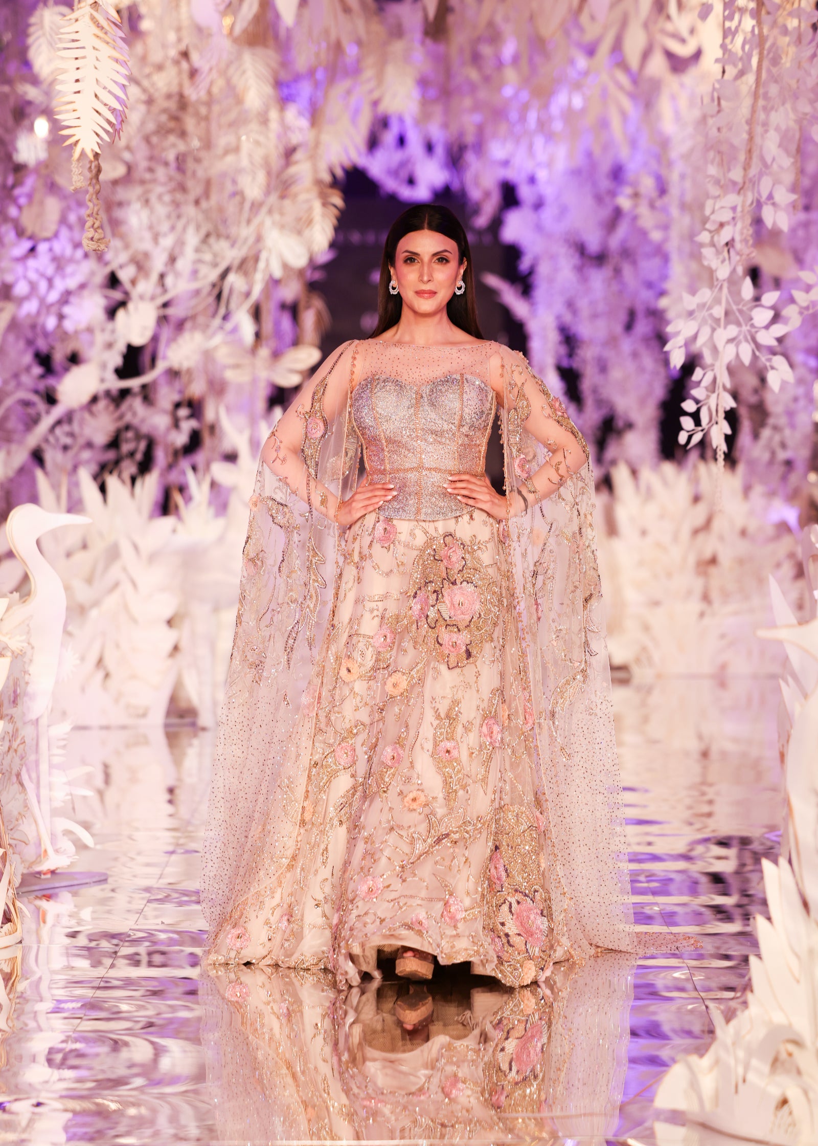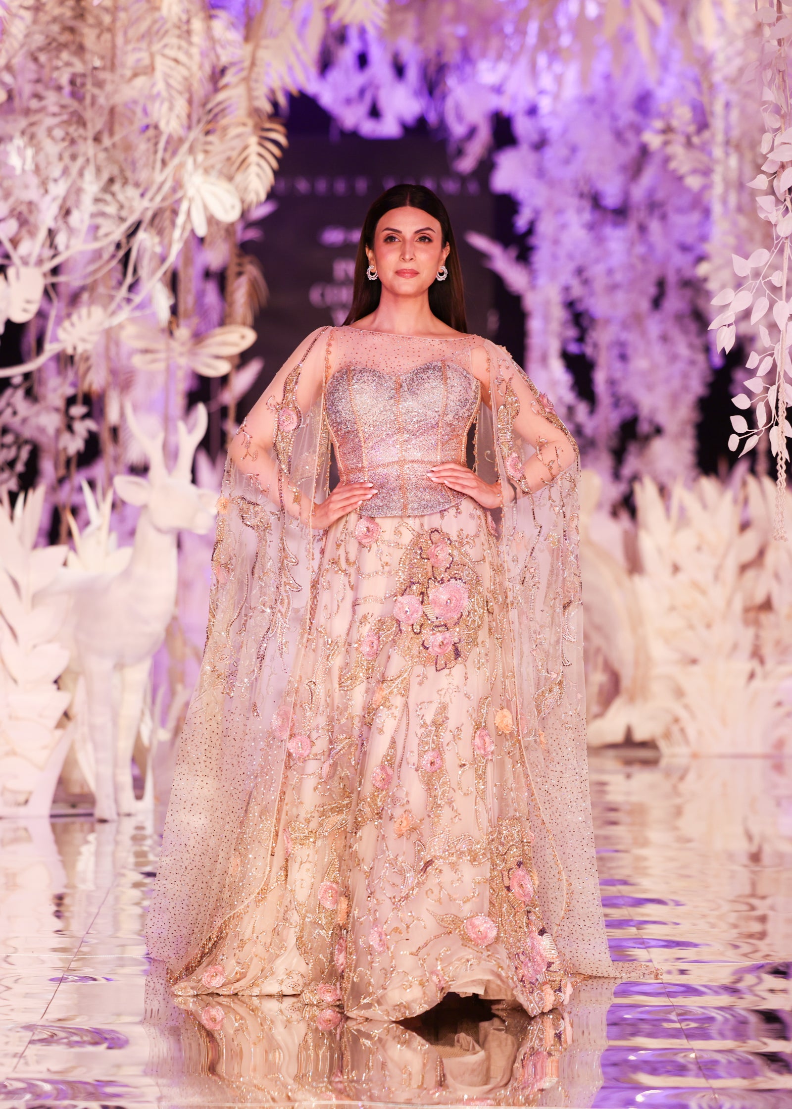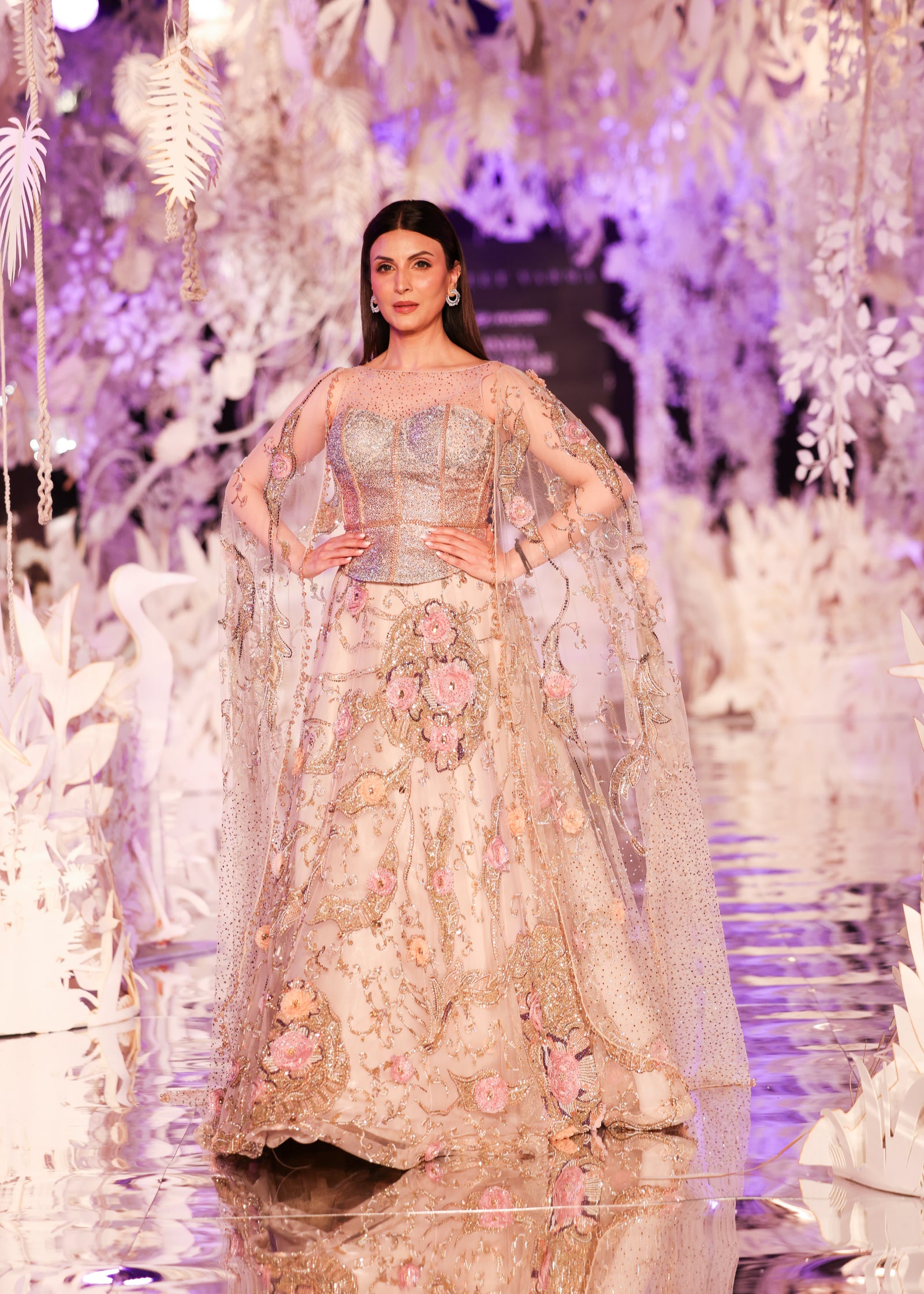 A romantic beige-toned lehenga adorned with 3D floral embroidery, swarovski embellishments, and gold threadwork. Paired with a glittering corset-style blouse and soft tulle cape sleeves that trail gracefully from the shoulders, this look blends classic elegance with contemporary flair. A perfect choice for wedding receptions, engagements, or luxury soirées.