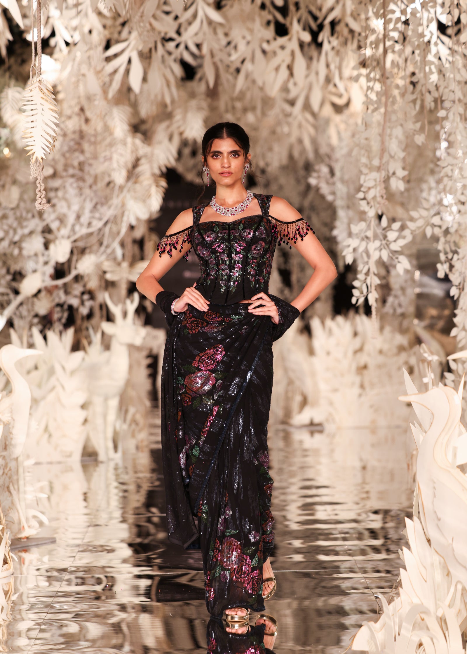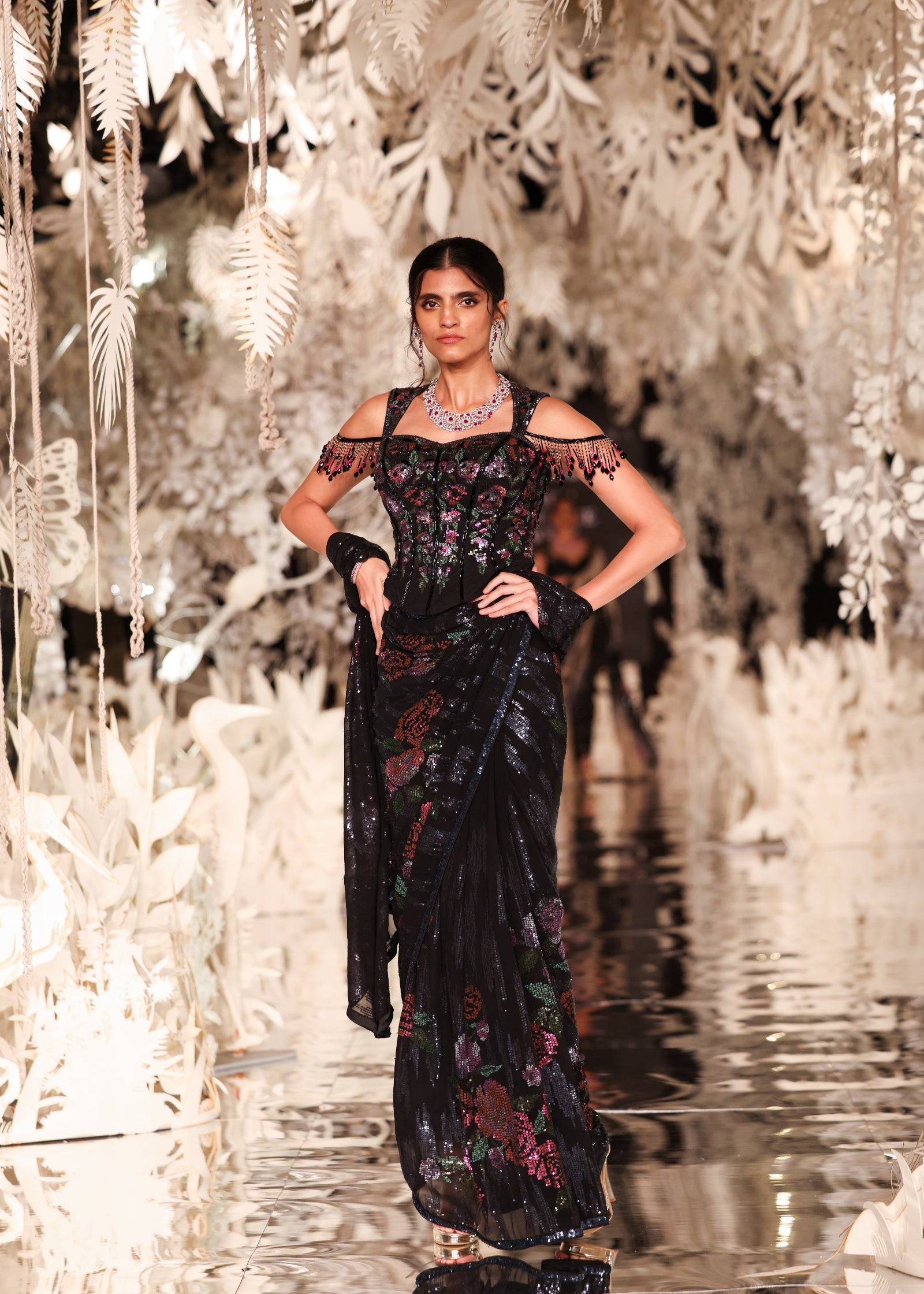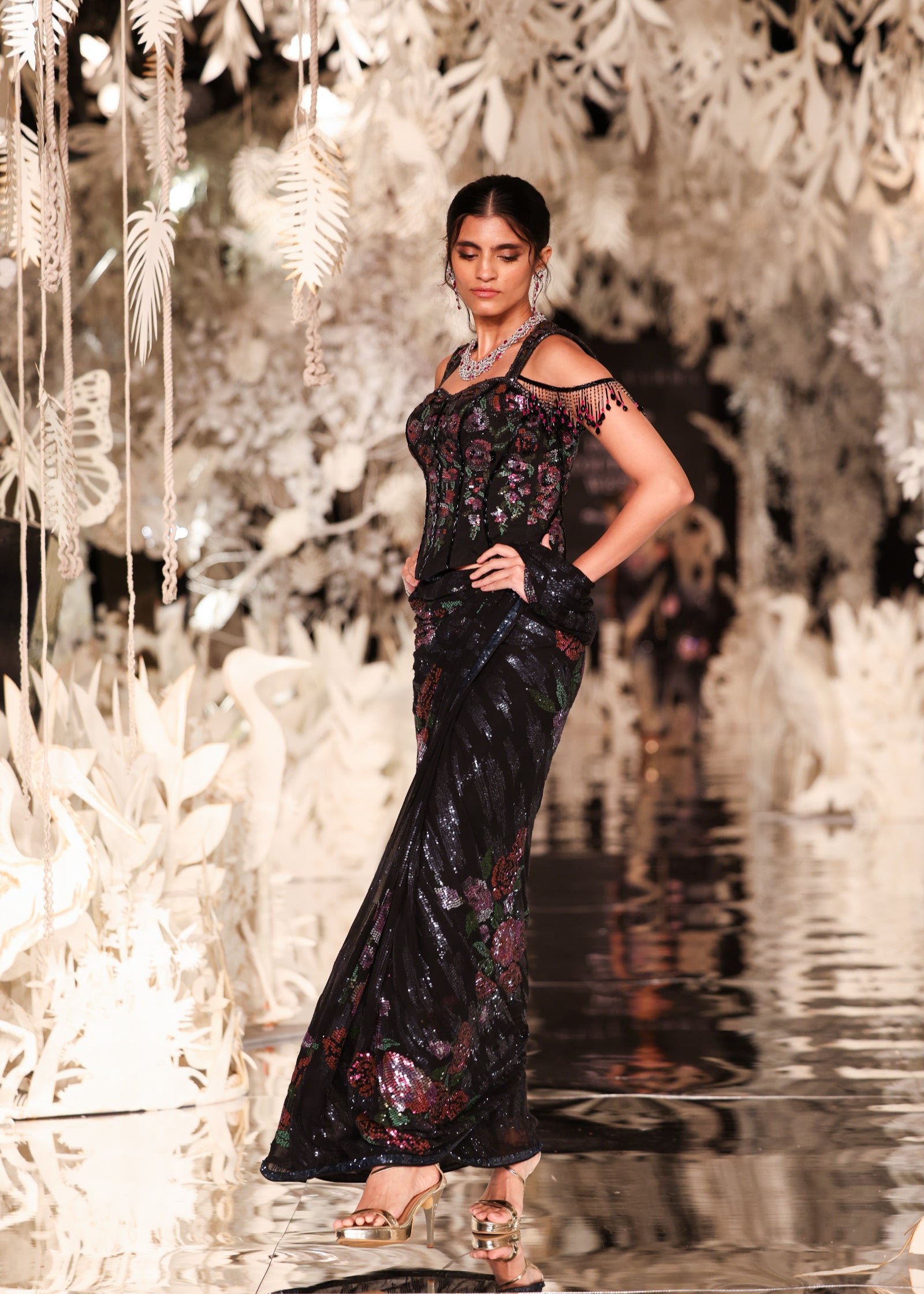 A contemporary and bold saree ensemble featuring a unique, sculpted blouse with a high, structured neckline and delicate, fringed cold shoulder blouse. The blouse is heavily embellished with rich floral embroidery. It is paired with a dark pre-draped saree featuring a striking floral and sequin pattern. This outfit is a perfect fusion of modern design and traditional craftsmanship.