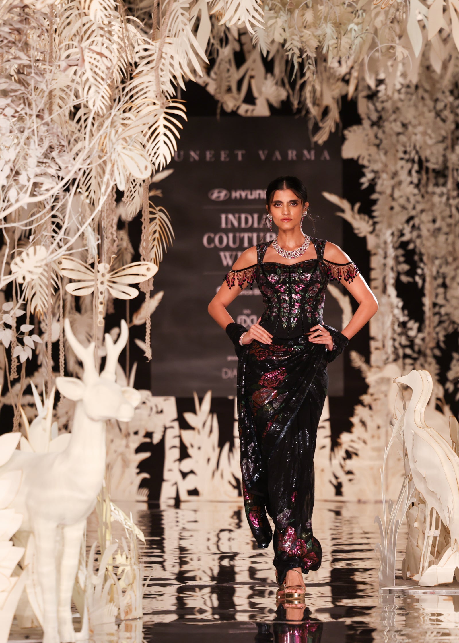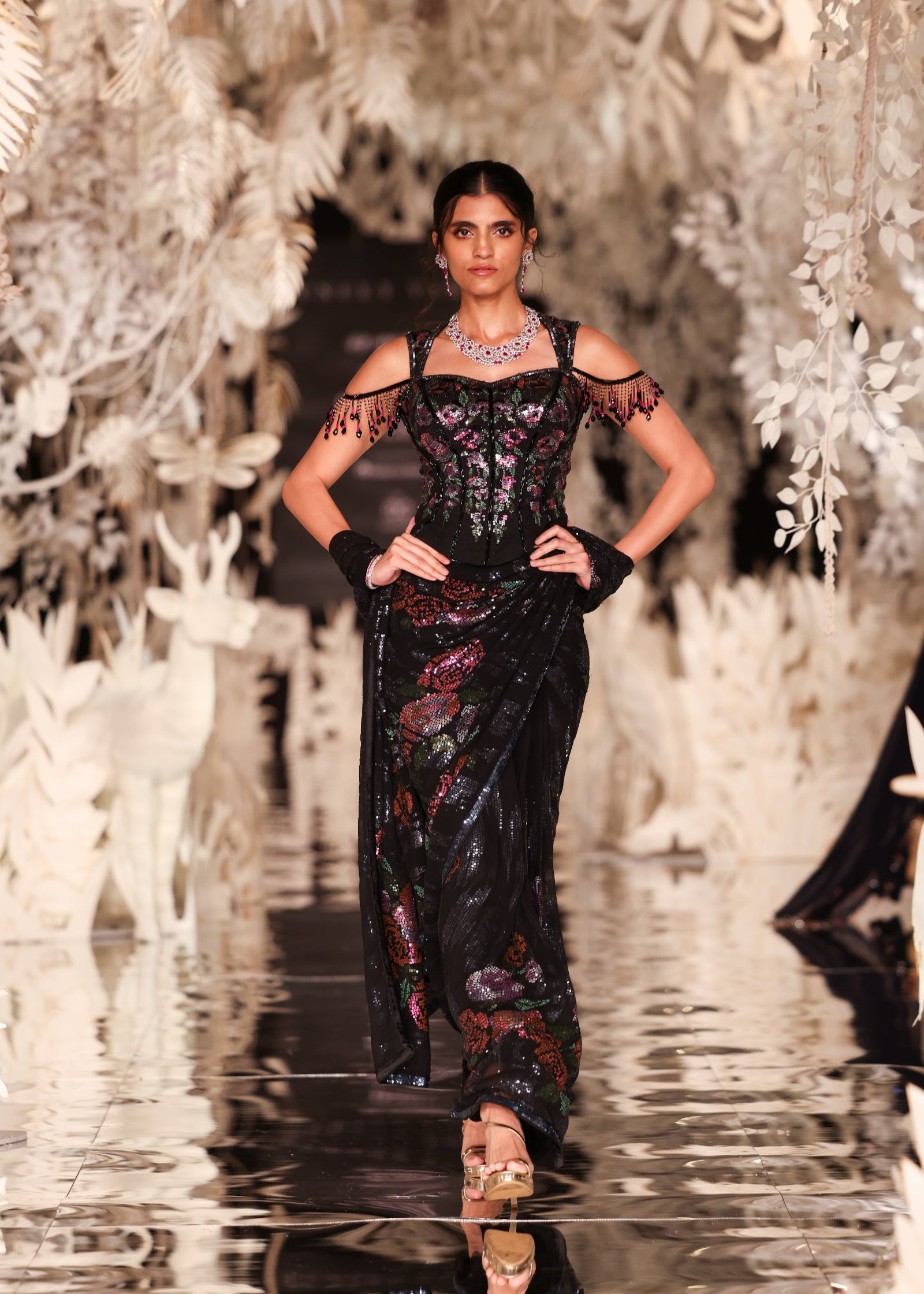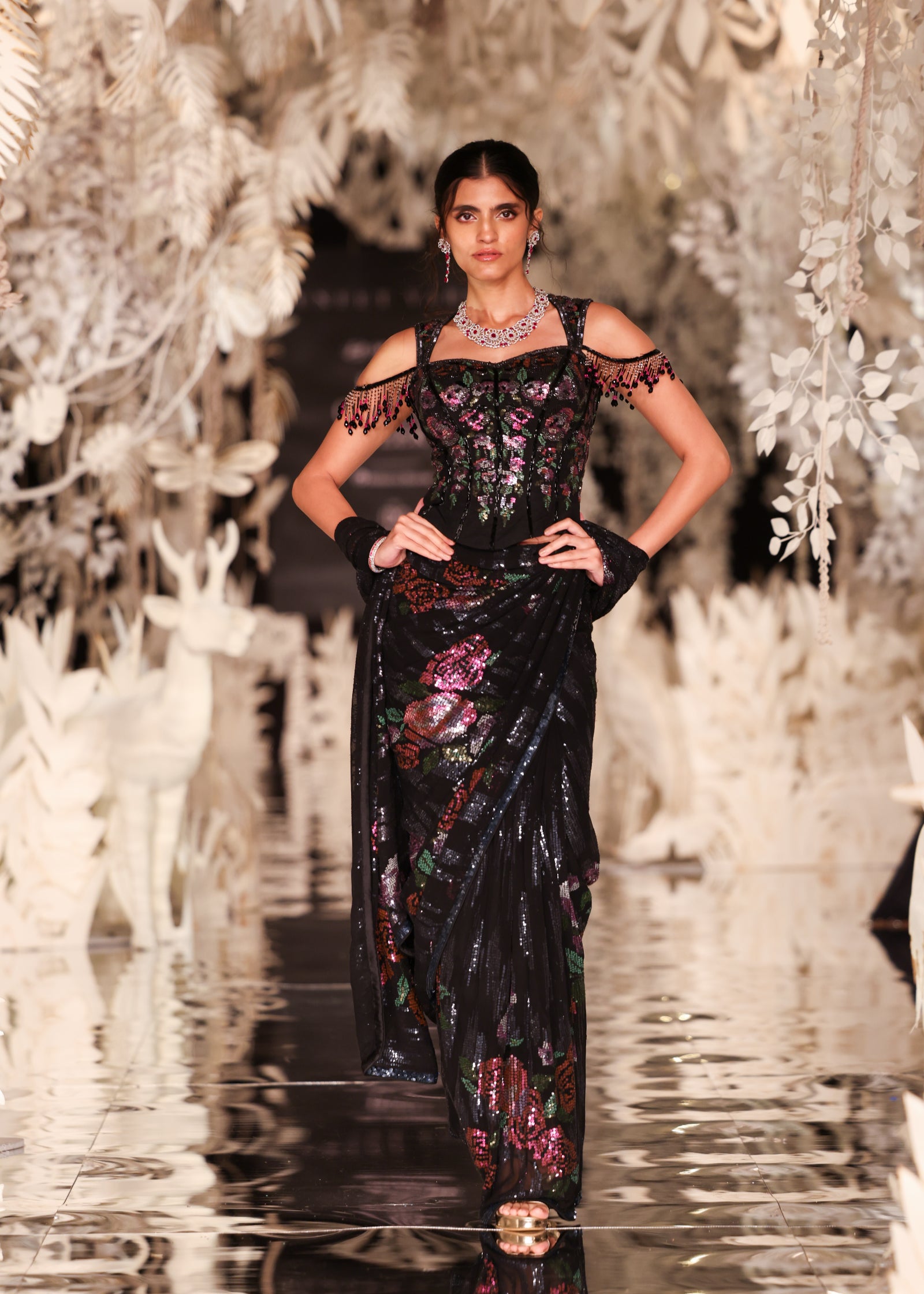 A contemporary and bold saree ensemble featuring a unique, sculpted blouse with a high, structured neckline and delicate, fringed cold shoulder blouse. The blouse is heavily embellished with rich floral embroidery. It is paired with a dark pre-draped saree featuring a striking floral and sequin pattern. This outfit is a perfect fusion of modern design and traditional craftsmanship.
