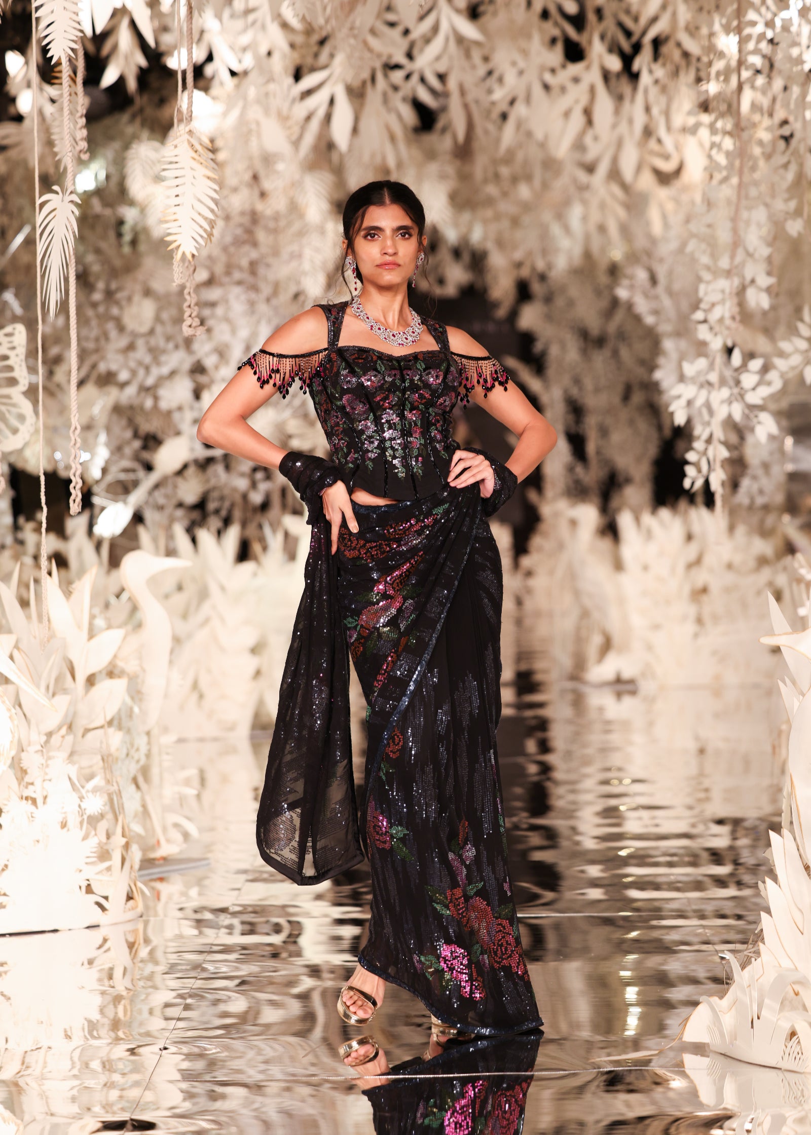 Black Rose Sheeting Saree with Corset-Cold Shoulder Blouse