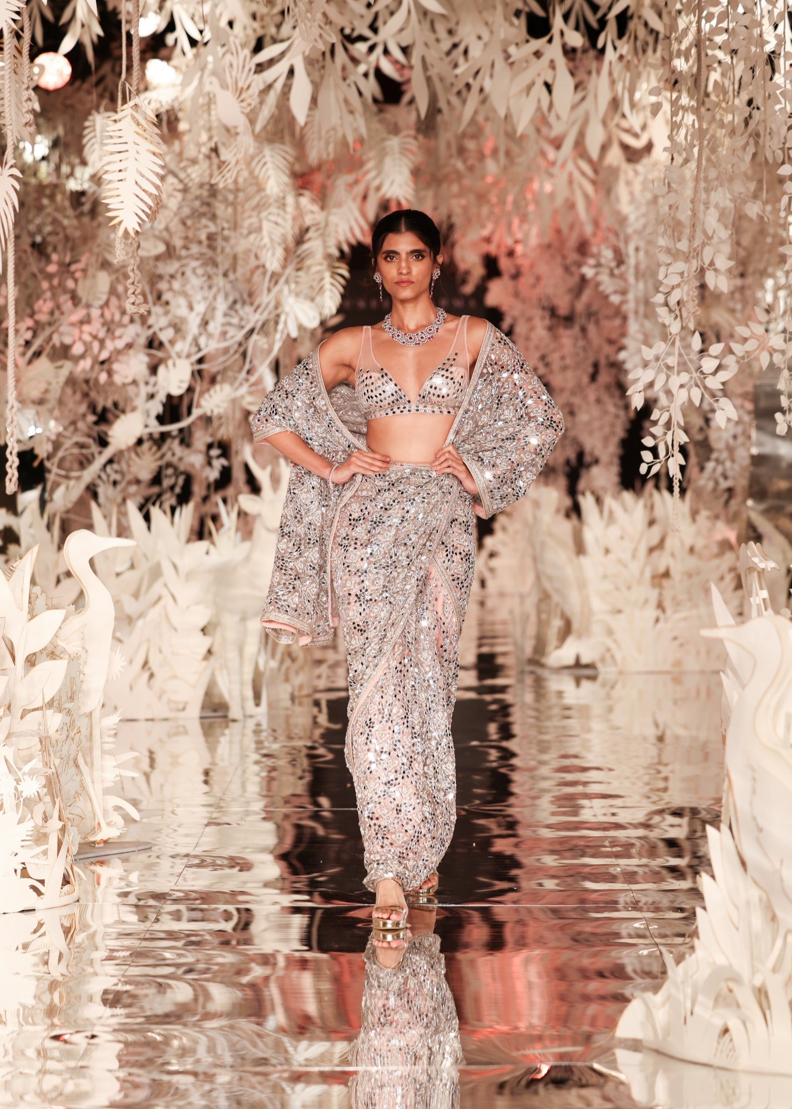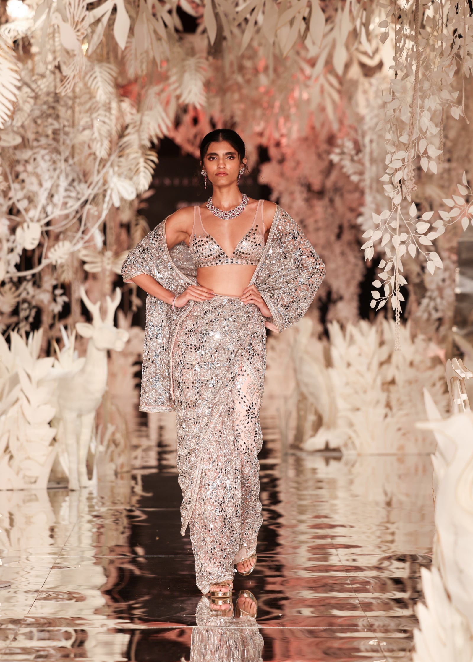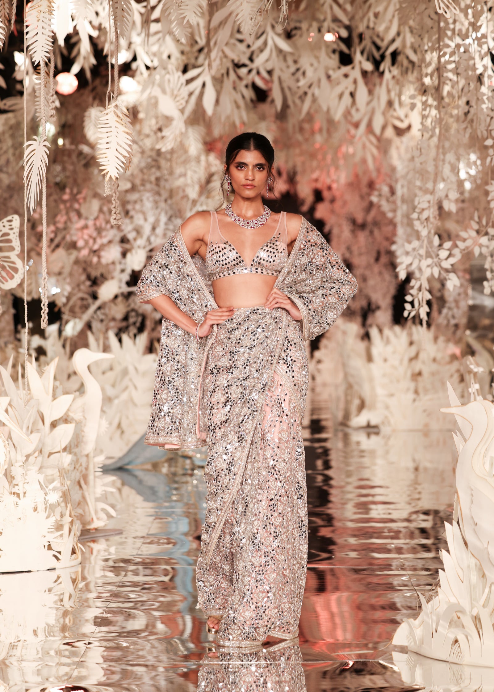 A blush pink saree hand-embroidered with shimmering mirror work and crystals. The saree is styled with a sculpted bralette blouse. Designed for the contemporary woman, this saree balances tradition with bold glamour — ideal for evening celebrations or a bridal cocktail look.