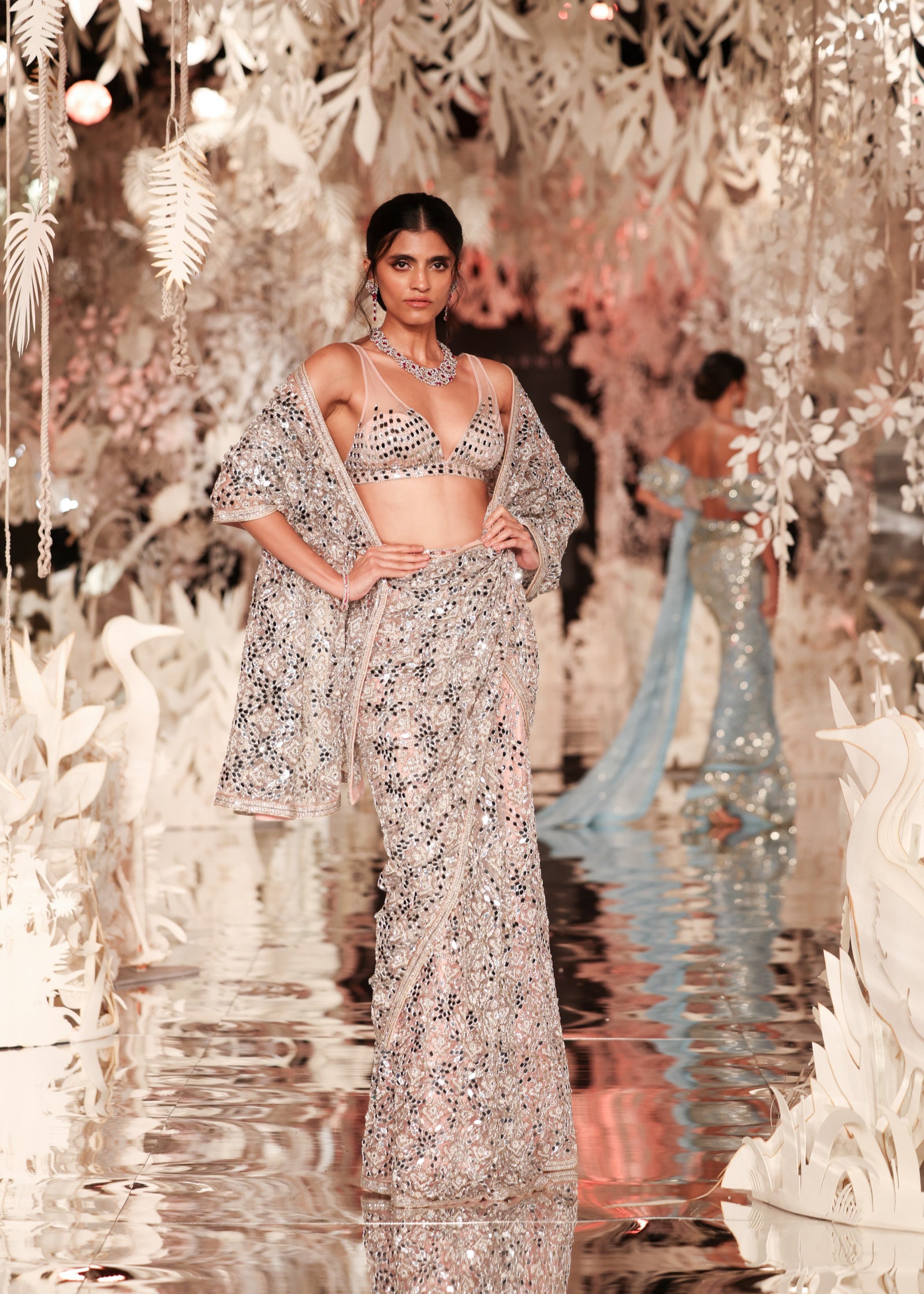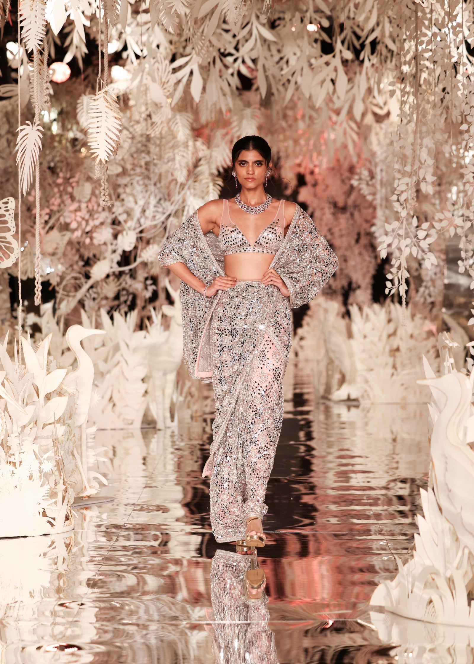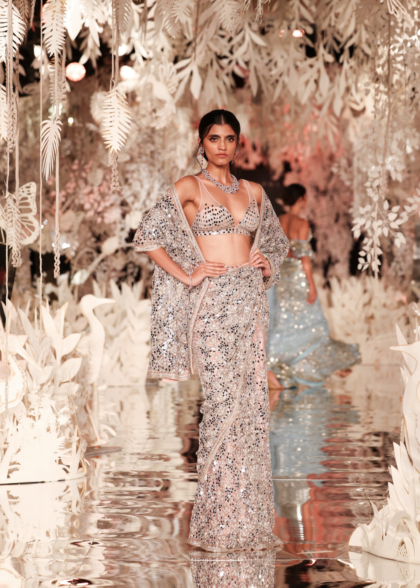 A blush pink saree hand-embroidered with shimmering mirror work and crystals. The saree is styled with a sculpted bralette blouse. Designed for the contemporary woman, this saree balances tradition with bold glamour — ideal for evening celebrations or a bridal cocktail look.