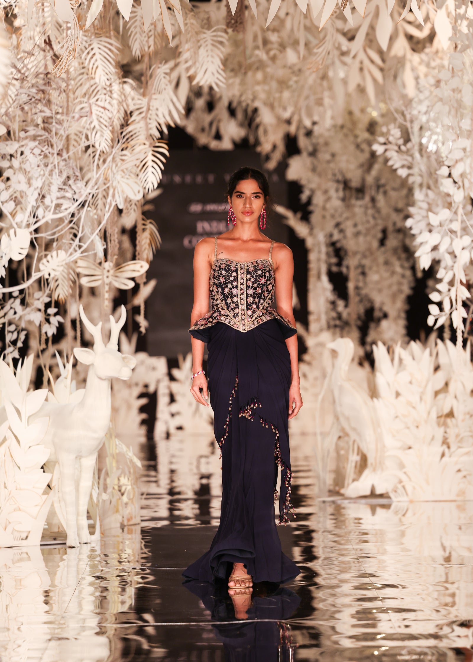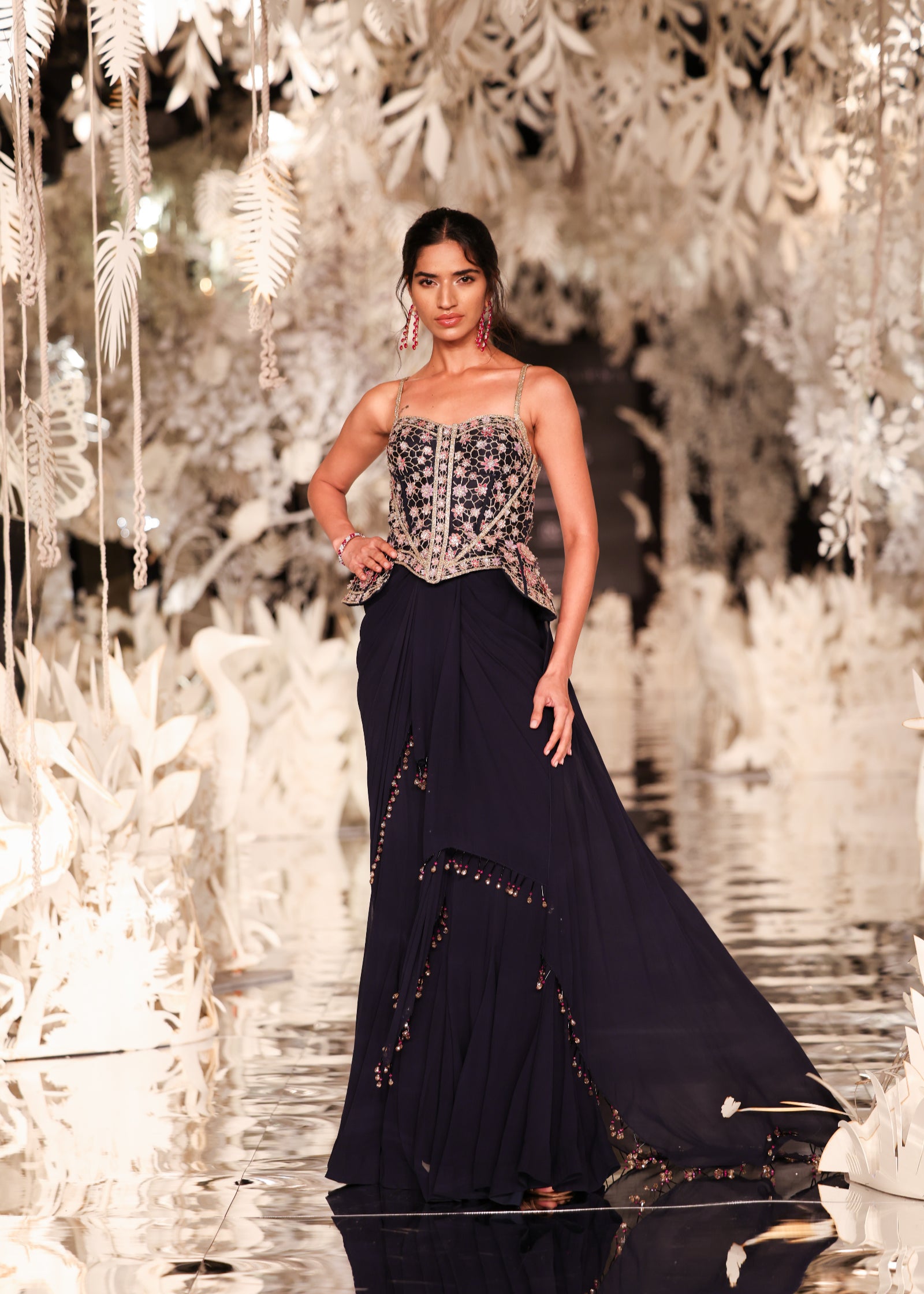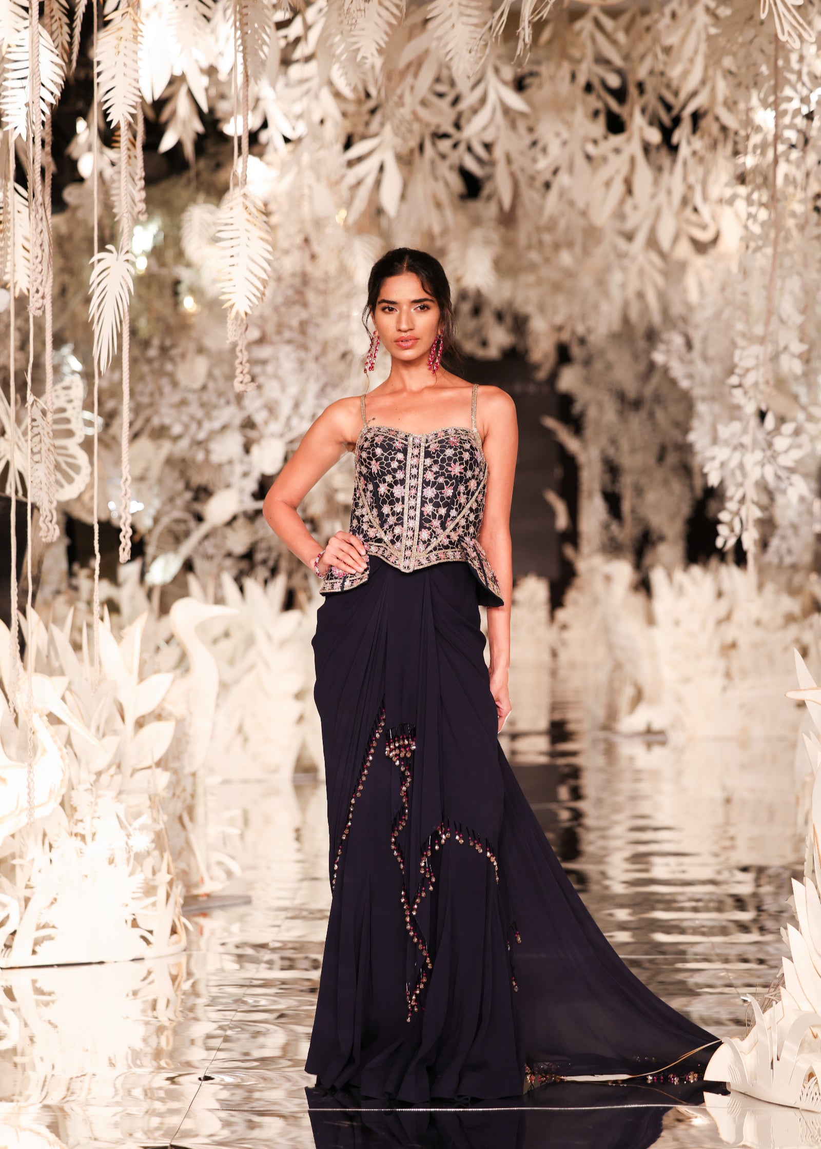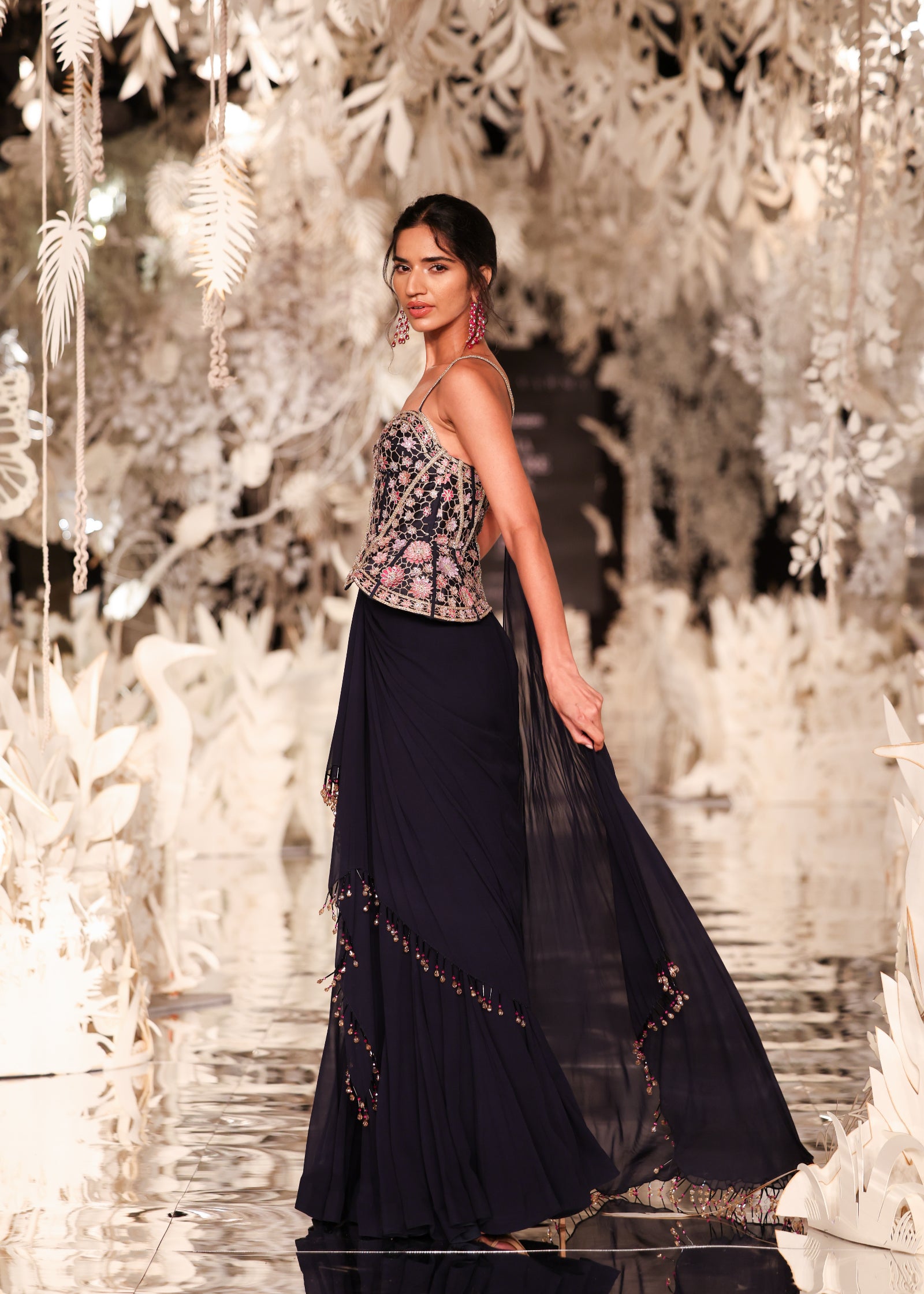 A modern and graceful drape skirt ensemble featuring a structured corset-style peplum top. The top is a work of art, with intricate floral embroidery in pink, purple, and blue. It is paired with a flowing, navy blue pre-draped skirt, creating a flattering and sophisticated silhouette. This outfit is ideal for a cocktail party or a formal evening.