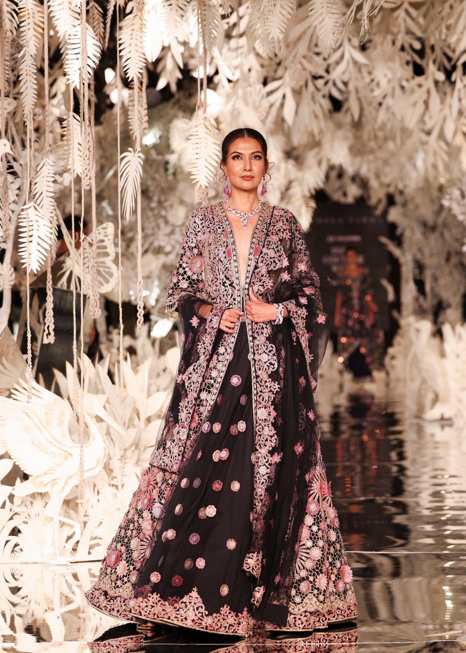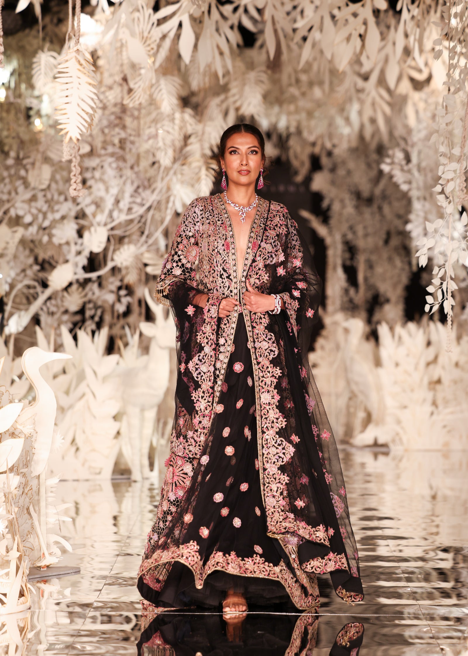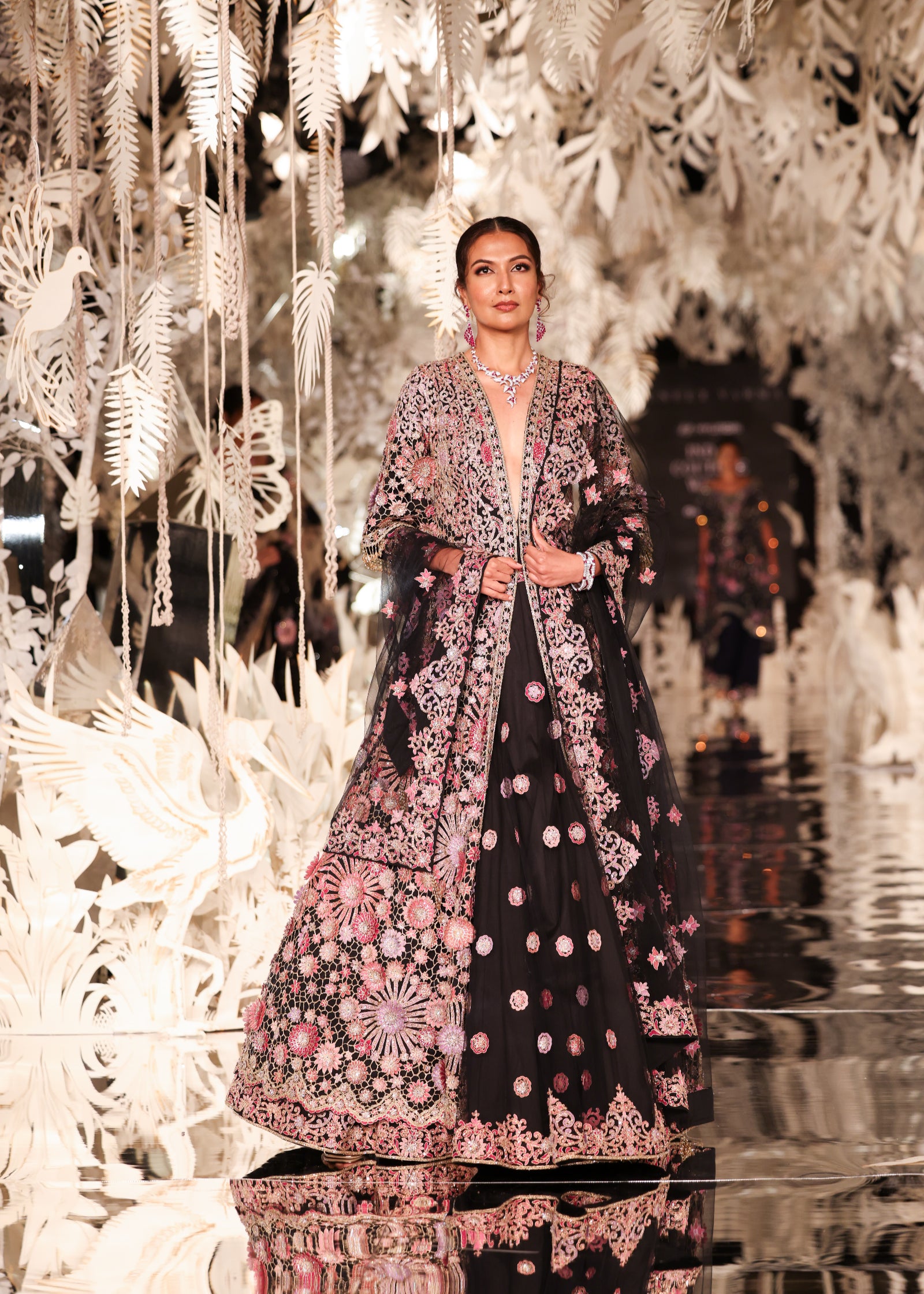 A majestic black lehenga set featuring a full-length, open-front jacket. The jacket is a masterpiece of craftsmanship, with intricate floral embroidery in shades of pink and gold. It is worn over a lehenga skirt with scattered sequin motifs. A matching sheer dupatta with embroidered details adds a final touch of grace. This opulent outfit is ideal for a wedding or a grand celebration.