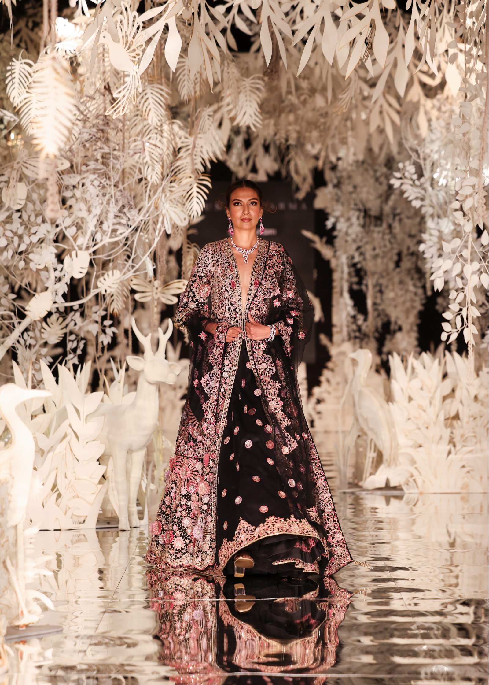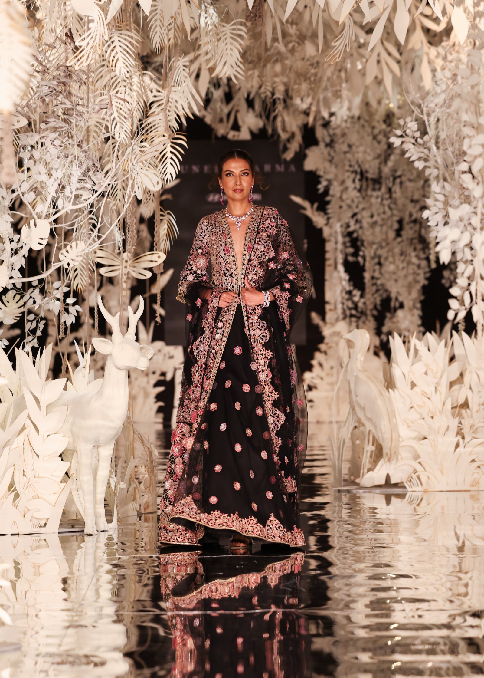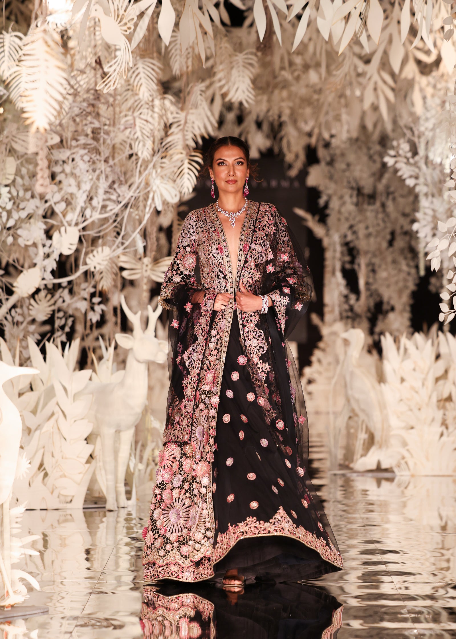 A majestic black lehenga set featuring a full-length, open-front jacket. The jacket is a masterpiece of craftsmanship, with intricate floral embroidery in shades of pink and gold. It is worn over a lehenga skirt with scattered sequin motifs. A matching sheer dupatta with embroidered details adds a final touch of grace. This opulent outfit is ideal for a wedding or a grand celebration.