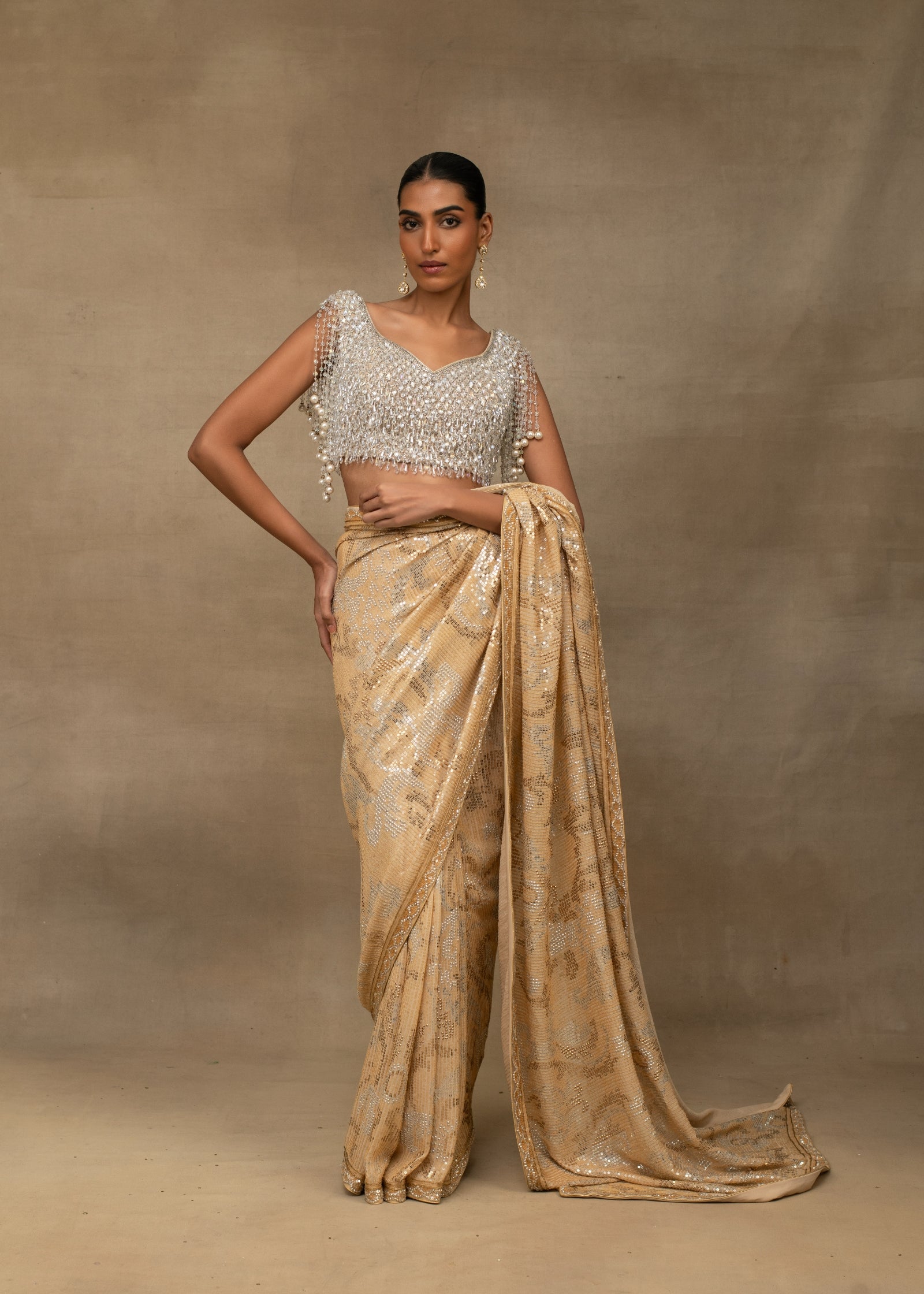 A shimmering gold saree adorned with intricate sequin work in elegant patterns, offering a luxurious drape. It is paired with a stylish V-neck blouse, heavily embellished with silver beads and cascading pearl fringes on the sleeves. This glamorous ensemble is perfect for receptions, cocktails, or festive celebrations.