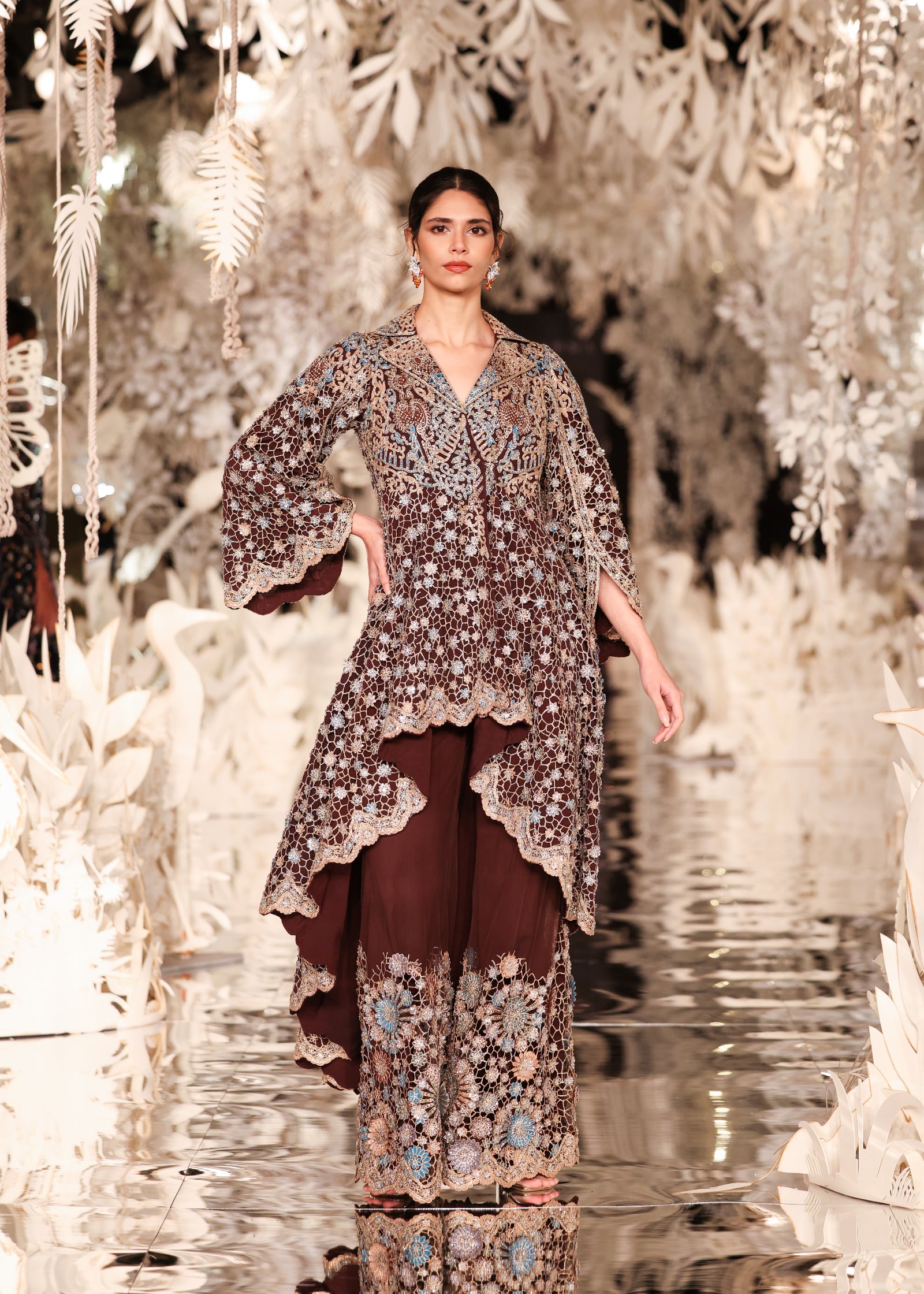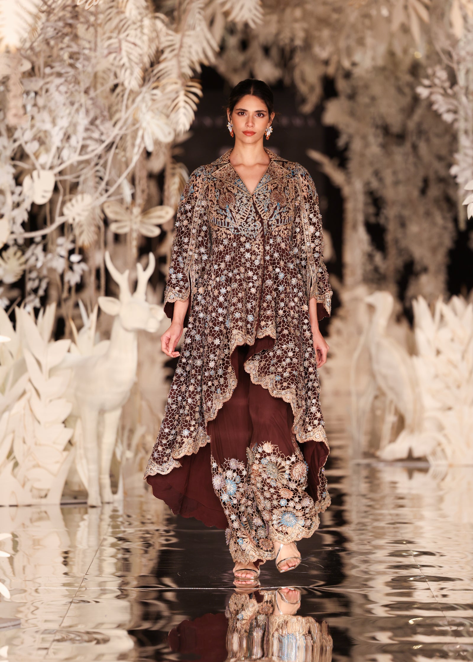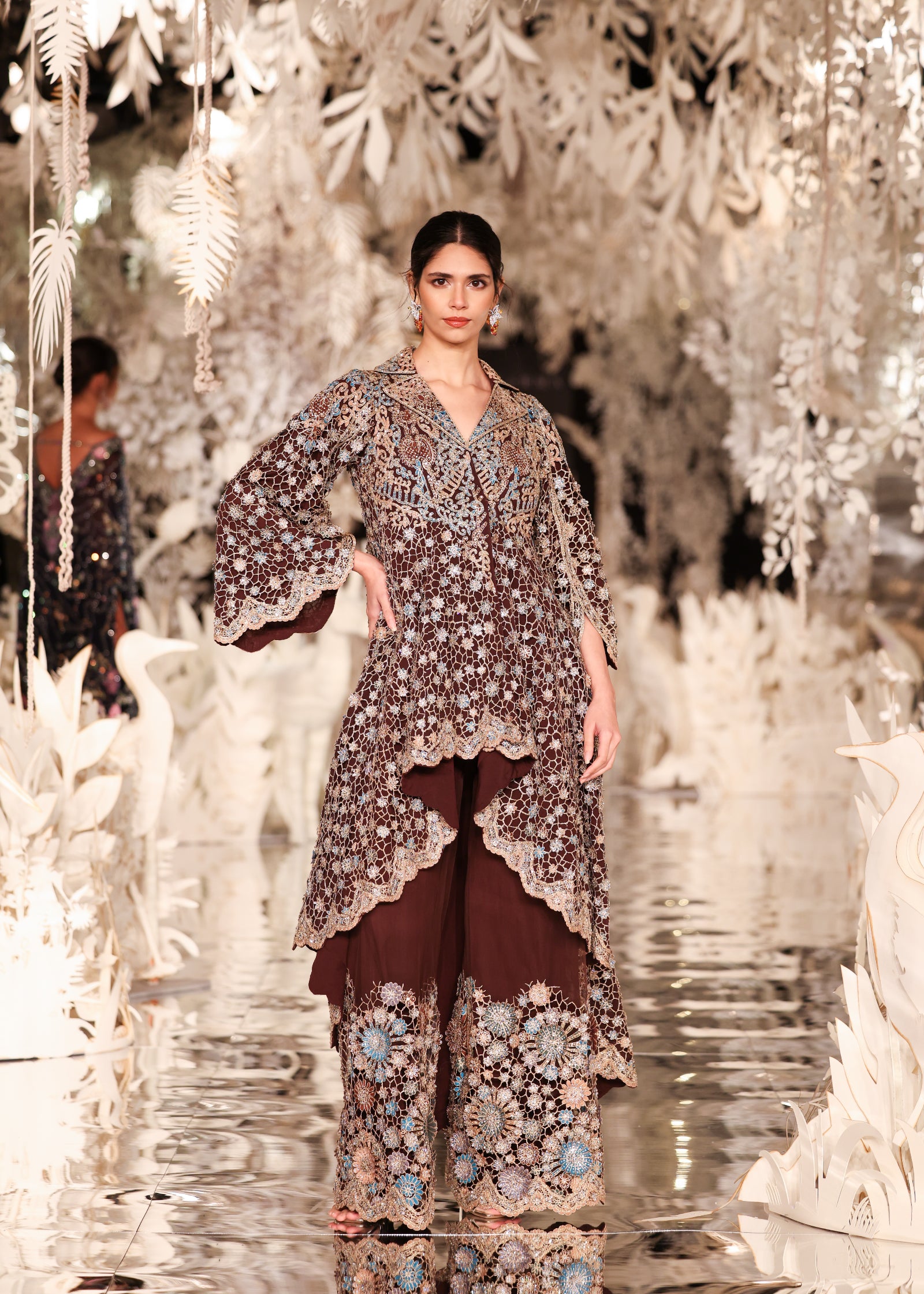 A sophisticated and flowing long jacket, featuring an elegant high-low hemline. The jacket is a deep brown and is lavishly embroidered with a mix of floral and paisley motifs in shades of blue, white, and gold. This versatile piece is worn over matching pants, making it a stylish choice for a sangeet or a formal event.