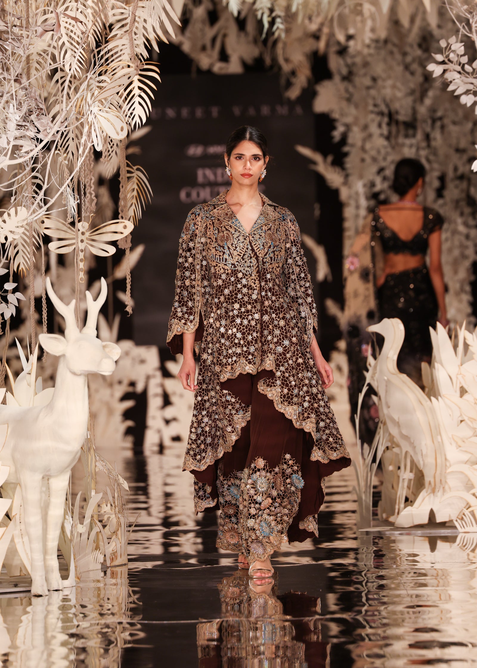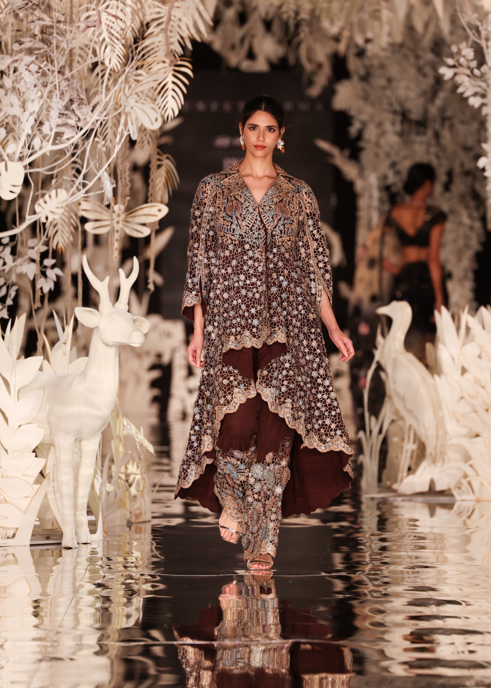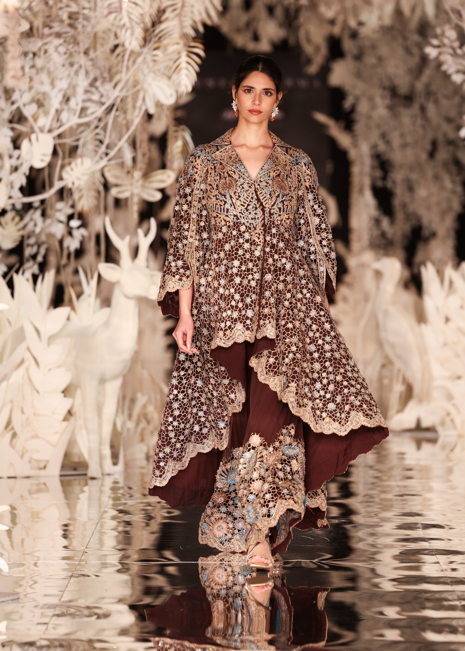 A sophisticated and flowing long jacket, featuring an elegant high-low hemline. The jacket is a deep brown and is lavishly embroidered with a mix of floral and paisley motifs in shades of blue, white, and gold. This versatile piece is worn over matching pants, making it a stylish choice for a sangeet or a formal event.