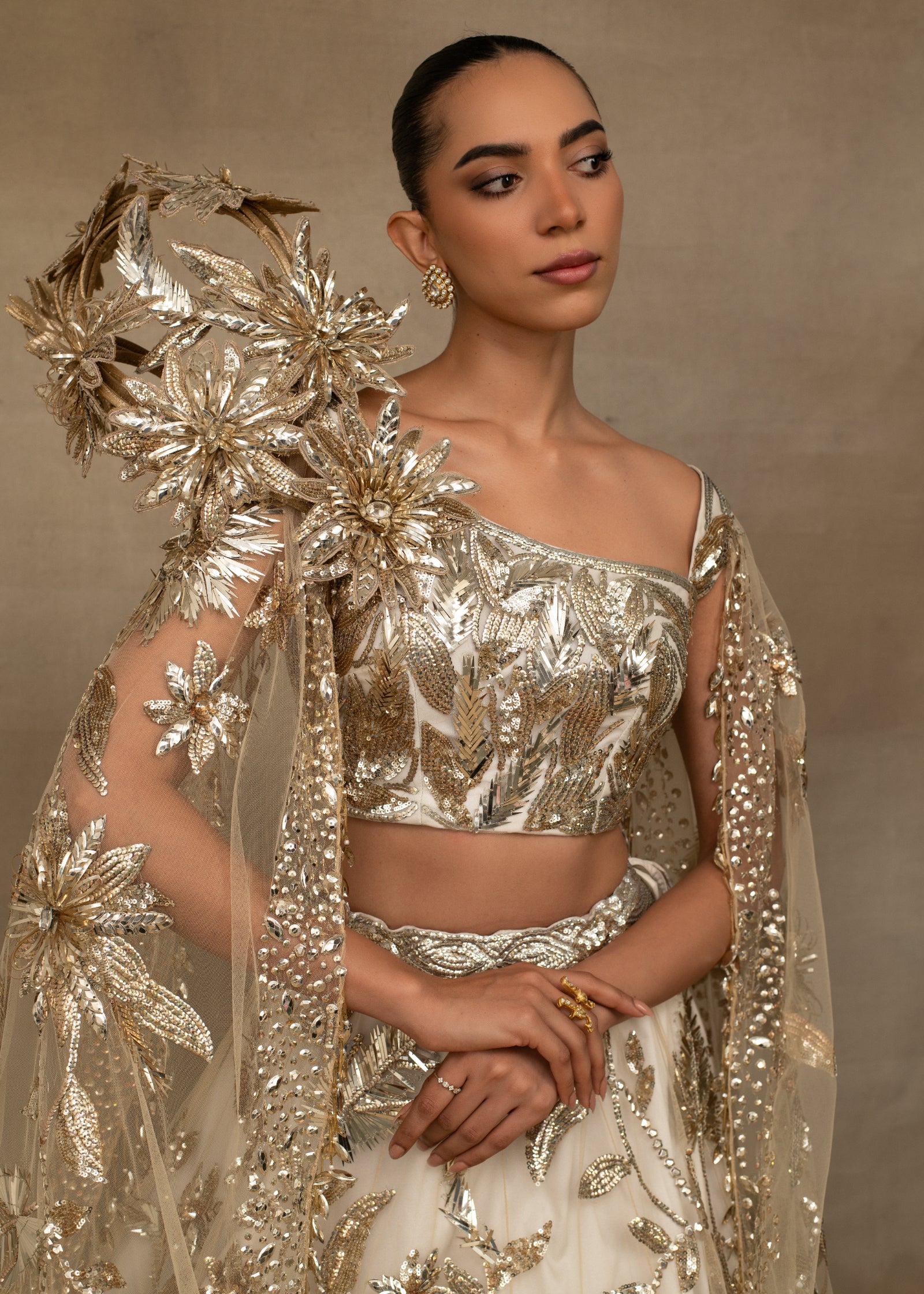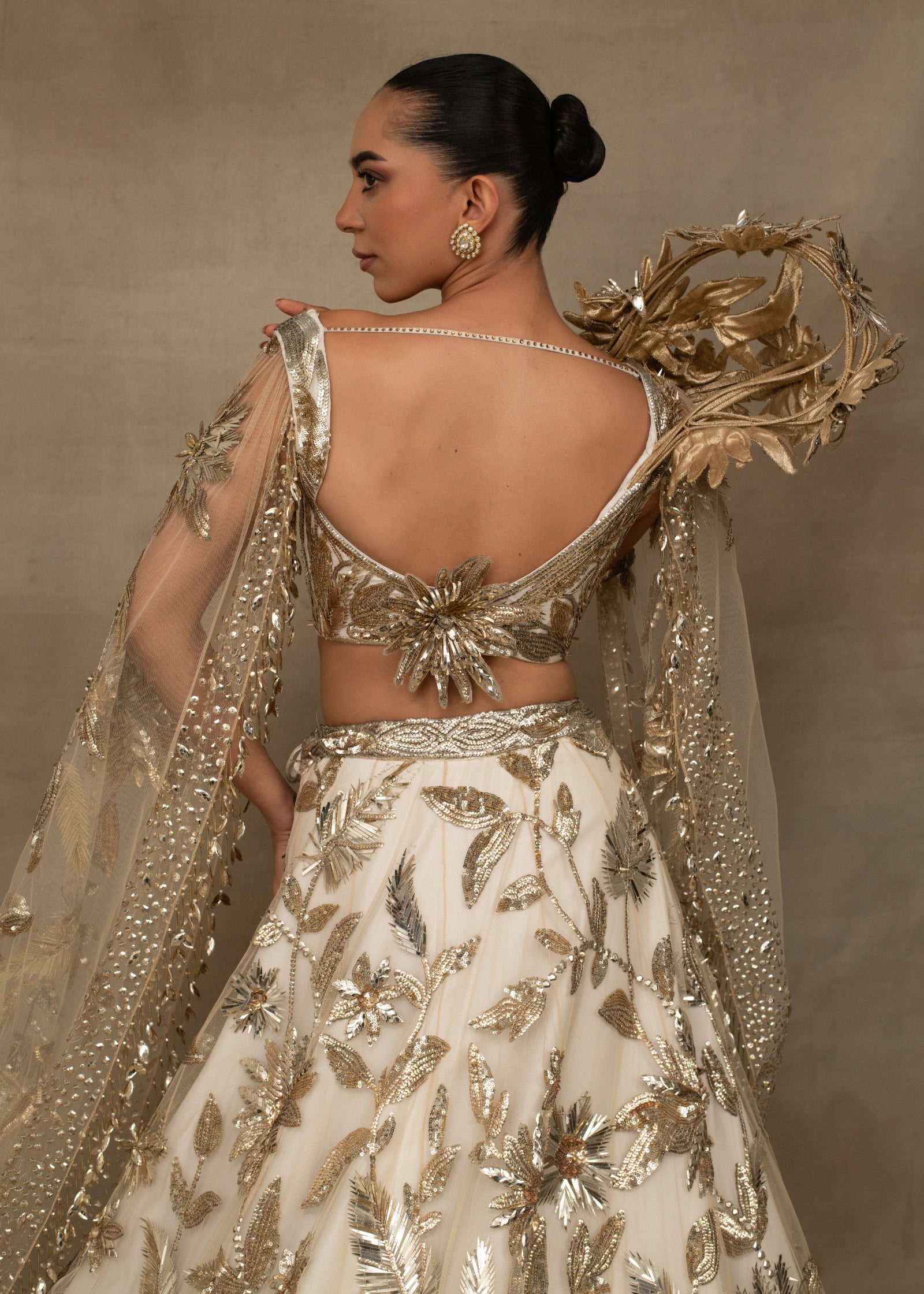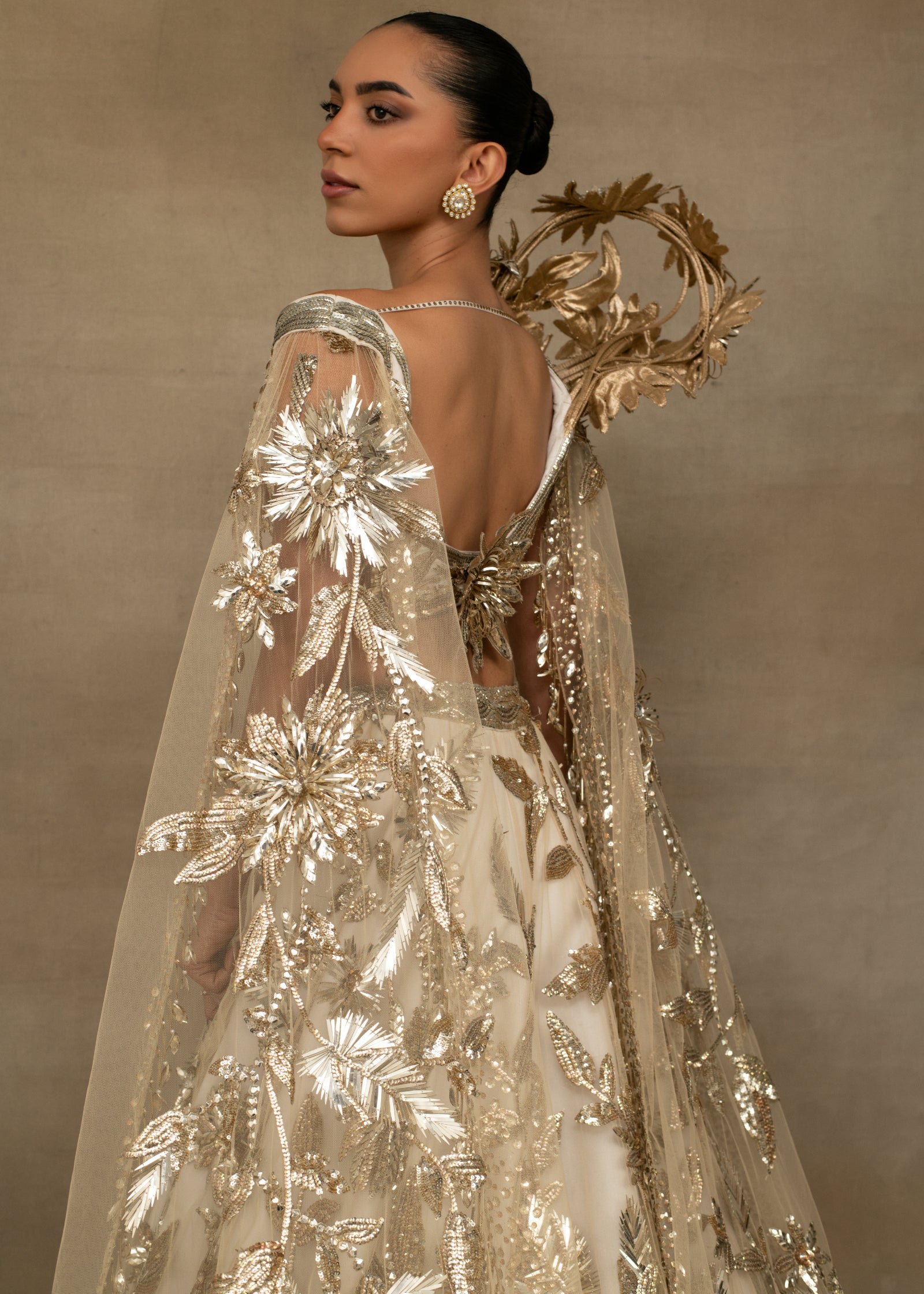 A breathtaking ivory lehenga, resplendent with intricate gold floral embroidery and sequin work. The lehenga features a dramatic, extended train and a unique statement shoulder detail with an attached flowing cape, adding a regal and modern touch. This exquisite piece is perfect for grand receptions, red carpet events, or bridal ceremonies.