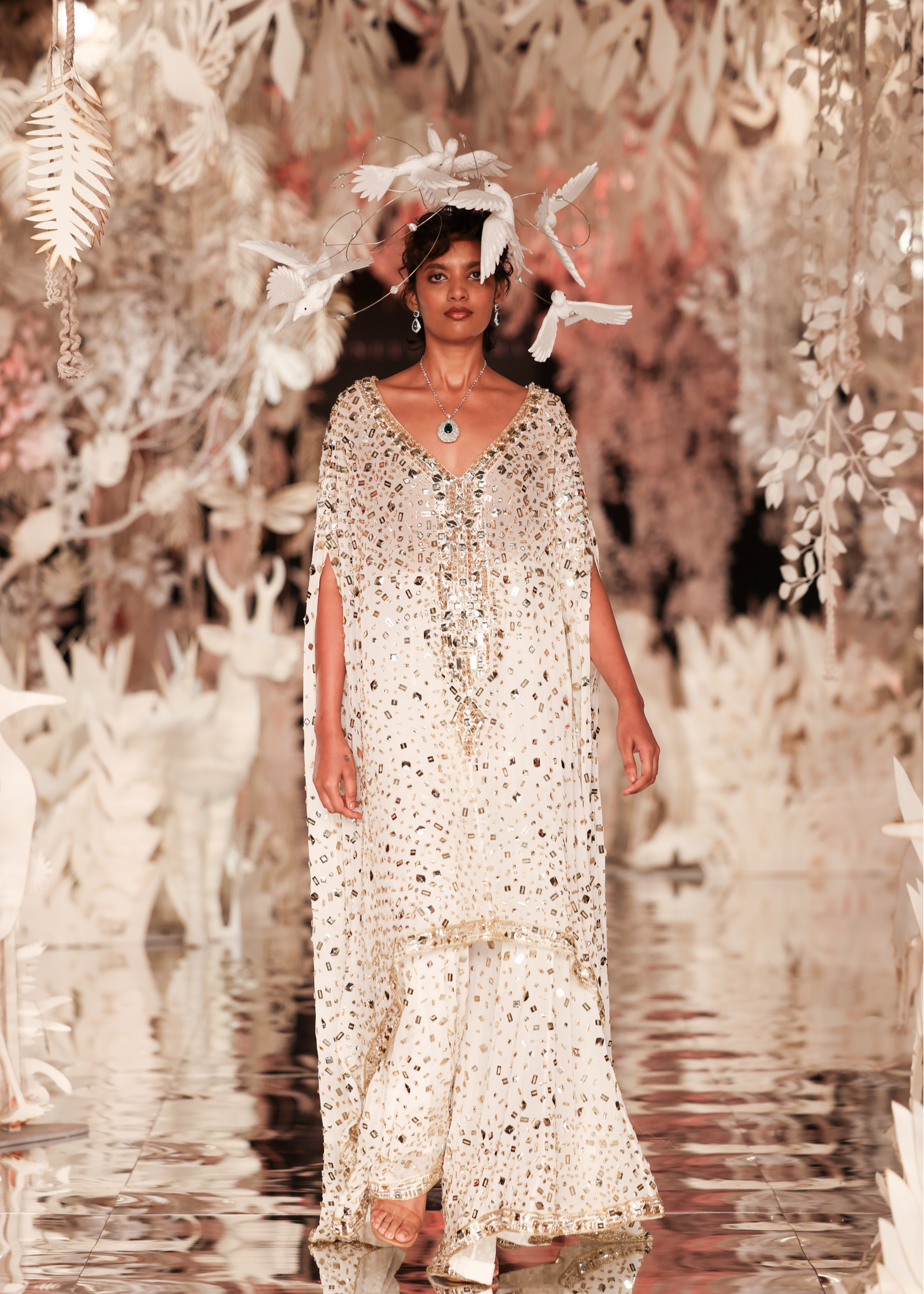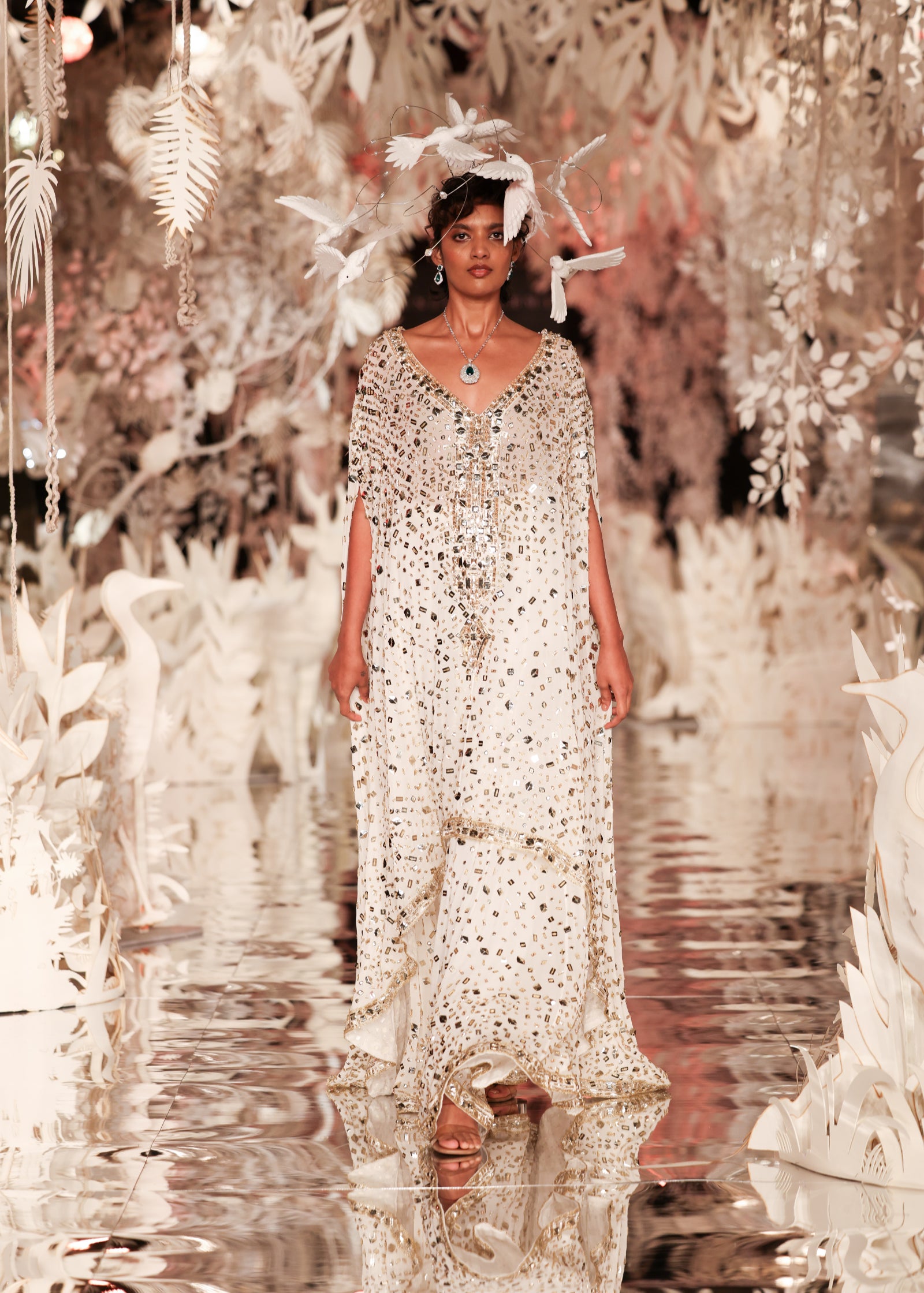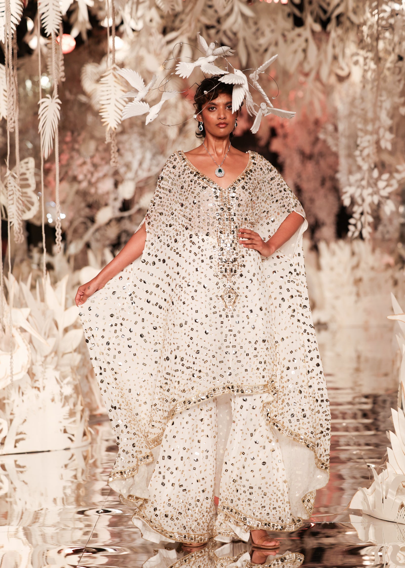 A stunning Kaftan in elegant ivory, lavishly adorned with a mosaic of silver and gold square embellishments, forming an intricate all-over pattern. This free-flowing silhouette features a deep V-neckline and a stylish high-low hem, making it a sophisticated and comfortable choice for a resort party or a formal evening.