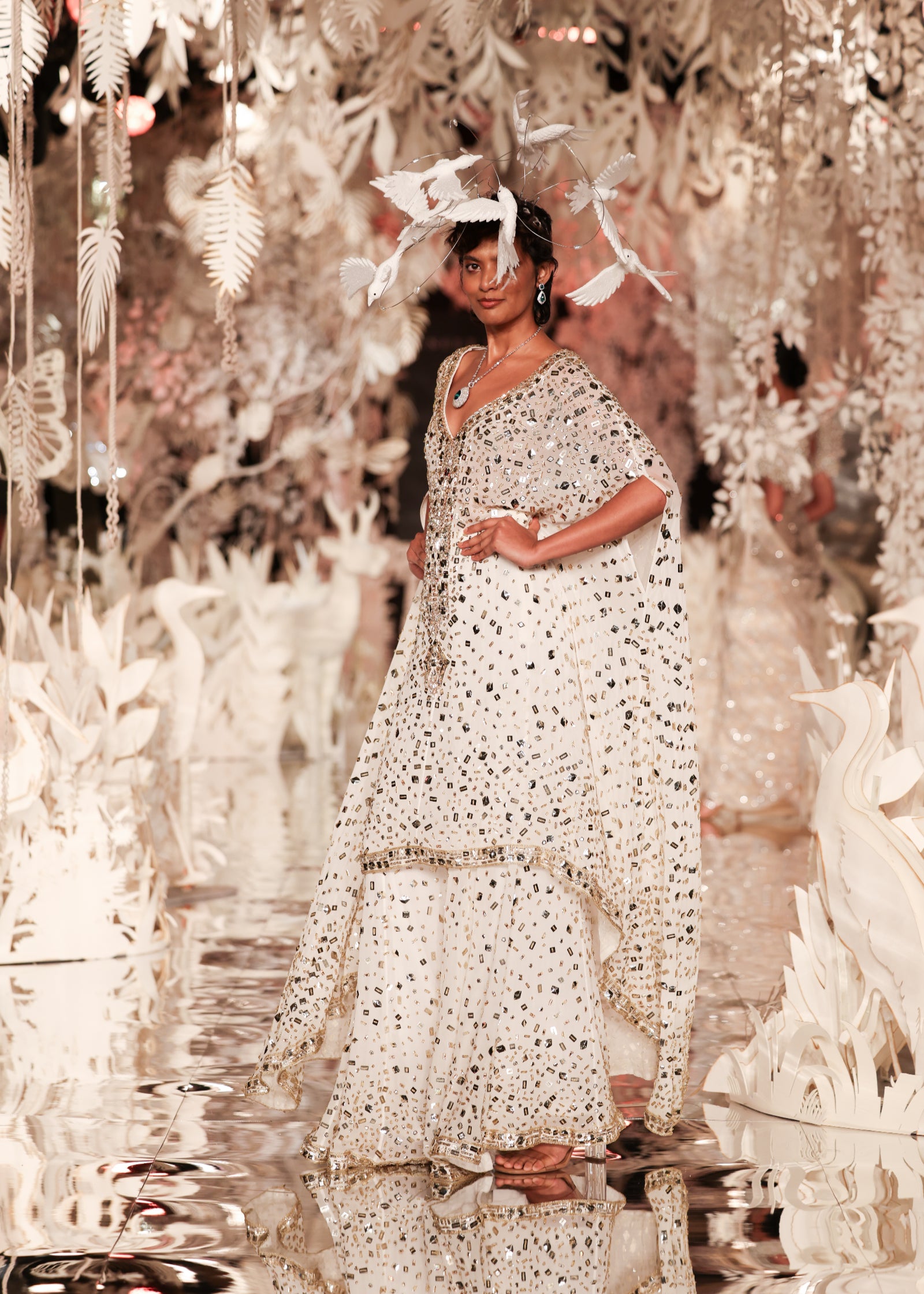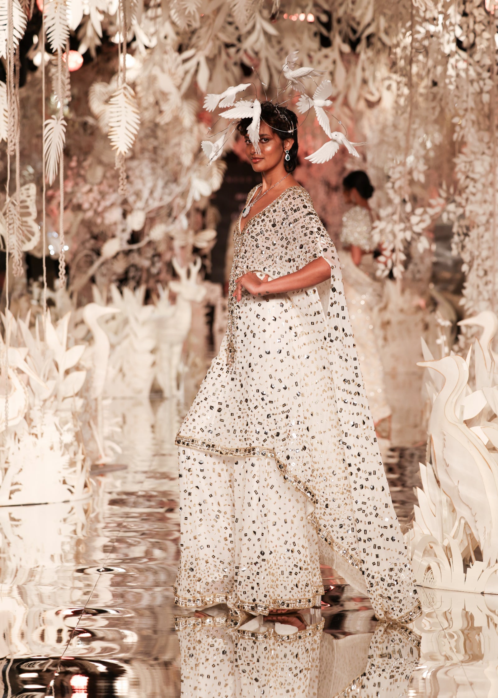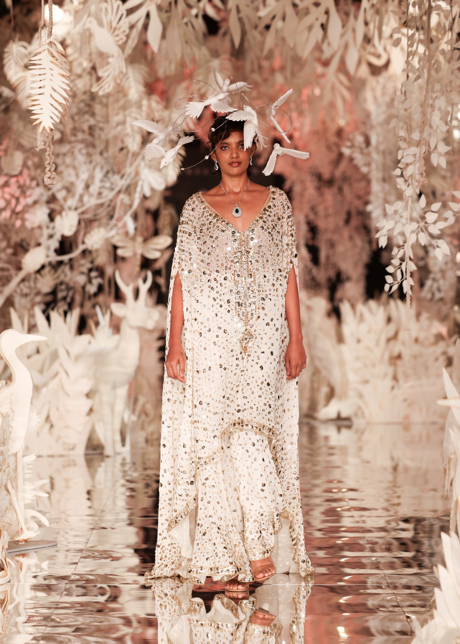 A stunning Kaftan in elegant ivory, lavishly adorned with a mosaic of silver and gold square embellishments, forming an intricate all-over pattern. This free-flowing silhouette features a deep V-neckline and a stylish high-low hem, making it a sophisticated and comfortable choice for a resort party or a formal evening.