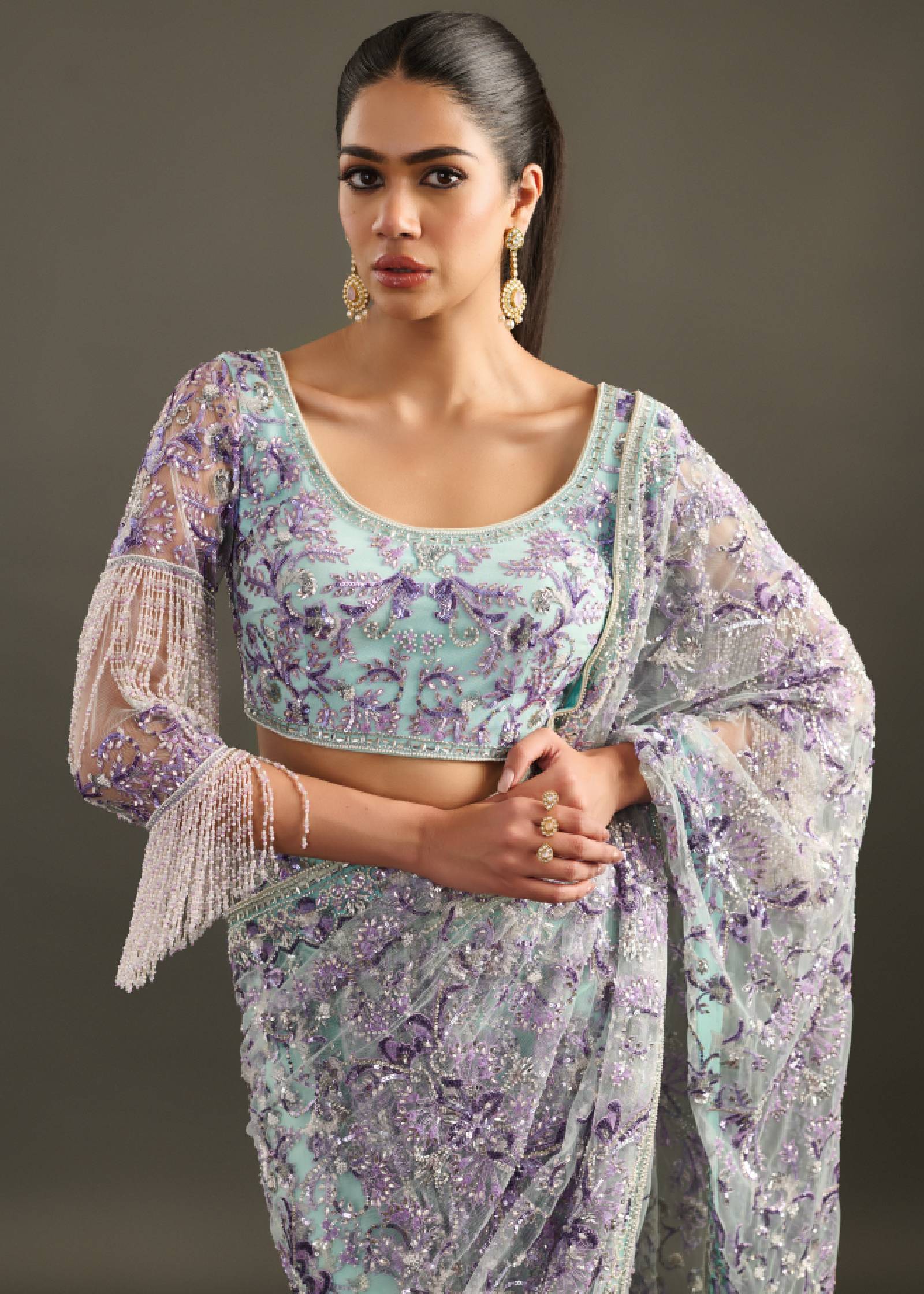 This enchanting piece drapes in a serene mint-aqua base, enveloped in a delicate net featuring whimsical lavender and silver floral sequin artistry. The look is completed by a matching fully-beaded choli with dramatic, fringed bell sleeves. Exuding soft, dreamy elegance, it's perfect for a sophisticated sangeet, reception, or evening event.
